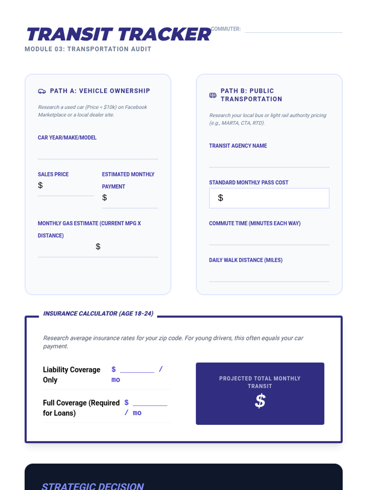 A practical, hands-on lesson designed for working high school seniors to navigate the transition to independent living. Students analyze their current income and projected expenses for housing, food, and transport to build a realistic monthly budget.