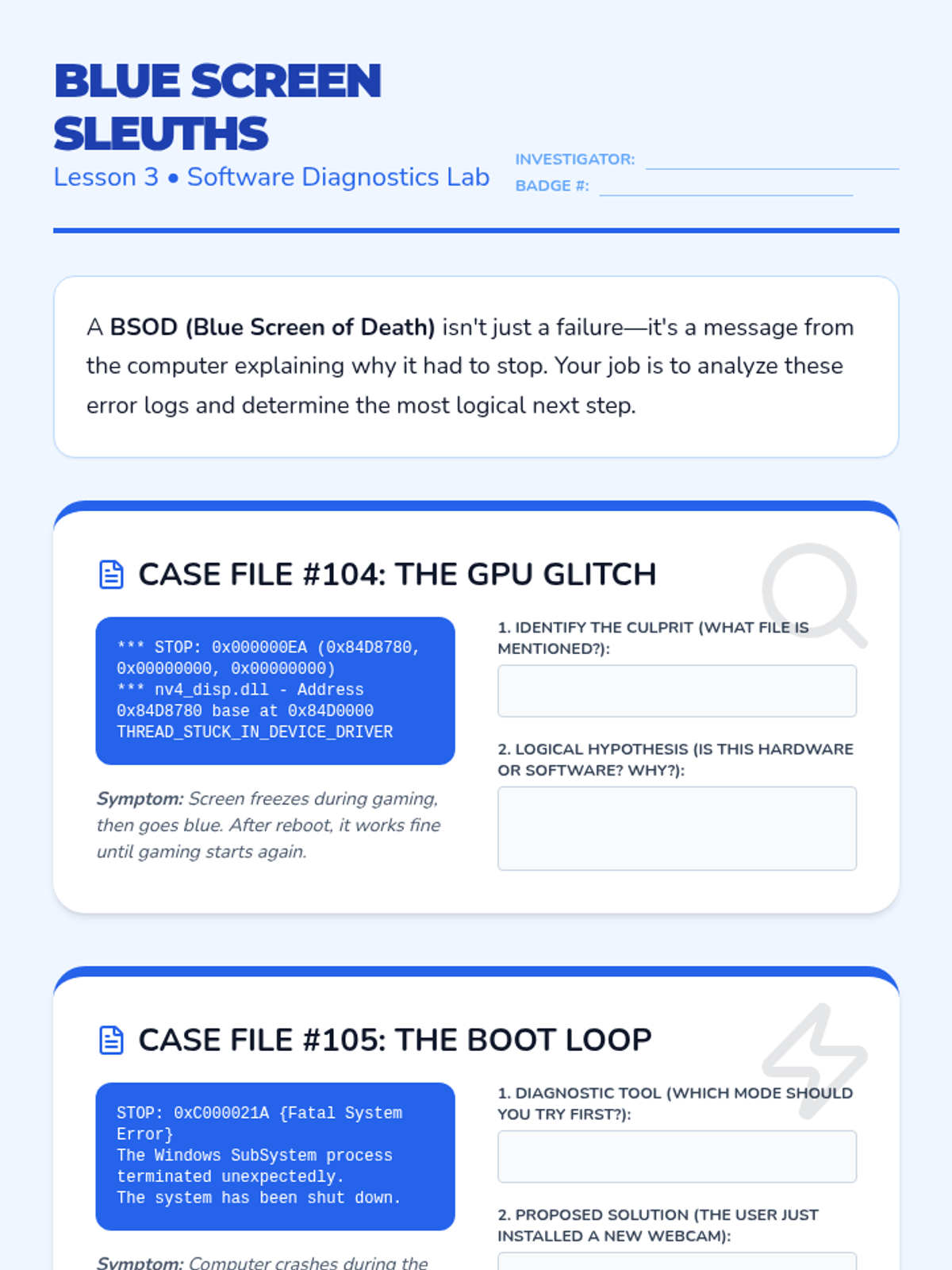 Students explore software-level troubleshooting, including identifying driver conflicts, reading simple system logs, and utilizing Safe Mode. They analyze the infamous 'Blue Screen of Death' to understand how an operating system communicates critical software failures.
