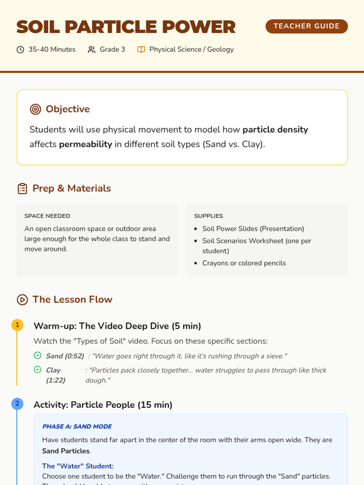 In this kinesthetic science lesson, 3rd-grade students model soil permeability by physically acting as particles. They compare sand and clay to understand how particle size and density affect water drainage and plant health.
