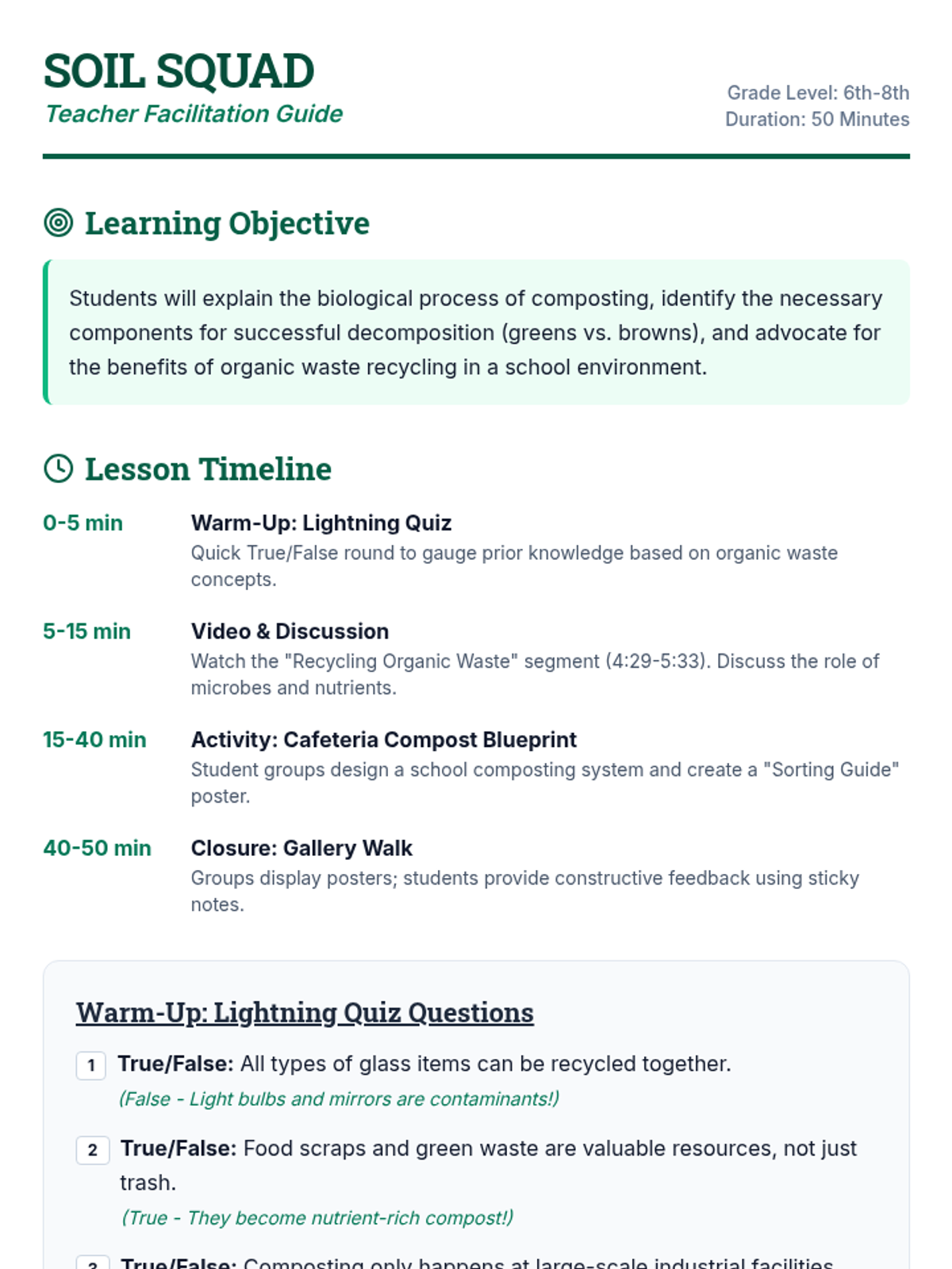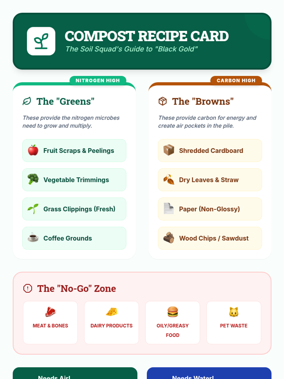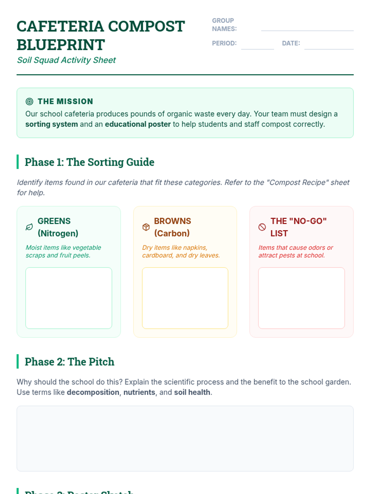 Students will investigate the biological process of composting, learn to distinguish between 'green' and 'brown' organic waste, and design a functional composting system for their school cafeteria.