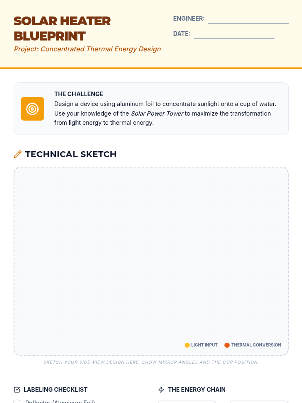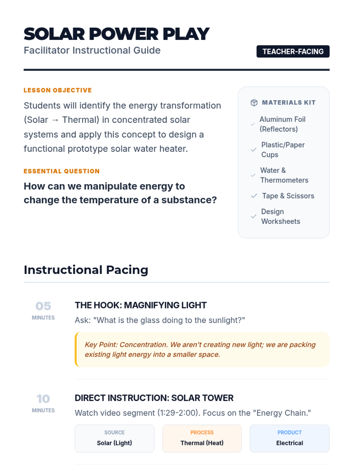 Students explore energy transformation by studying concentrated solar power plants and designing their own solar water heaters. The lesson focuses on the conversion of light energy to thermal energy and the molecular nature of heat.