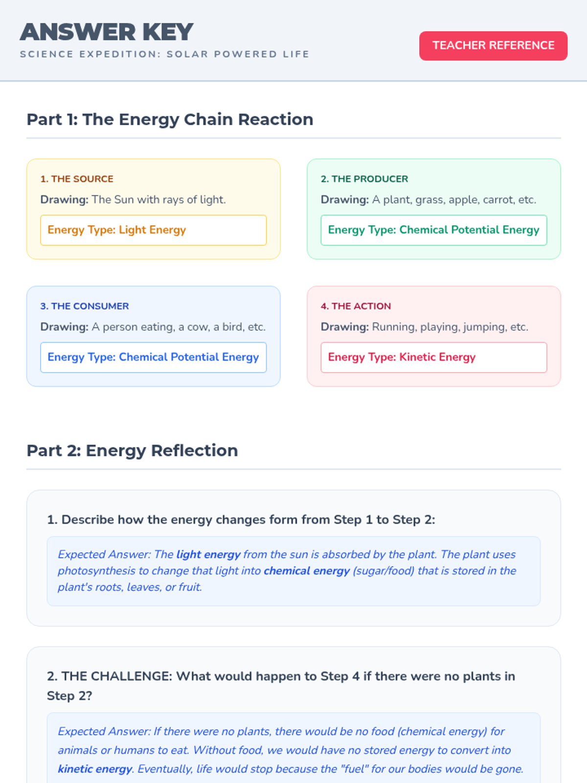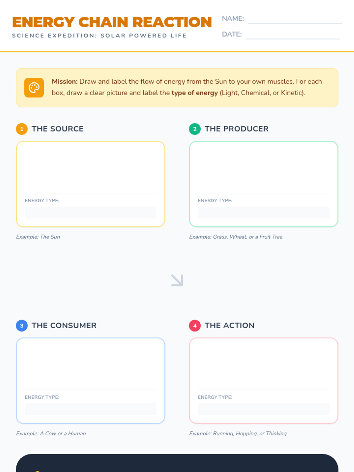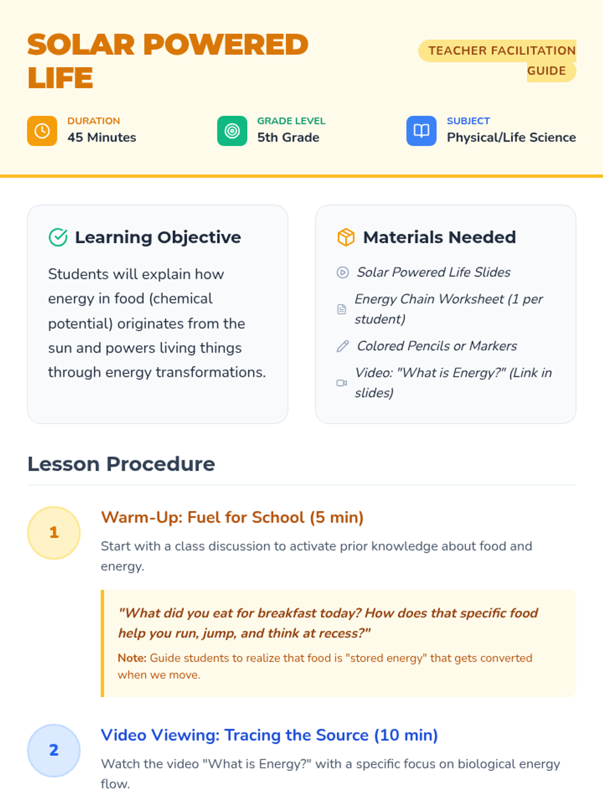 A 5th-grade science lesson exploring the path of energy from the sun to food and eventually to physical movement, featuring a video analysis and a creative flowchart activity.