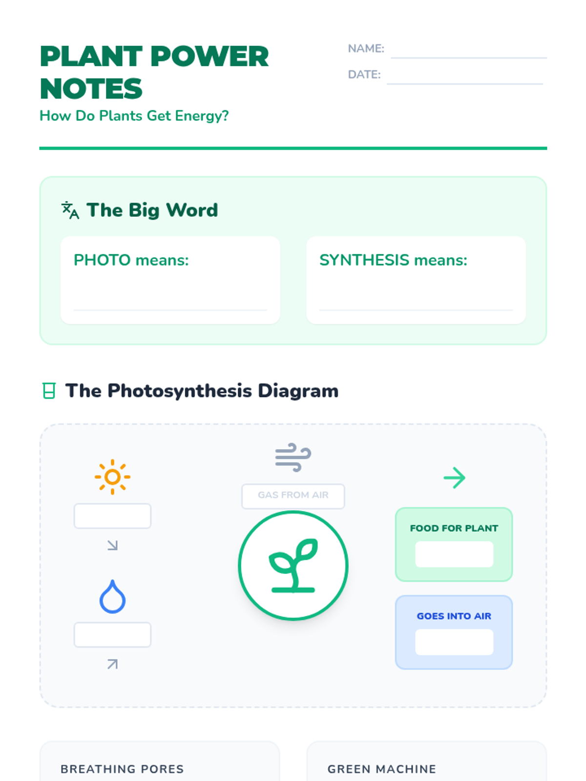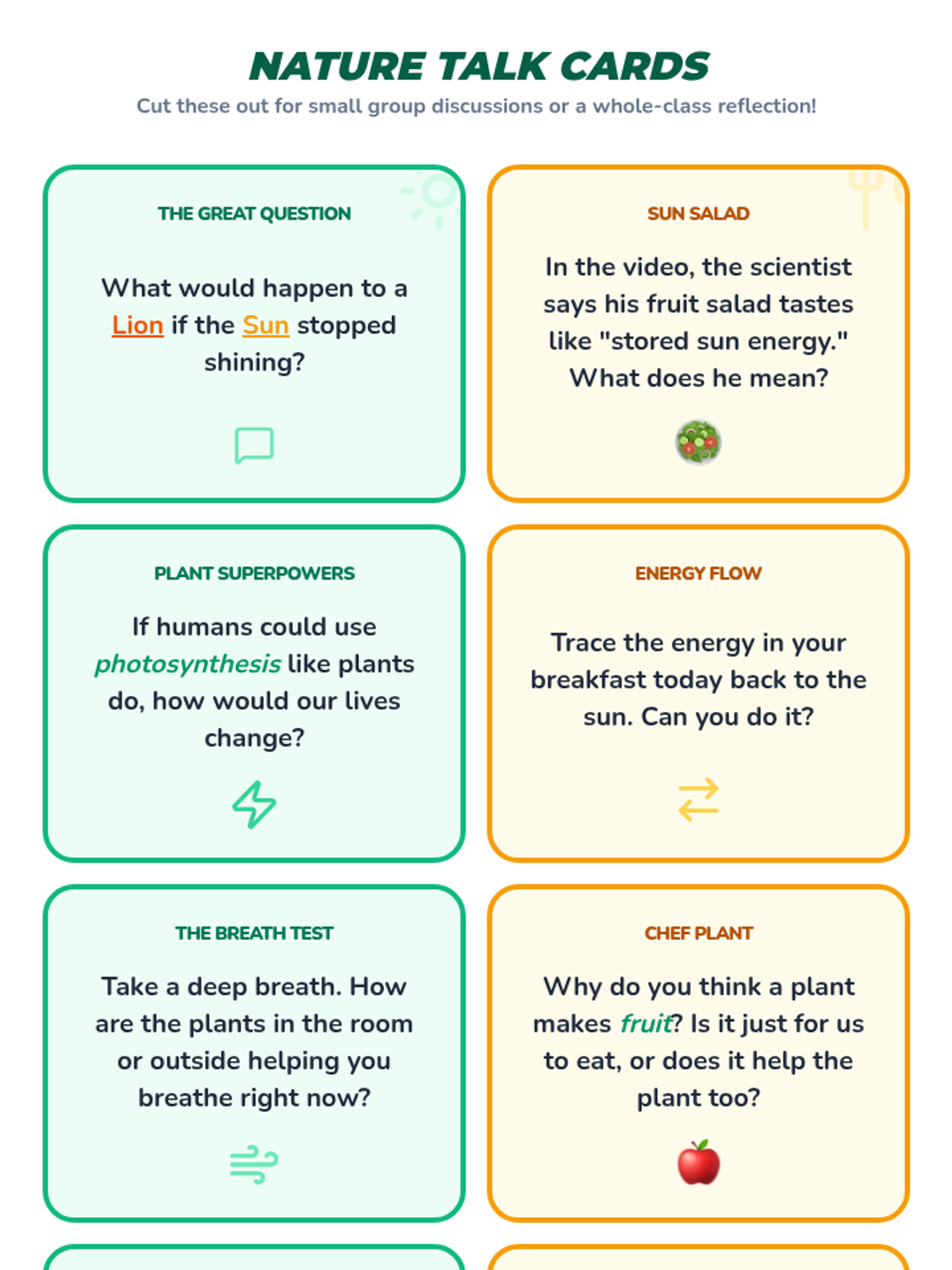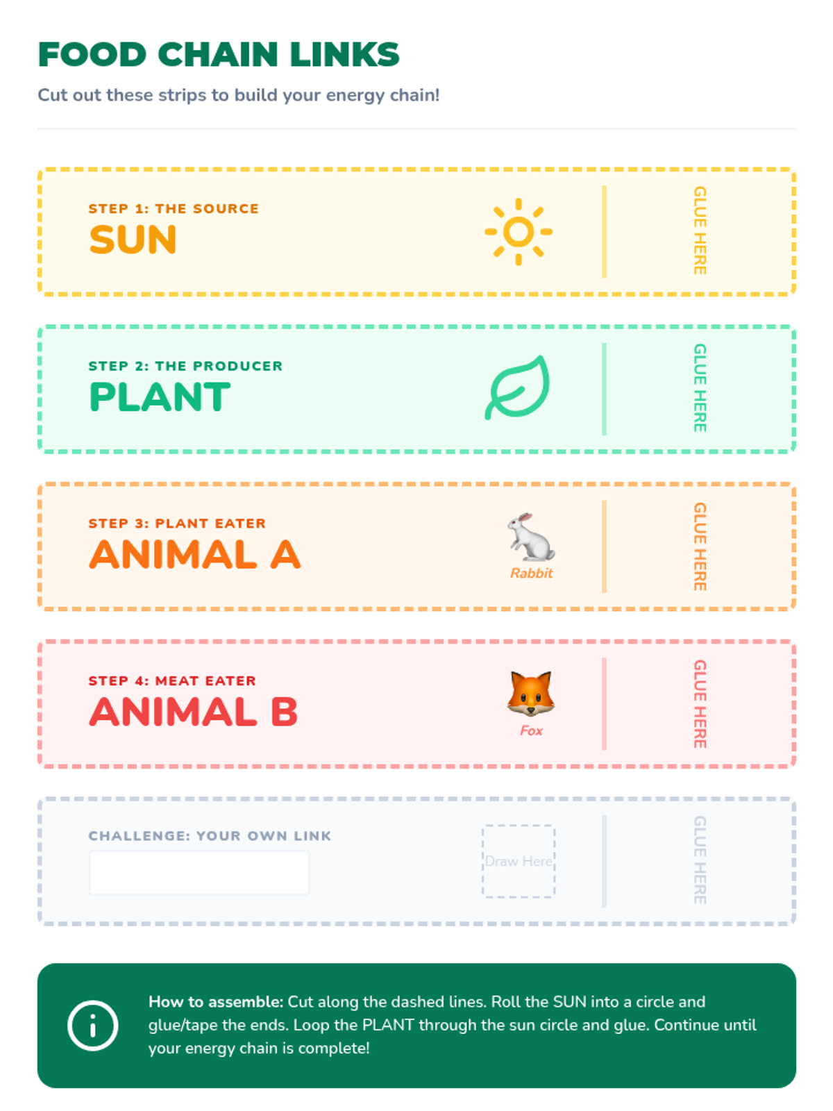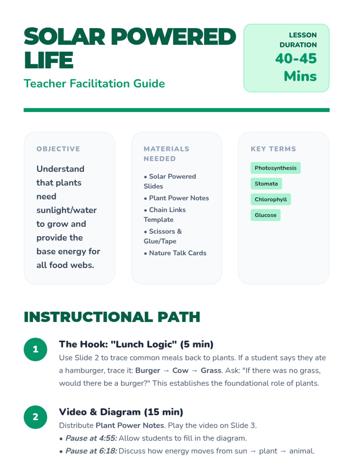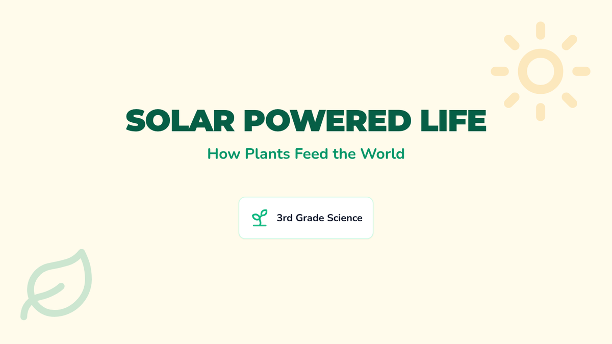 Students discover how plants transform sunlight and water into energy through photosynthesis and how this energy supports all life in a food chain. The lesson features a hands-on 'Food Chain Links' activity and a deep-dive video analysis.