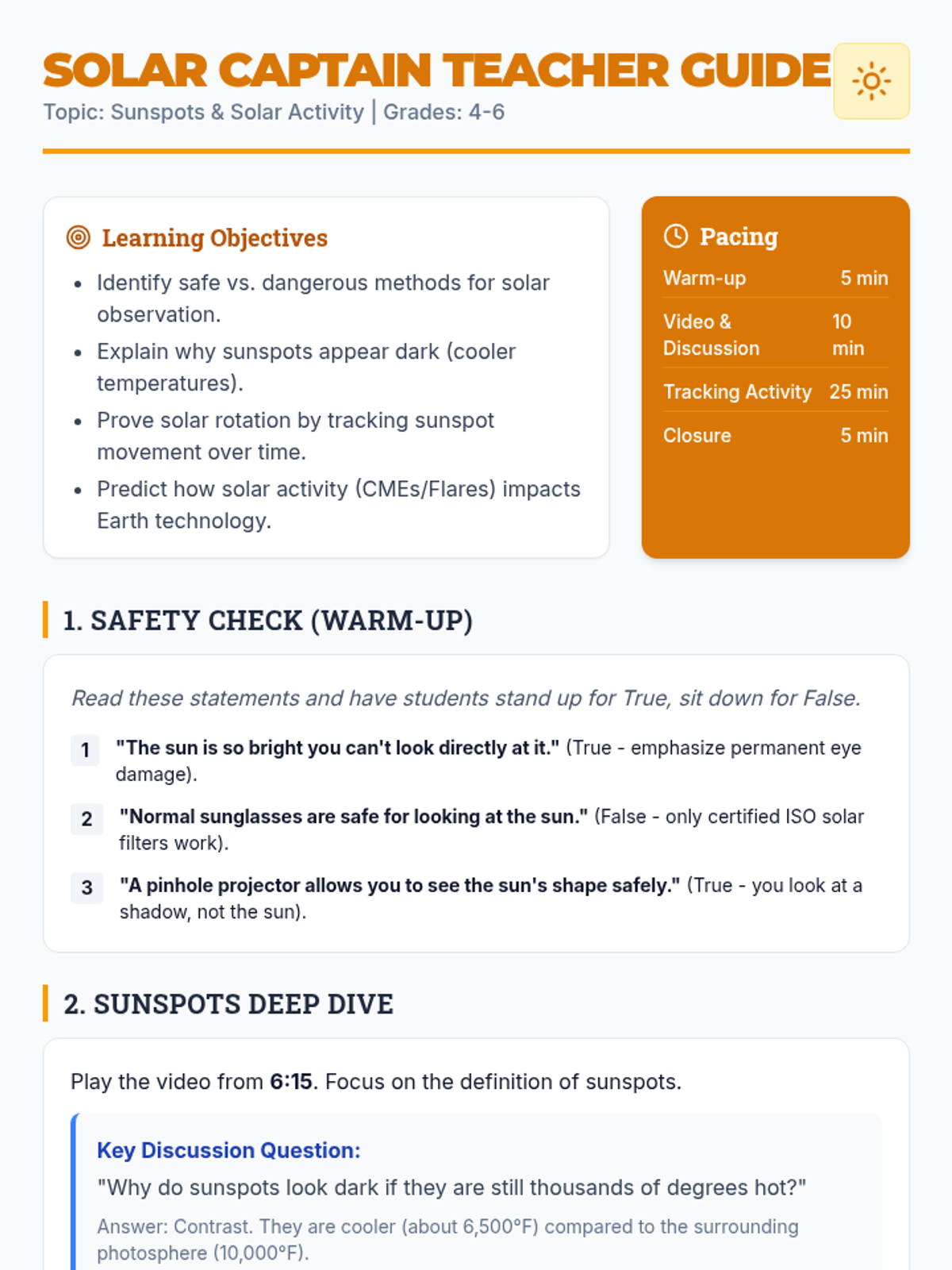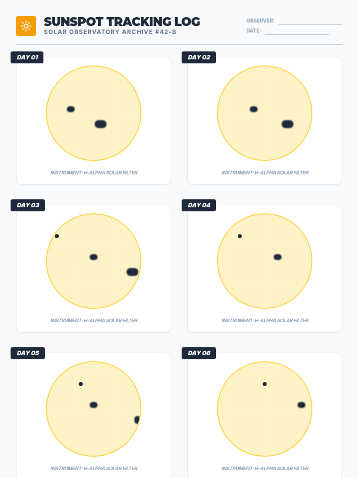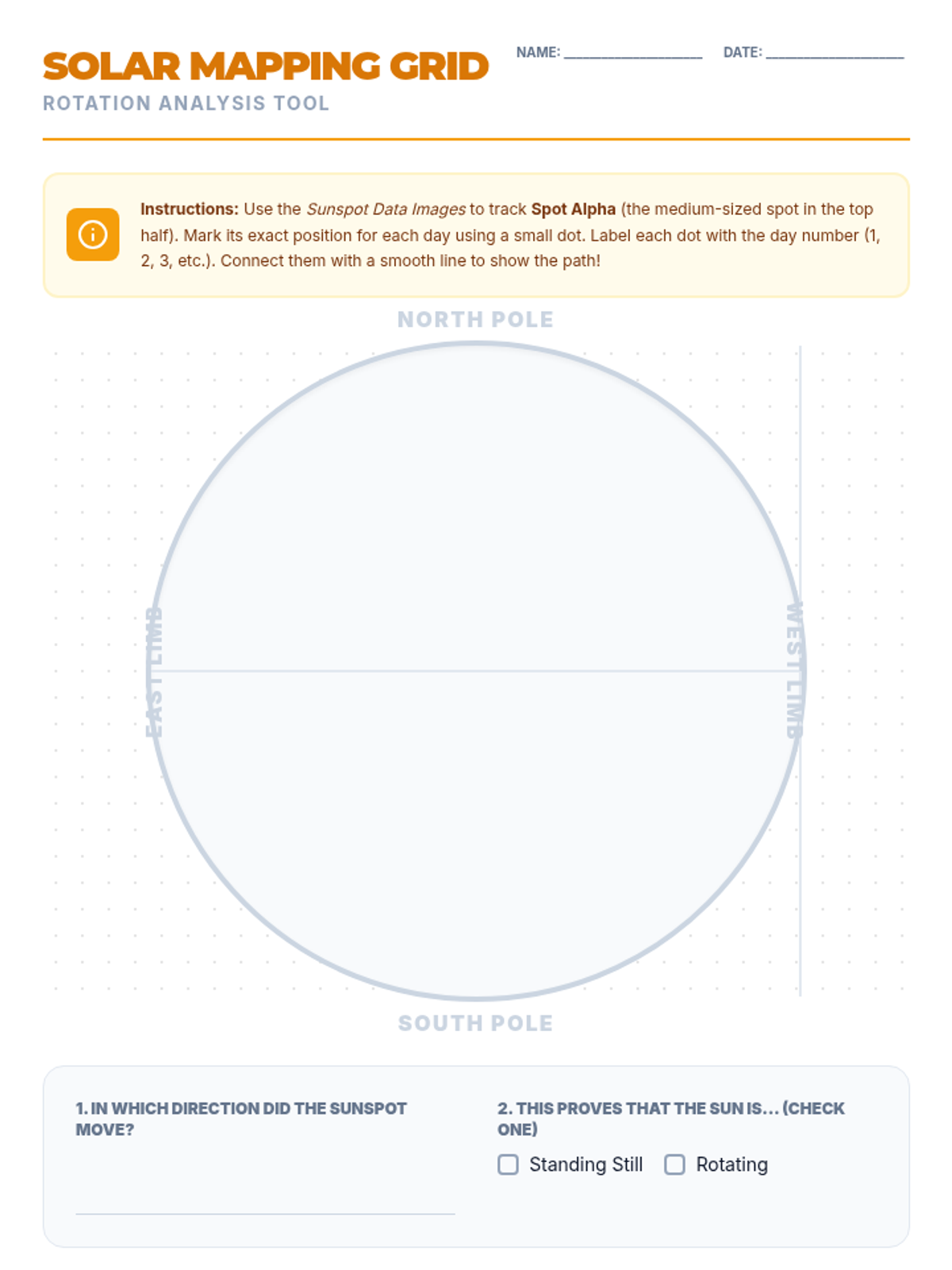 A hands-on astronomy lesson where students investigate sunspots to understand solar activity and prove the Sun's rotation. Includes a safe-viewing warm-up and a mapping activity using historical-style data.