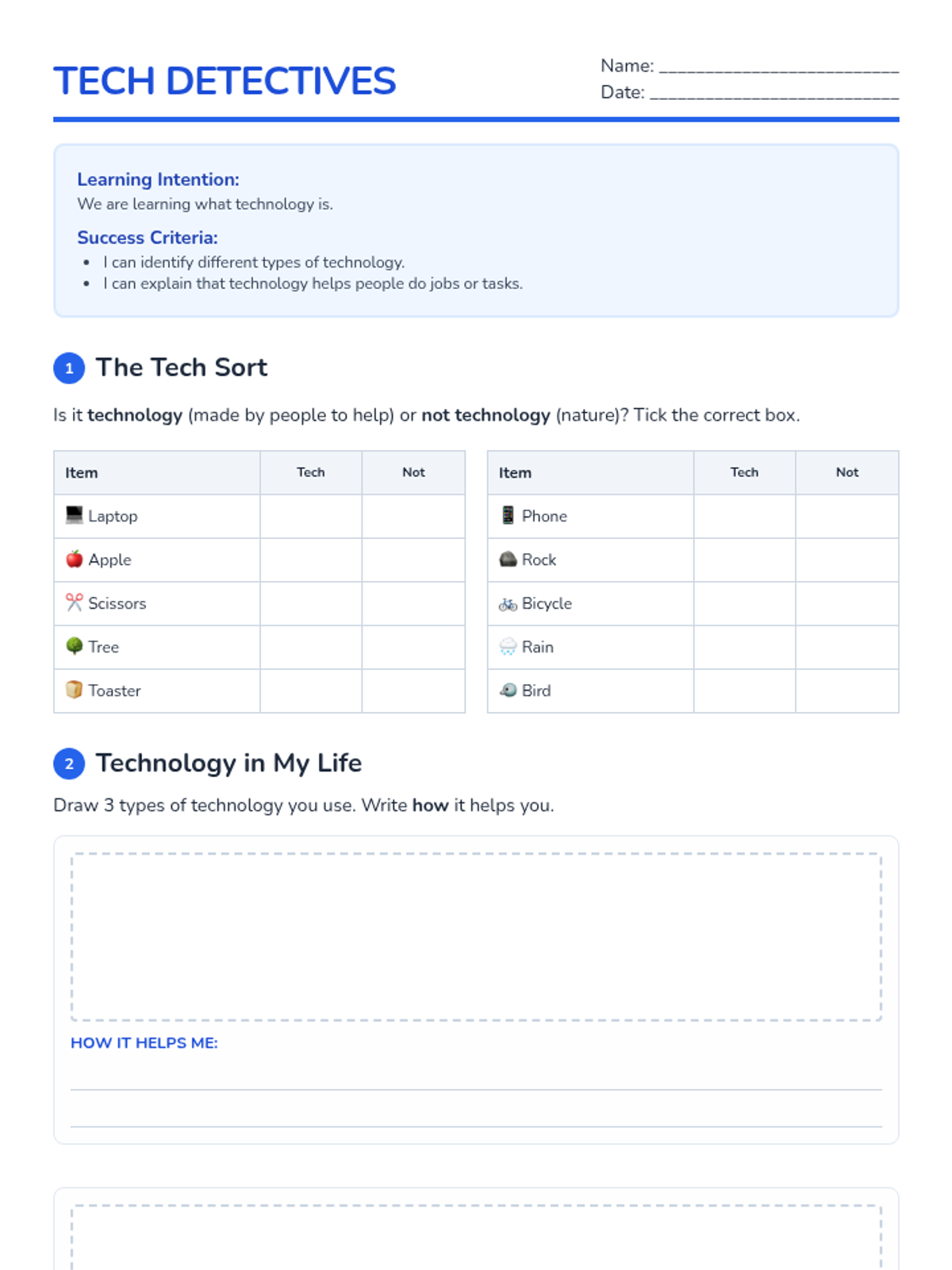 A primary lesson introducing the concept of technology as tools that help people perform tasks, featuring sorting activities and creative drawing.