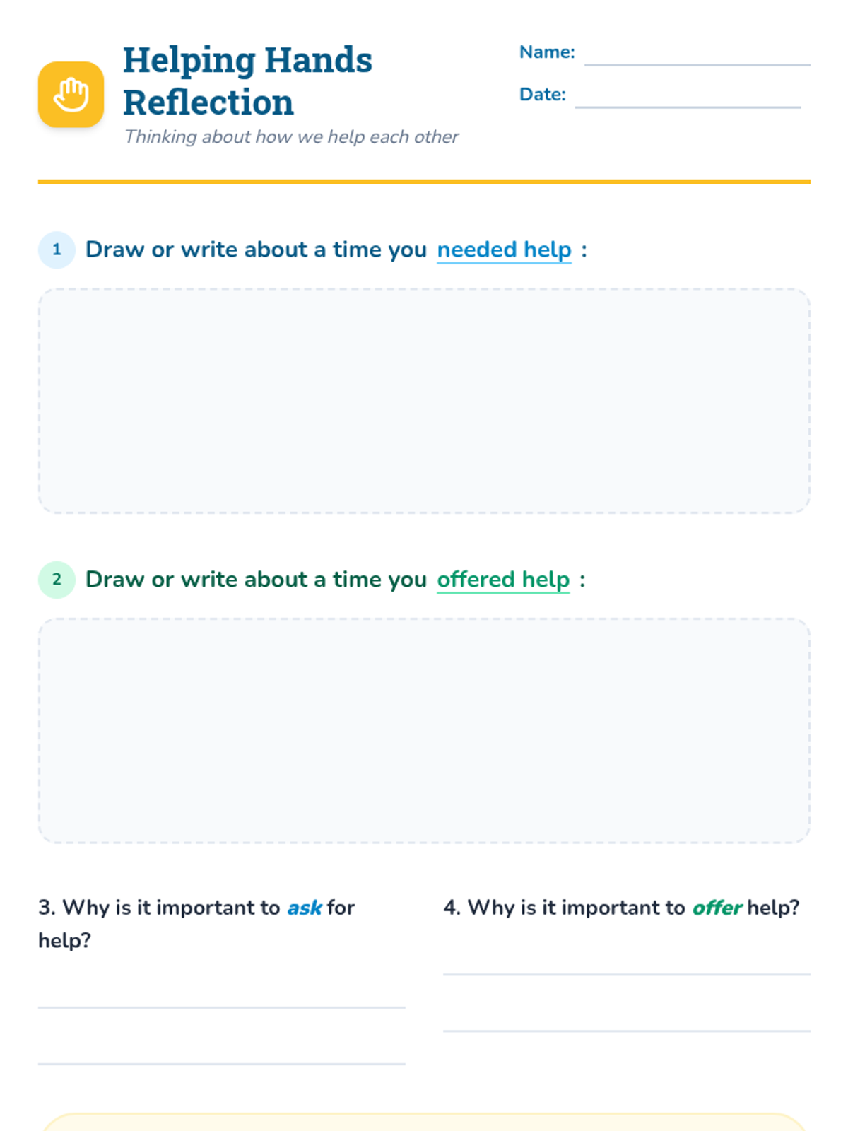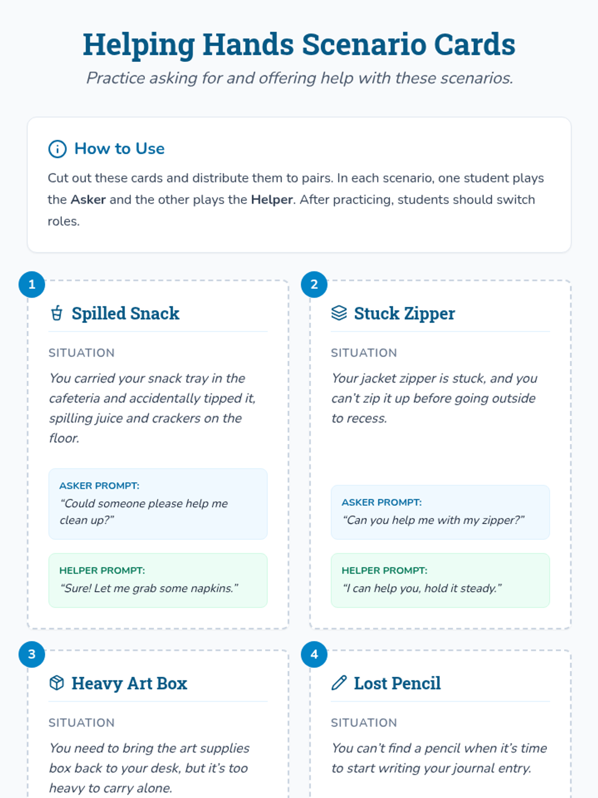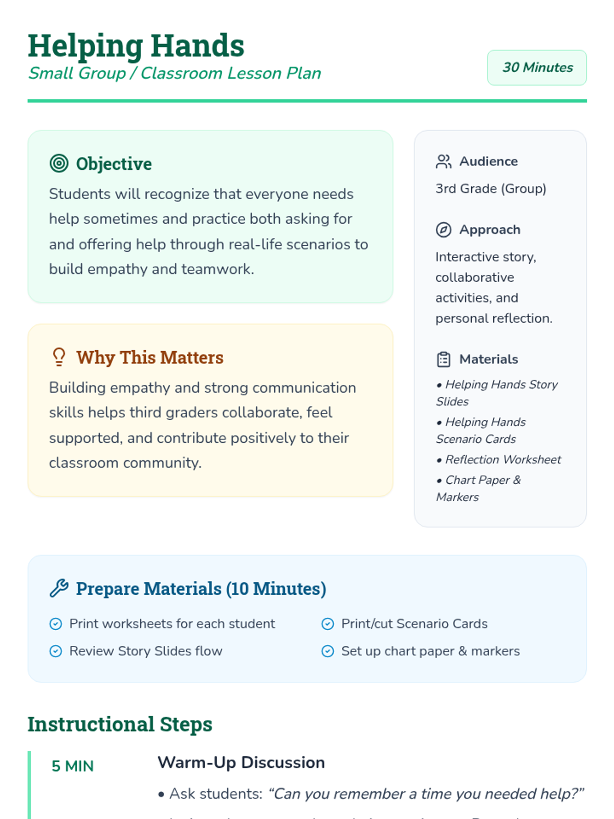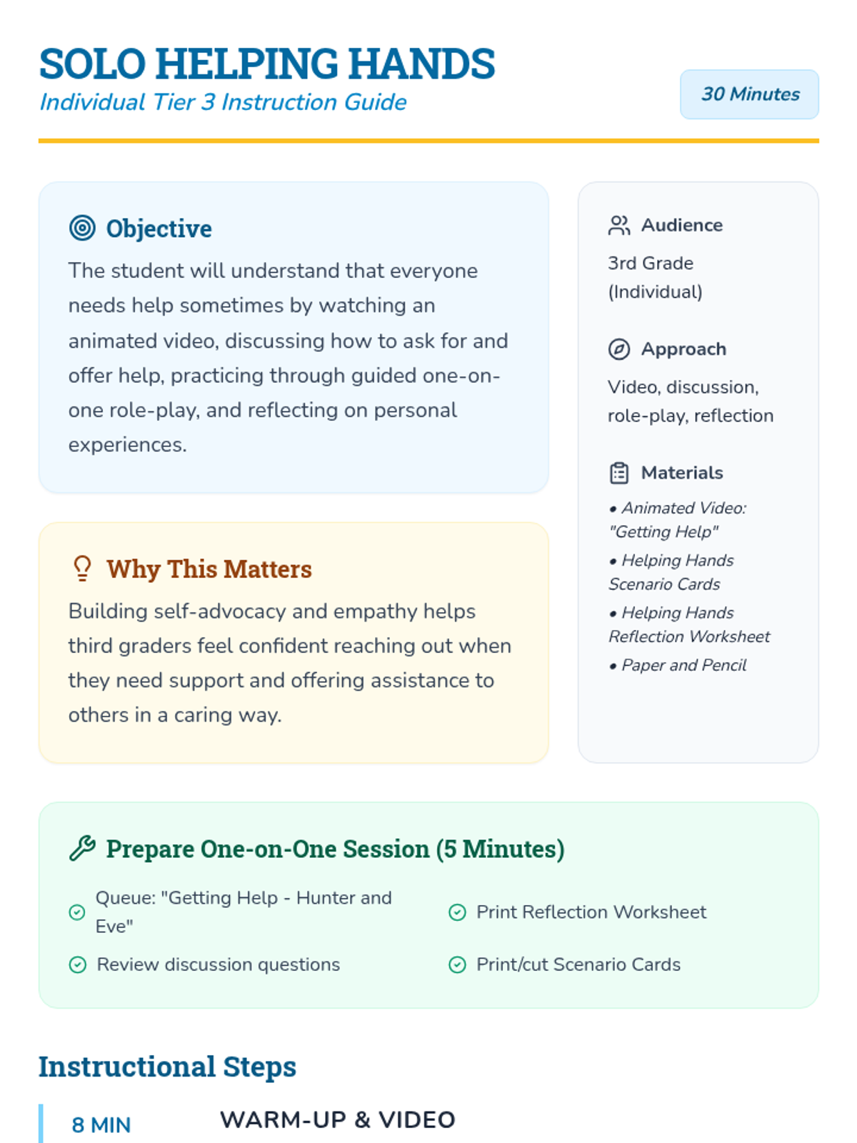 A 30-minute one-on-one or small group lesson focused on teaching 3rd graders how to recognize when they need help, how to ask for it politely, and how to offer help to others. This Tier 3 session builds self-advocacy and empathy through storytelling, role-play, and personal reflection.
