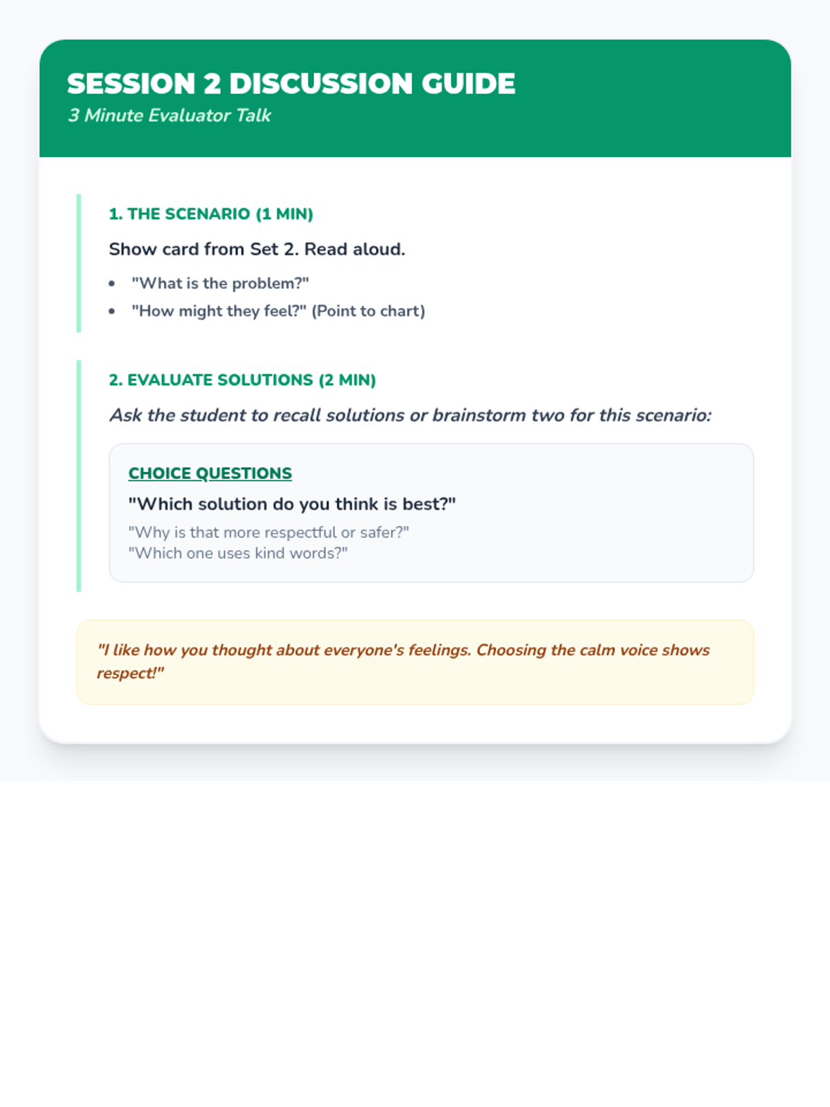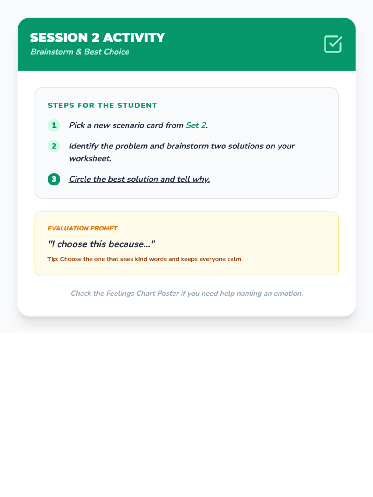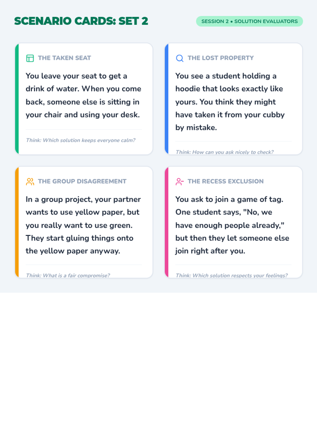Focuses on evaluating brainstormed solutions to choose the one that best respects feelings and maintains safety. Students build on their identification skills from Session 1.