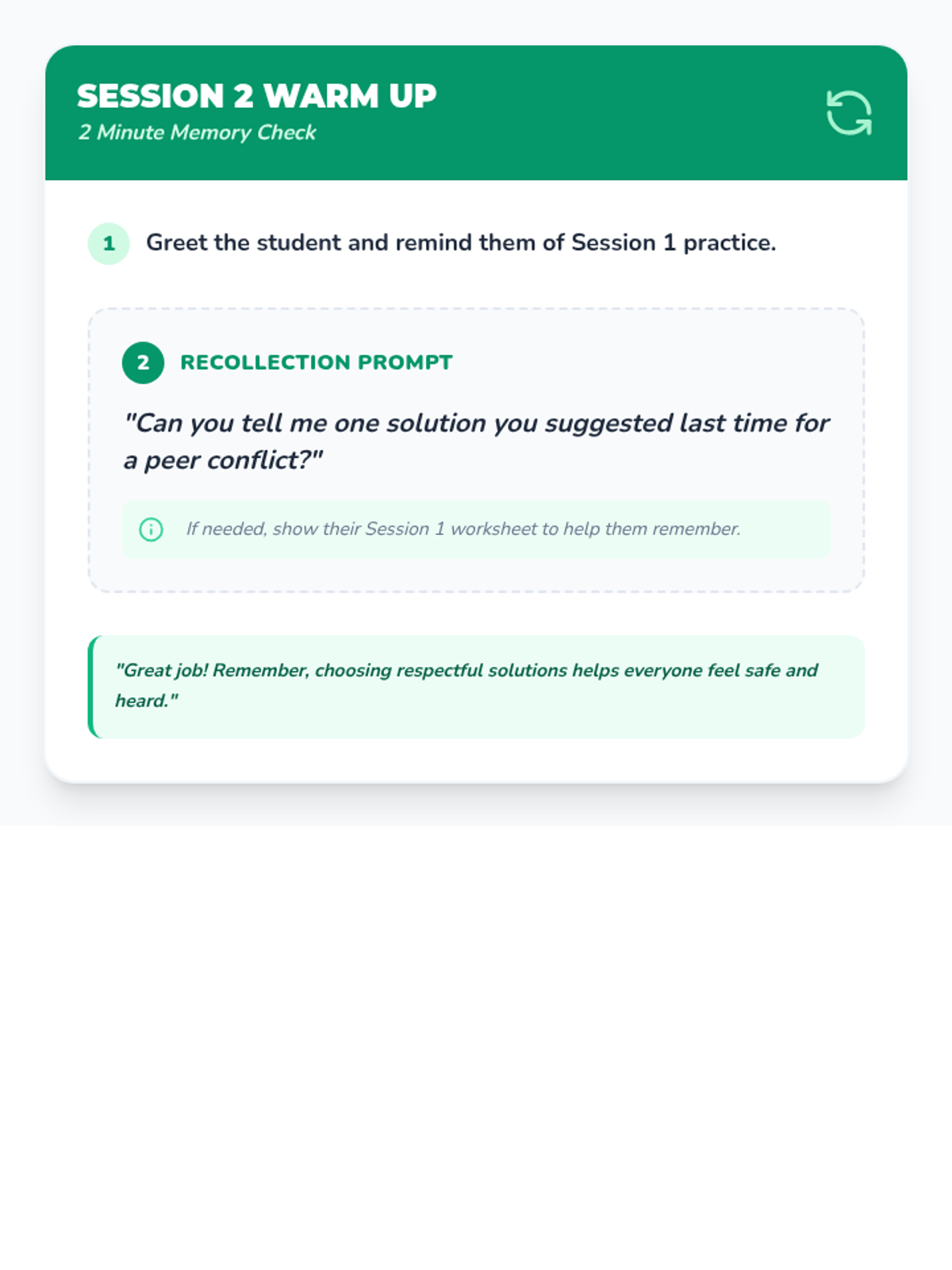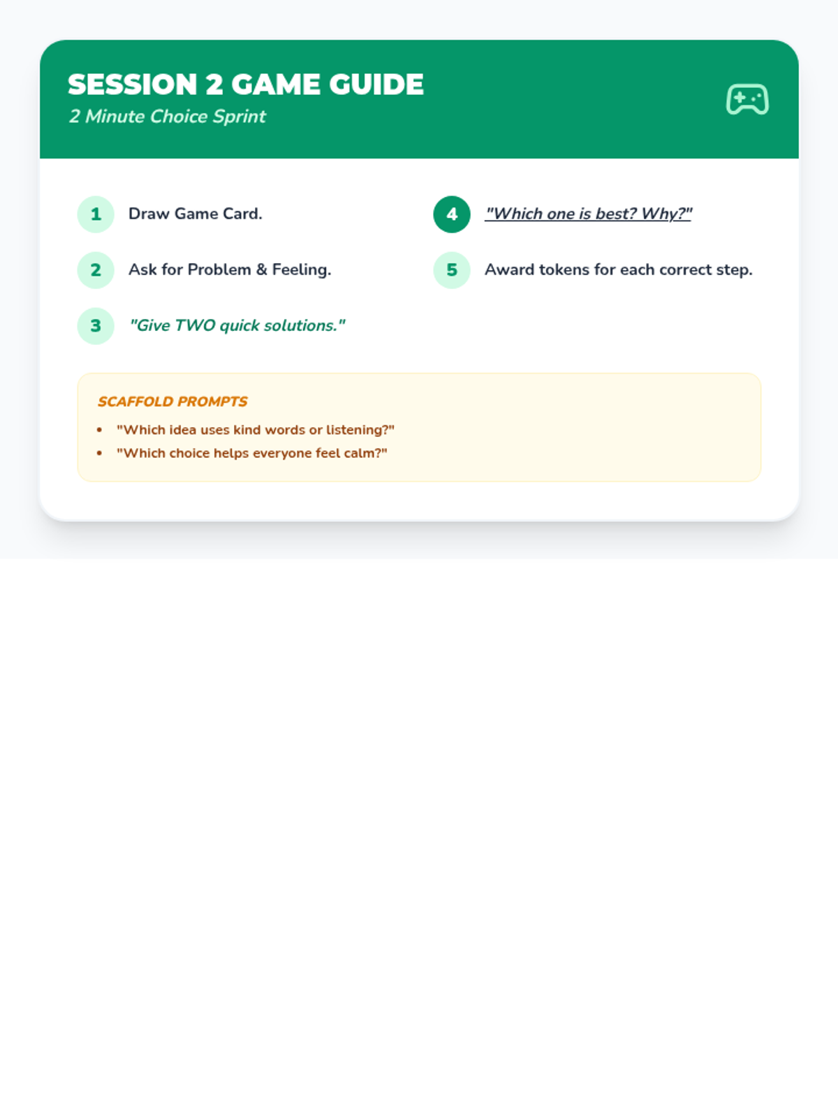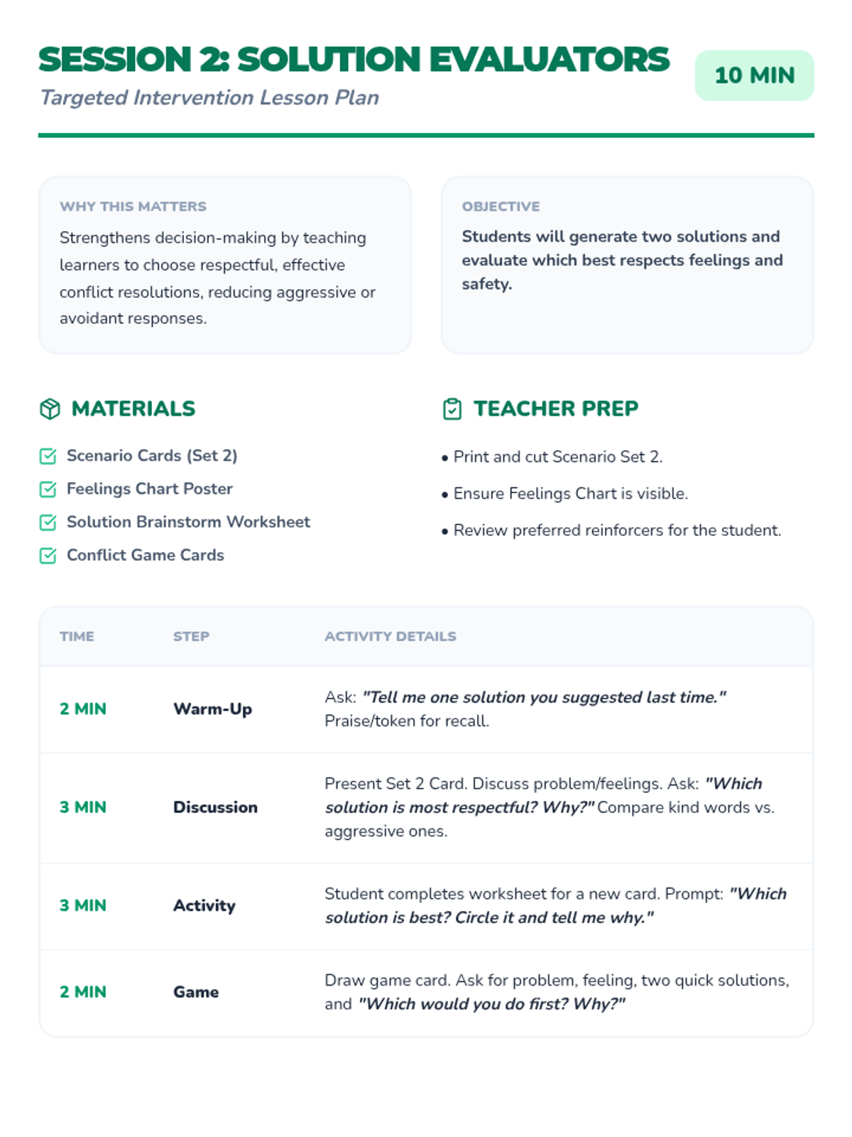 Focuses on evaluating brainstormed solutions to choose the one that best respects feelings and maintains safety. Students build on their identification skills from Session 1.