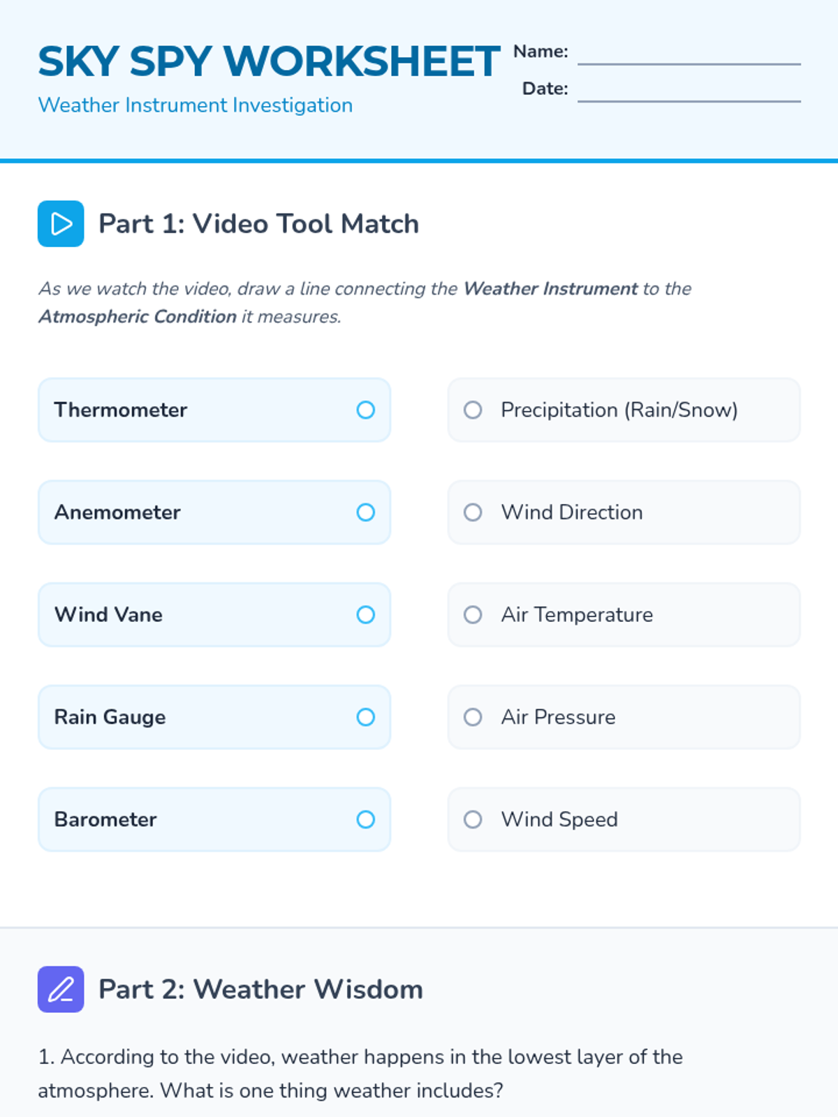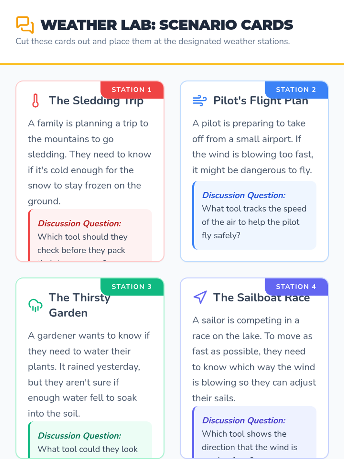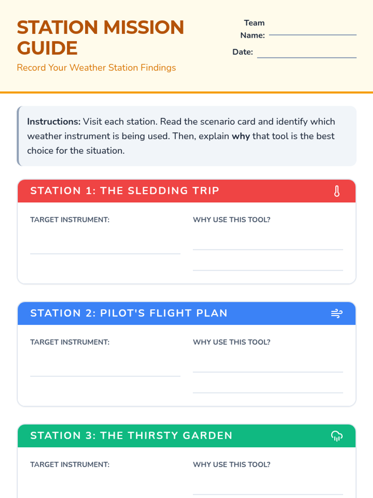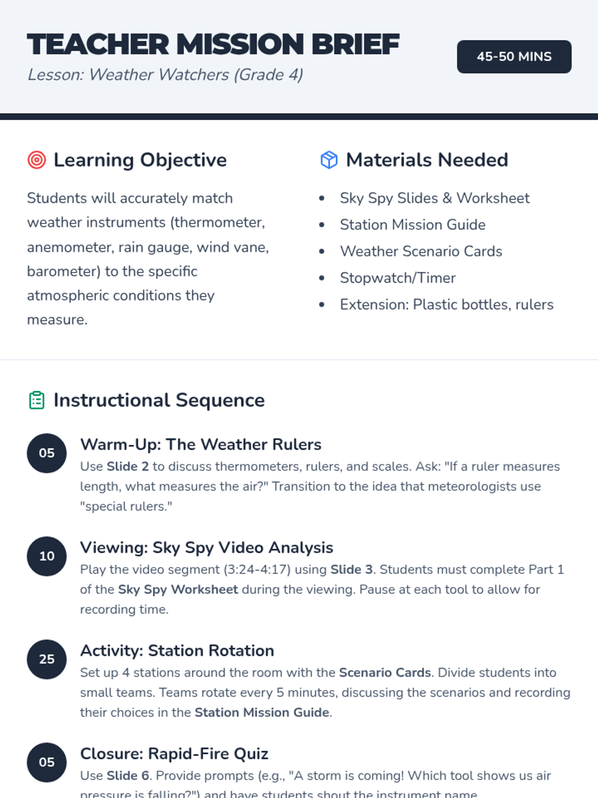 A hands-on lesson for 4th graders to identify and use weather instruments like thermometers, anemometers, and rain gauges through video analysis and station-based scenario solving.