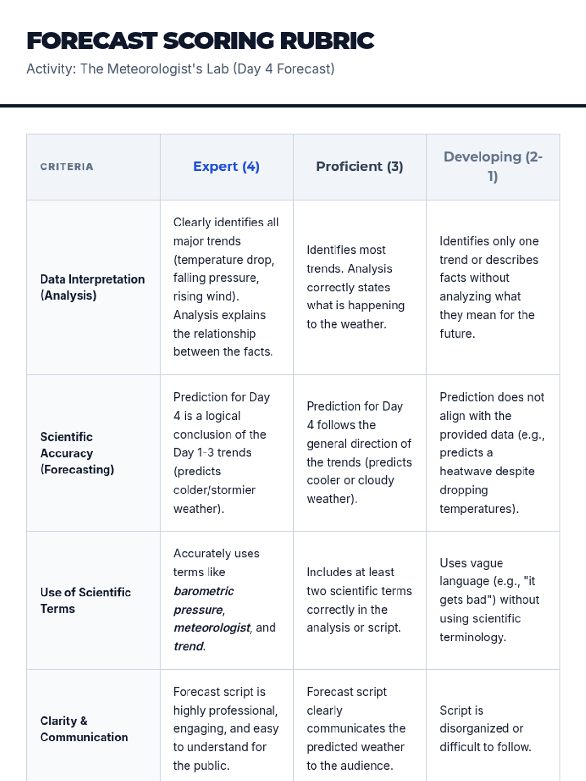 Students learn to distinguish between weather data collection and its interpretation. They will analyze a 3-day data set from a fictional city to predict Day 4 weather, acting as meteorologists.