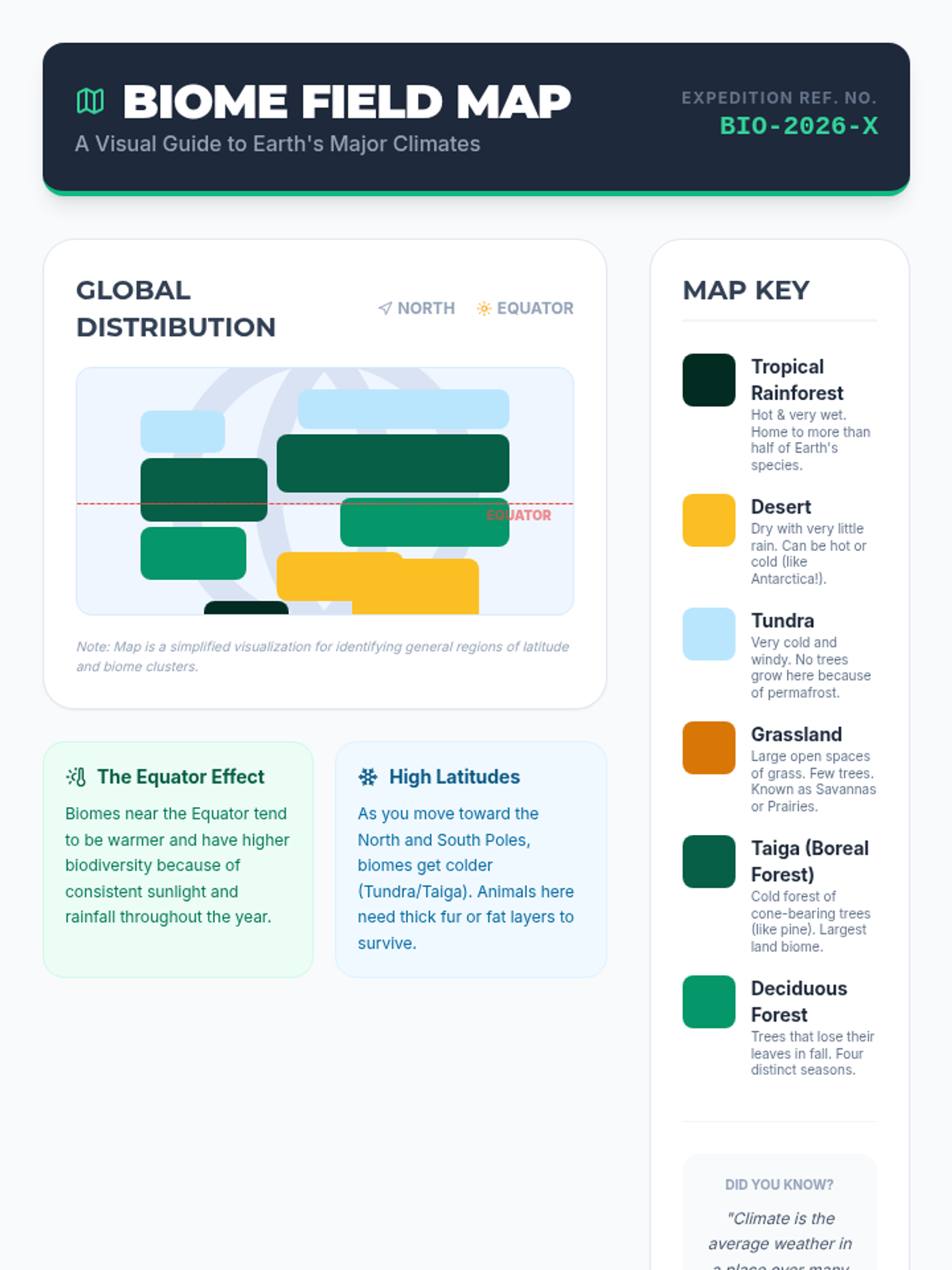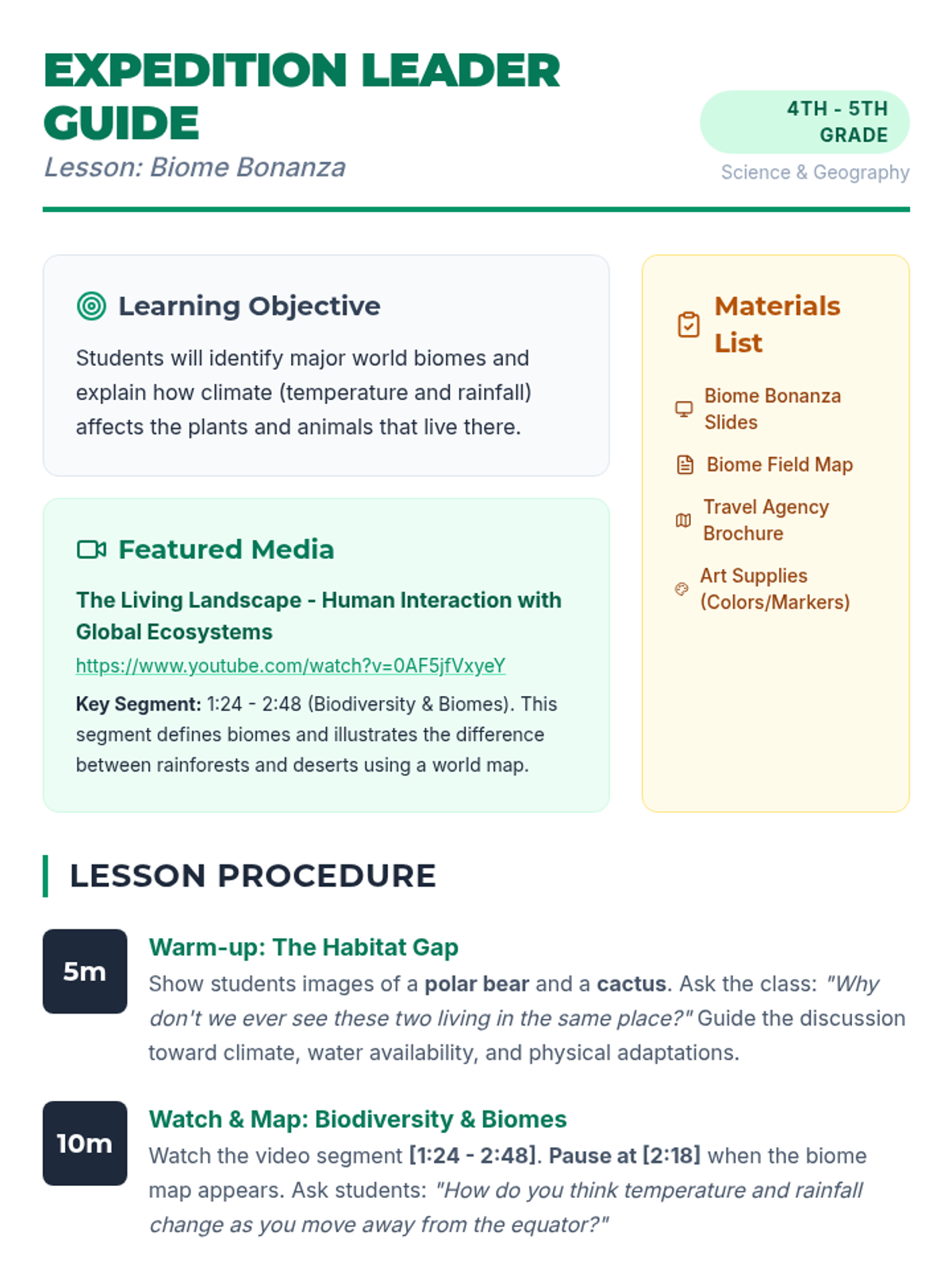 Students explore Earth's major biomes, investigating how climate shapes the lives of plants and animals. They'll use a world biome map and a featured video to understand global biodiversity before creating a travel brochure for a specific biome.