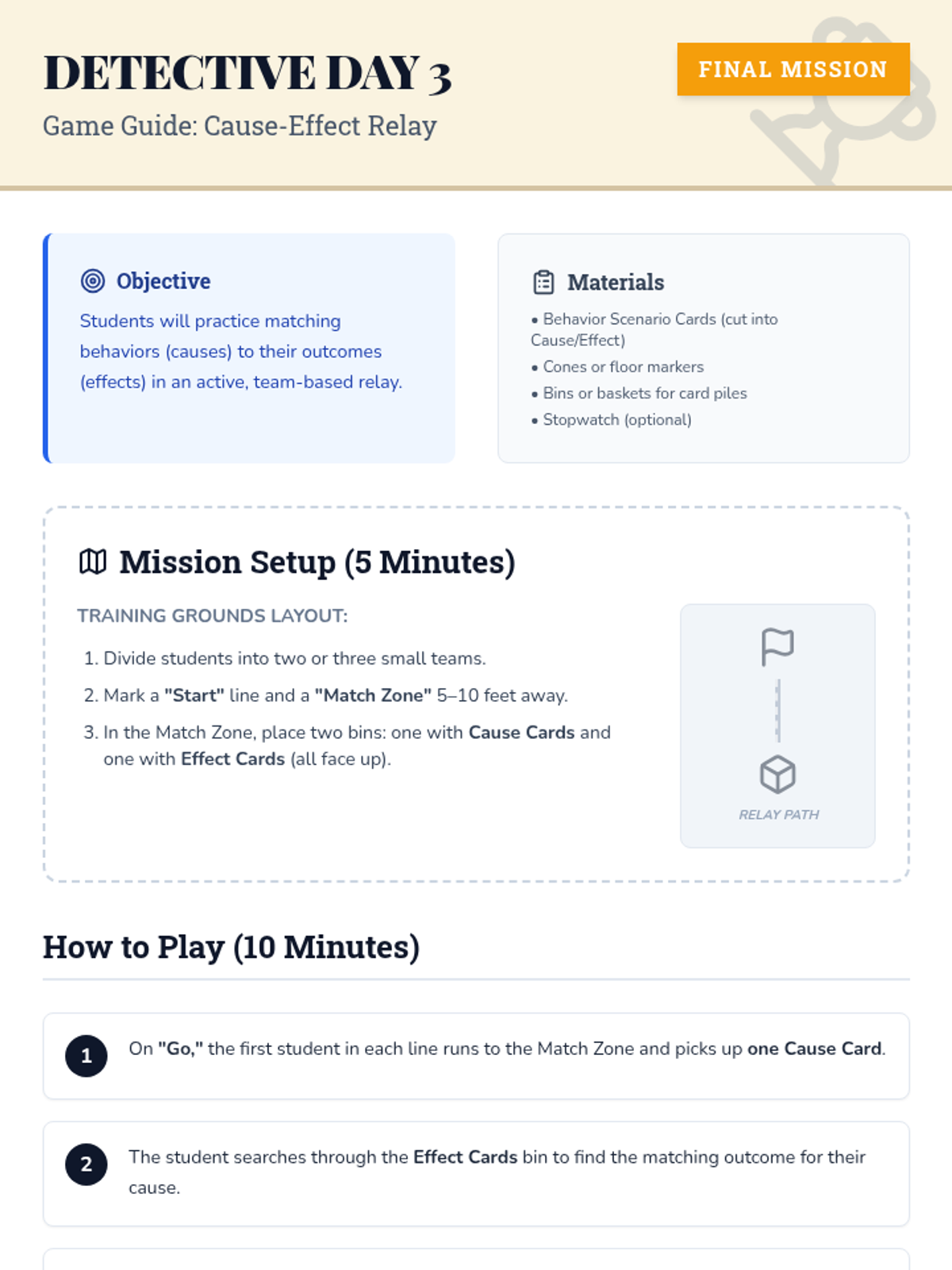 The final session reinforces learning through an active relay game. Students work in teams to match behavior causes with their corresponding effects, culminating in a reflection on their detective skills.
