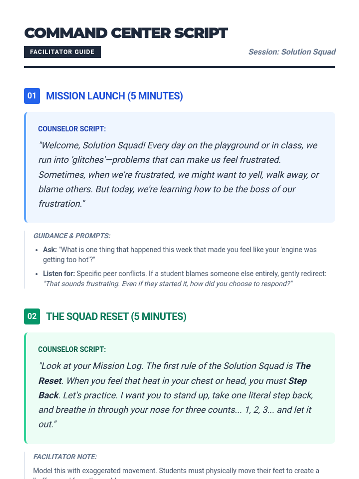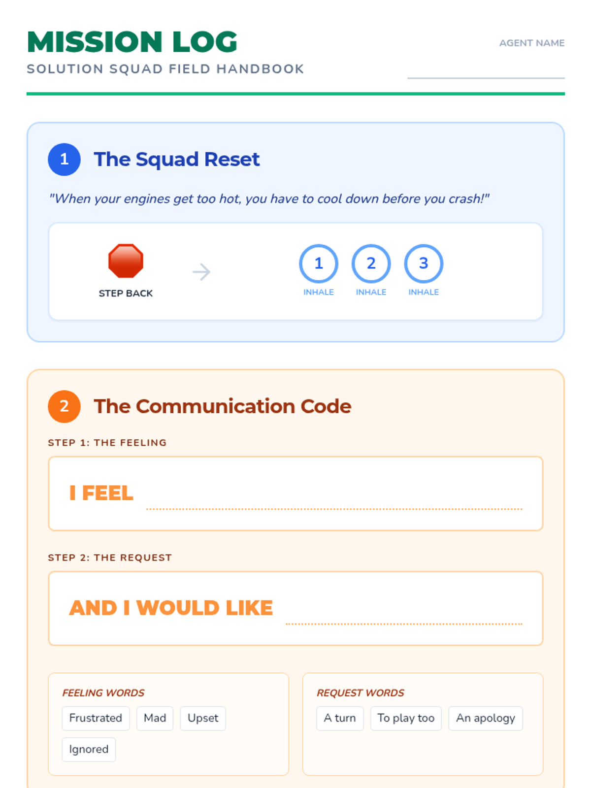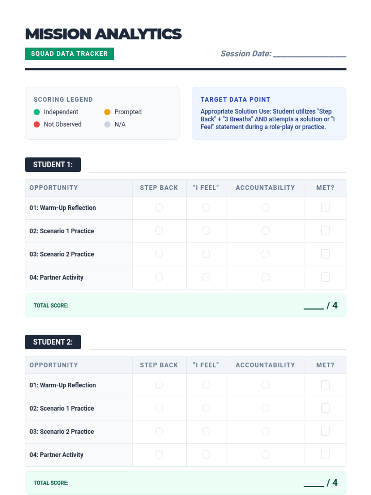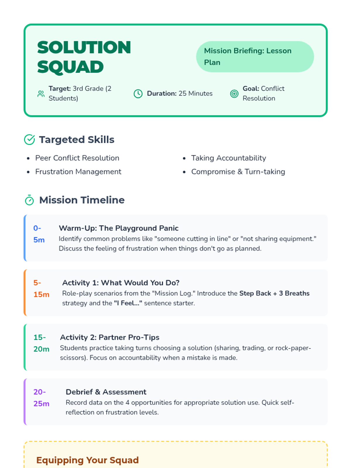 A 25-minute social-emotional learning session focused on peer conflict resolution, frustration management, and the 'I Feel' sentence starter for 3rd-grade students. This lesson uses role-play and partner practice to build accountability and problem-solving skills.