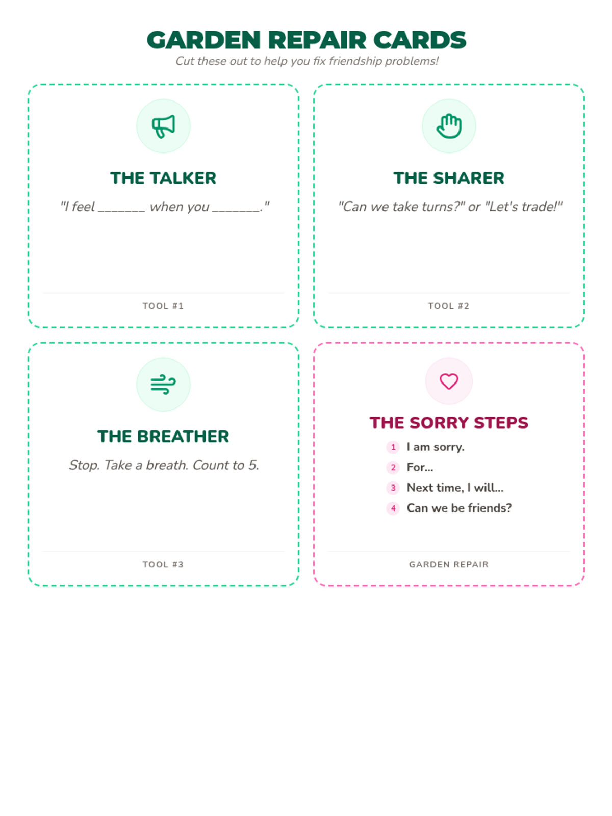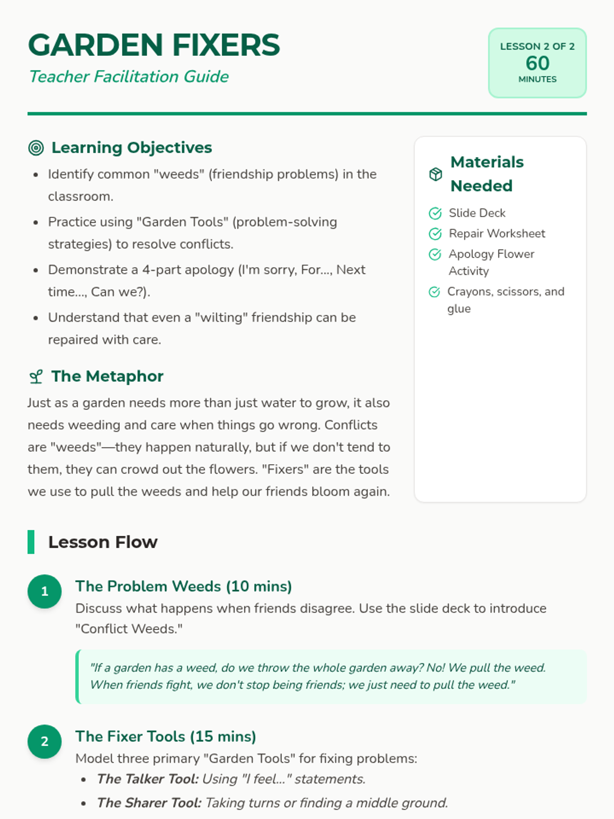 A follow-up Kindergarten lesson focused on conflict resolution and problem-solving, teaching students how to 'fix' friendship problems like they would fix a garden.
