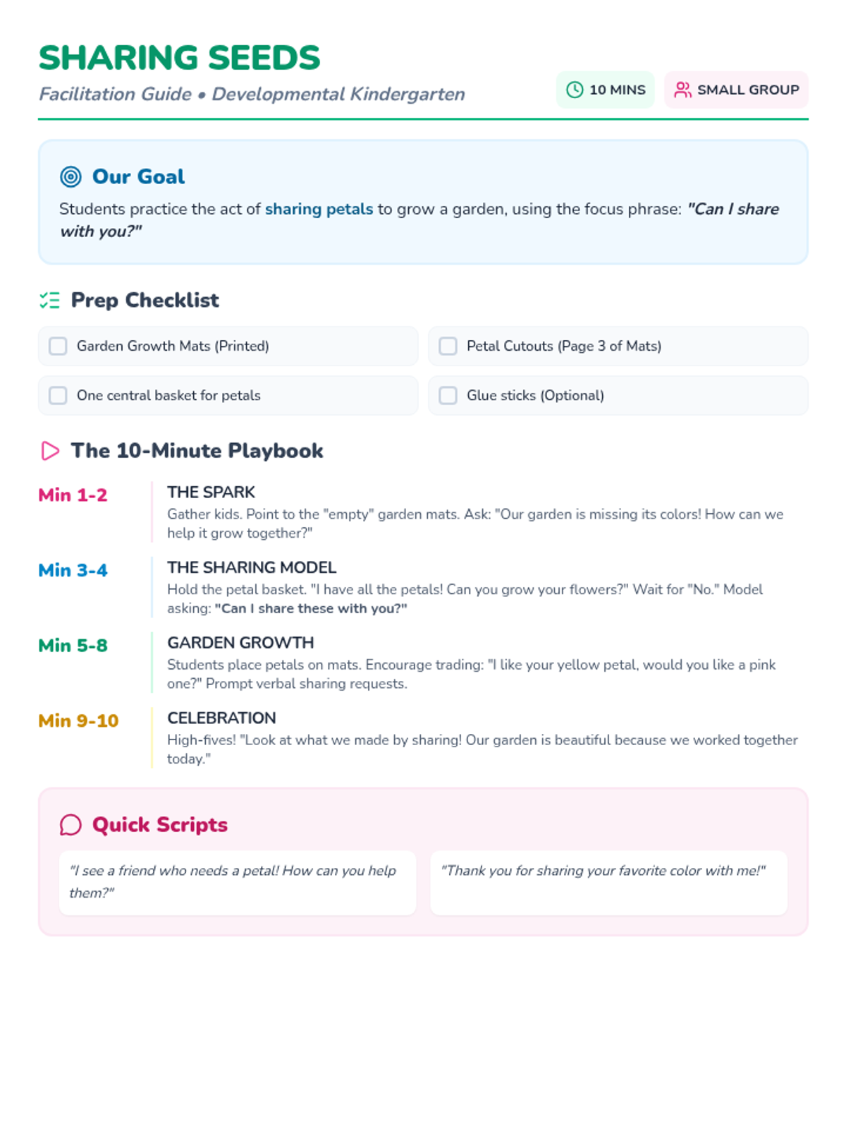 A 10-minute spring-themed lesson for developmental kindergartners focusing on sharing through a collaborative garden-building activity.