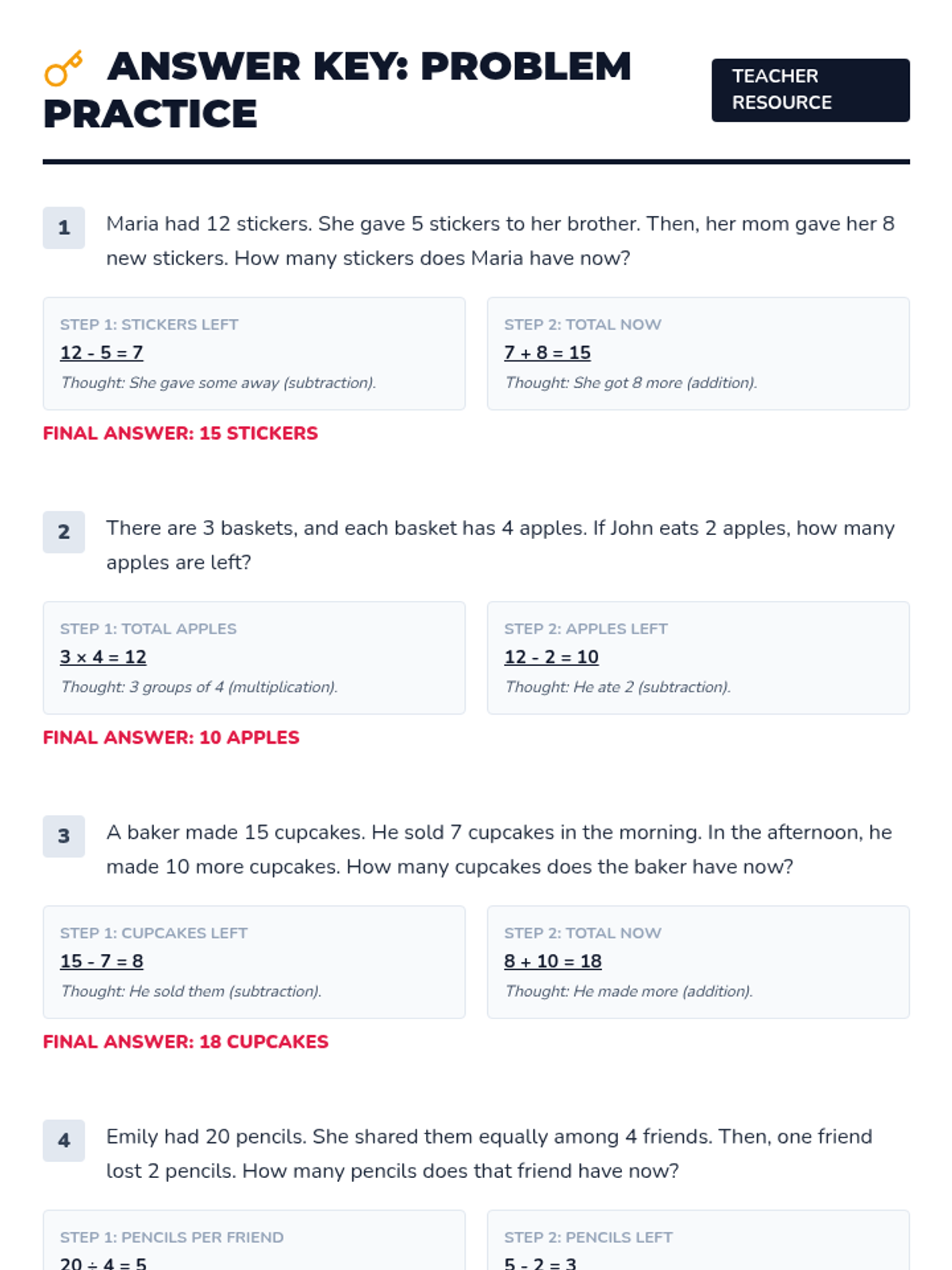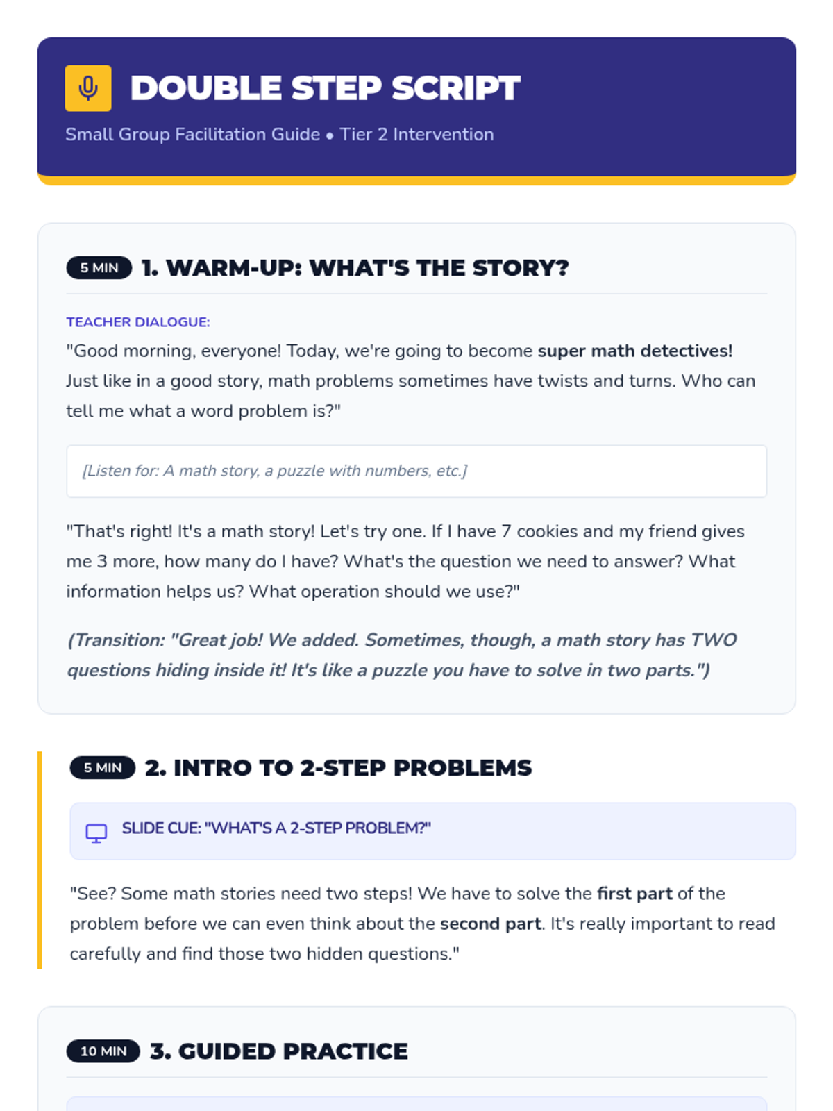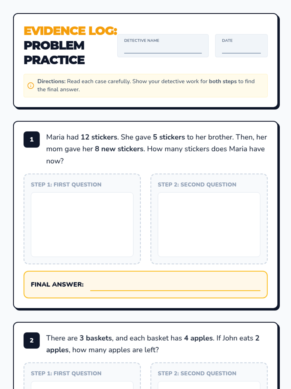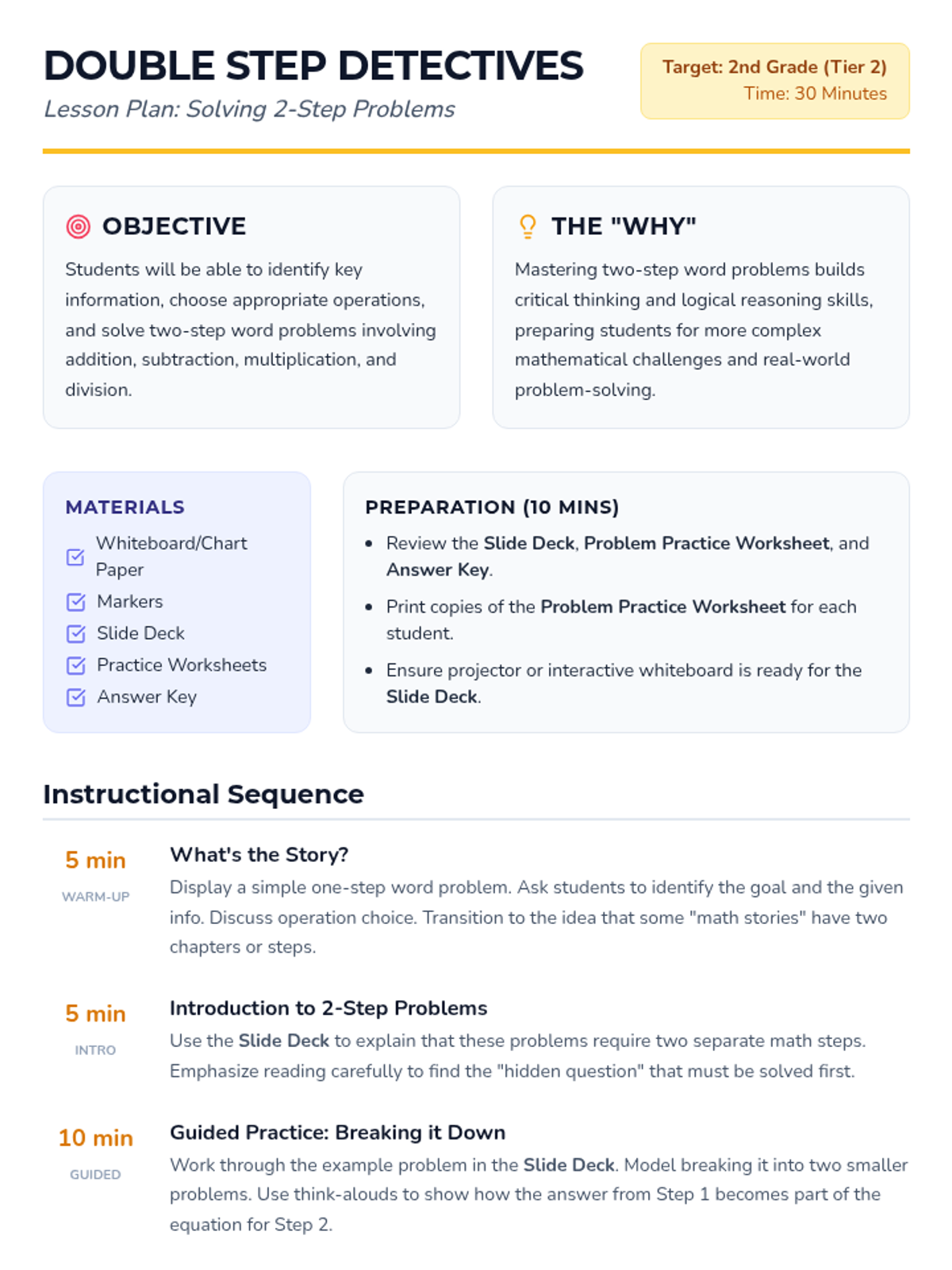 A Tier 2 small group lesson for 2nd graders focusing on breaking down and solving two-step word problems using addition, subtraction, multiplication, and division. Students use a 'math detective' framework to identify hidden questions and sequential steps.