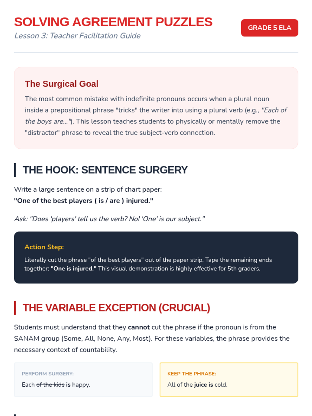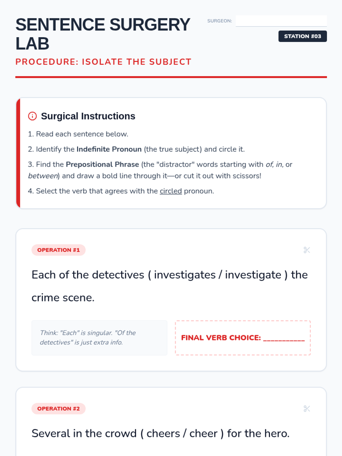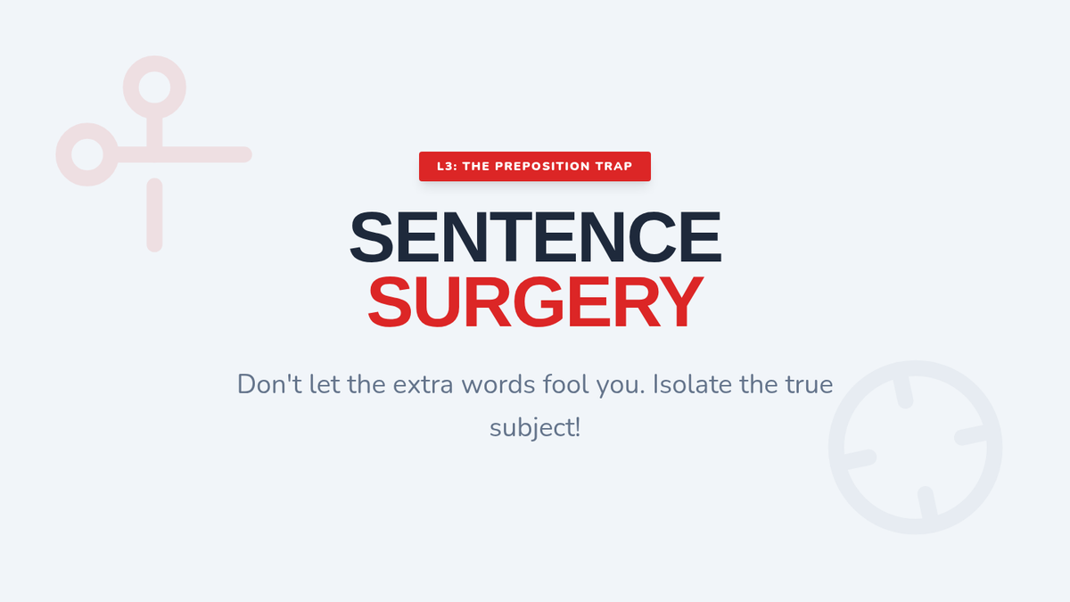 This lesson presents complex sentences where prepositional phrases separate the indefinite pronoun from the verb. Students learn to isolate the subject (the pronoun) to ensure the verb agrees with it, ignoring the intervening words. This targets a high-frequency error pattern.