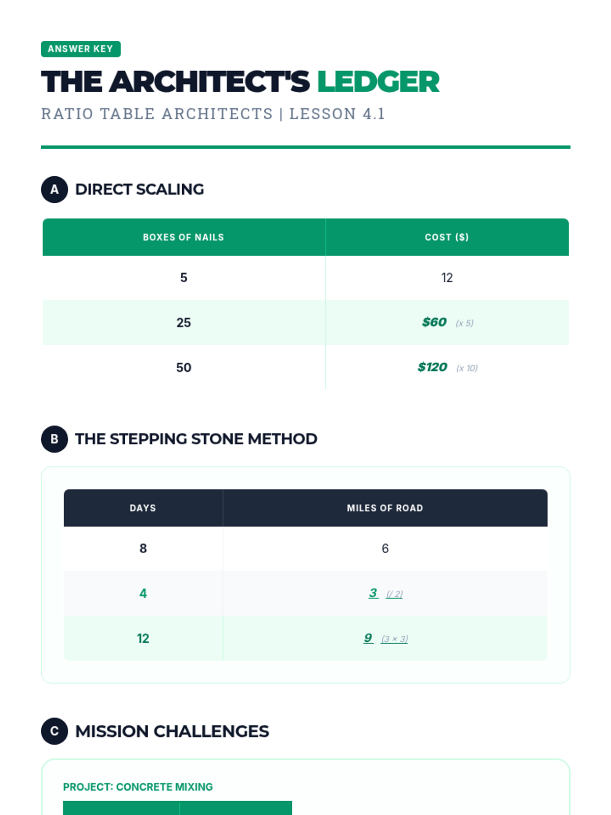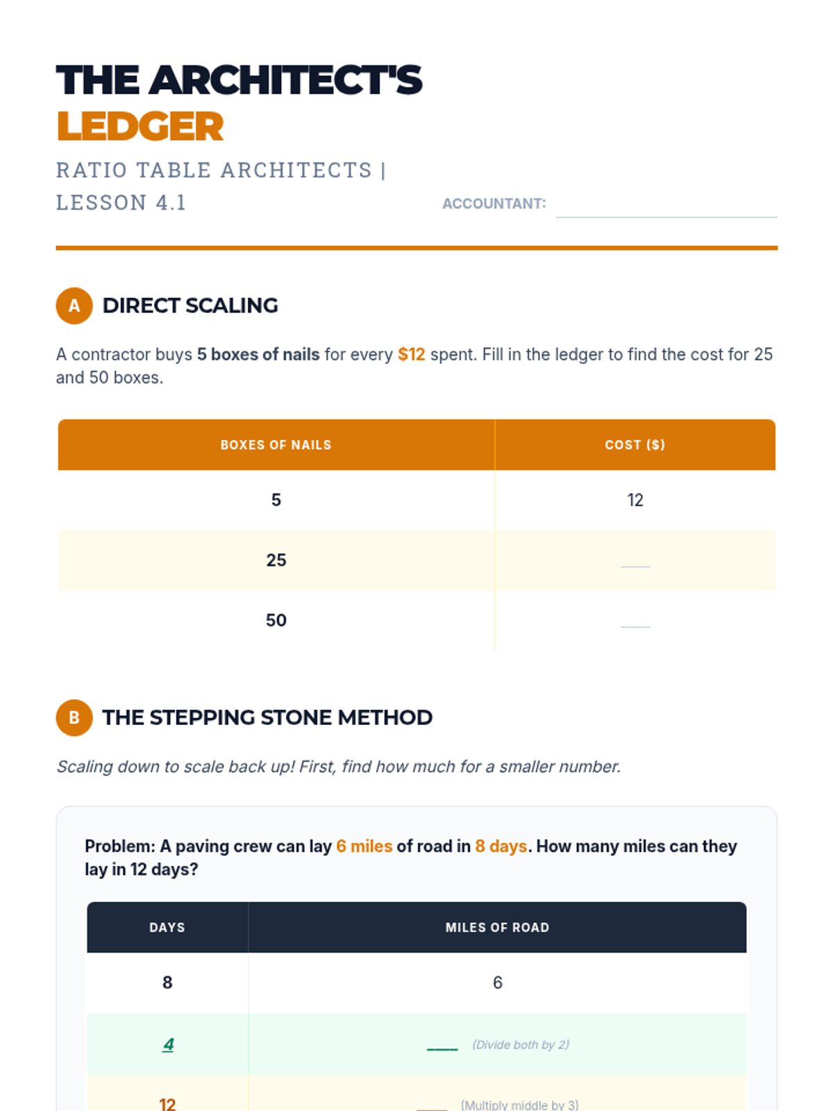 Using established ratio tables, students practice finding unknown values by scaling up or scaling down using multiplication and division.