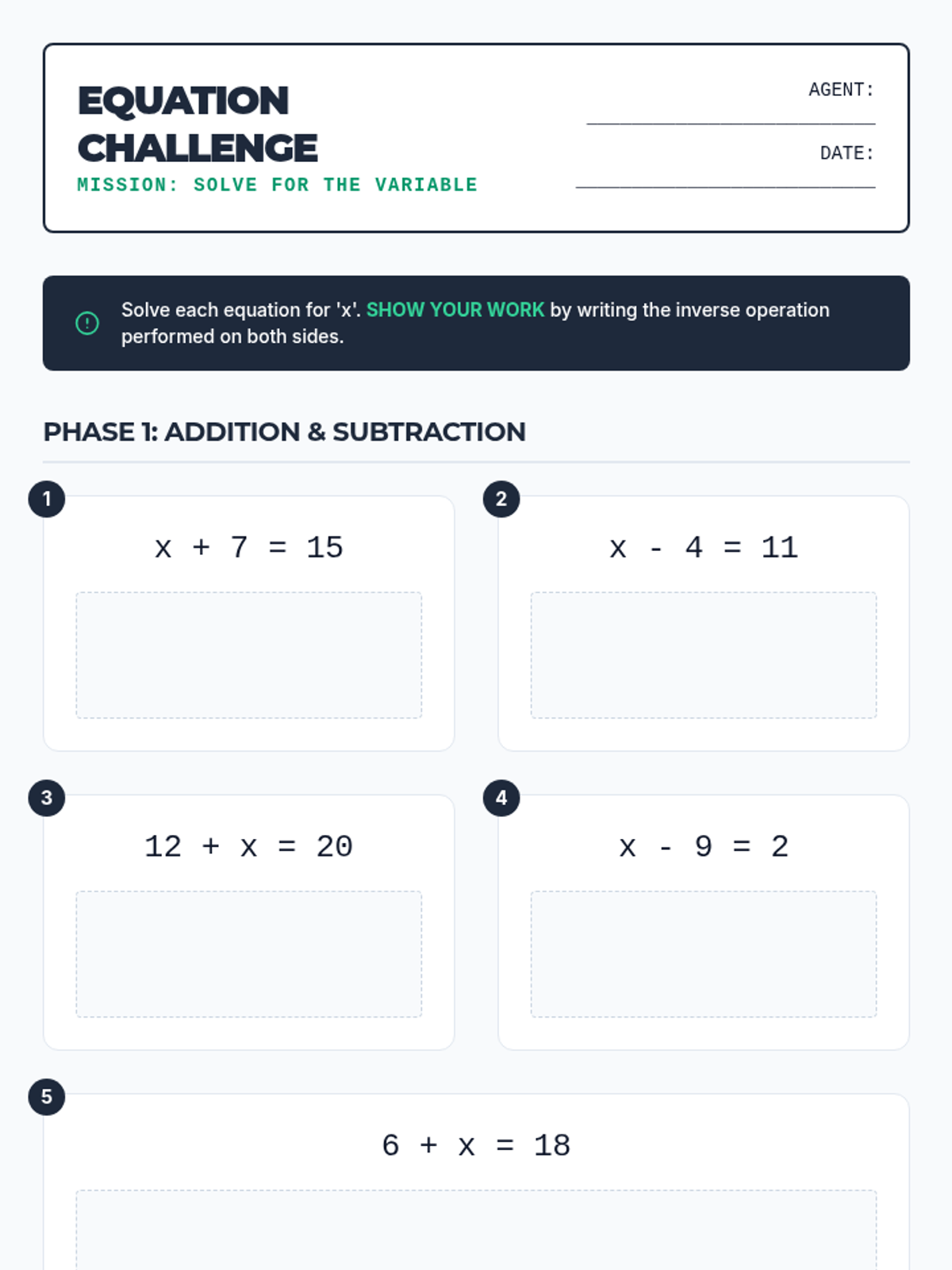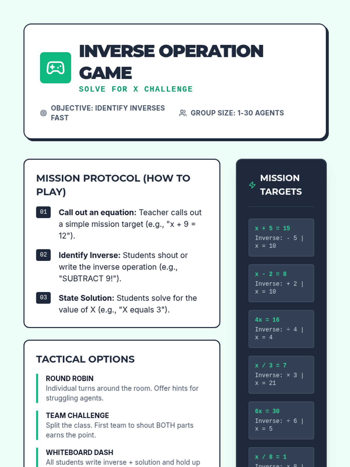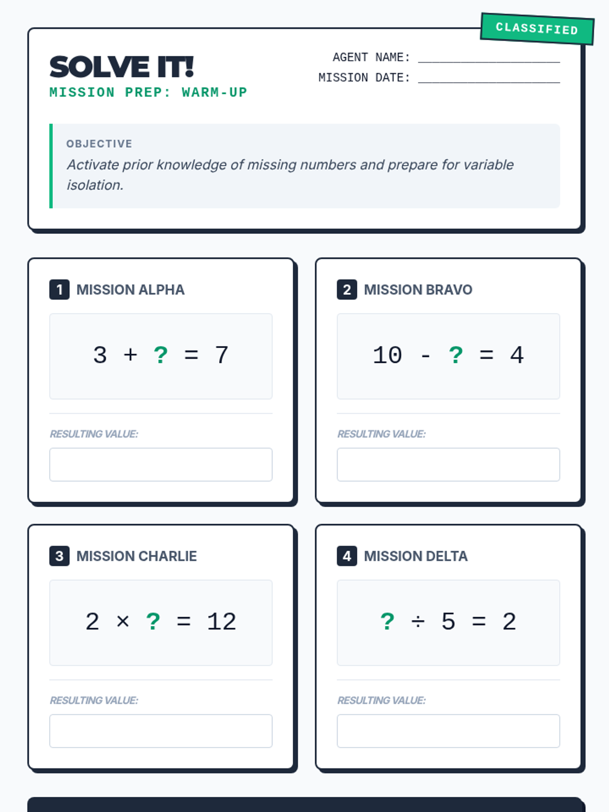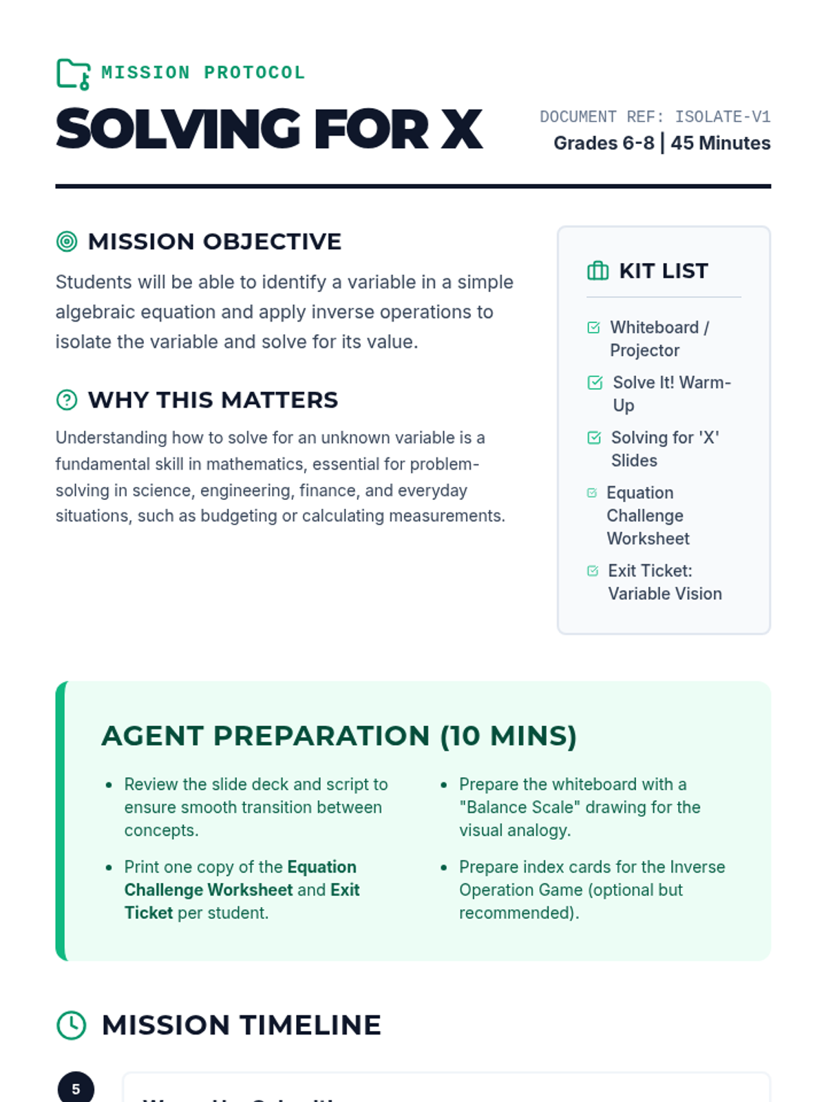 A 45-minute introductory lesson for grades 6-8 on isolating variables in one-step equations using inverse operations, framed as a secret agent mission to uncover unknown values.