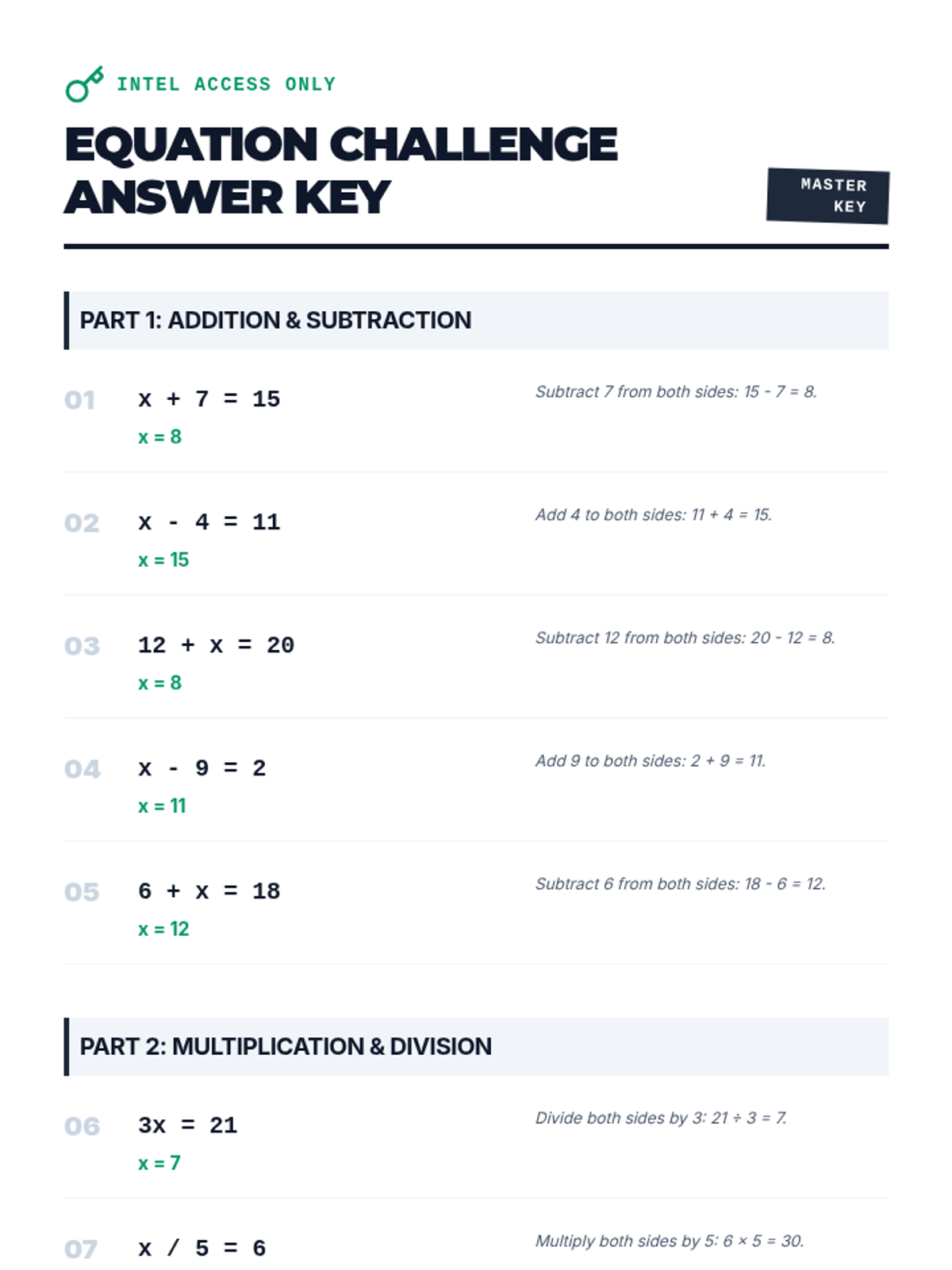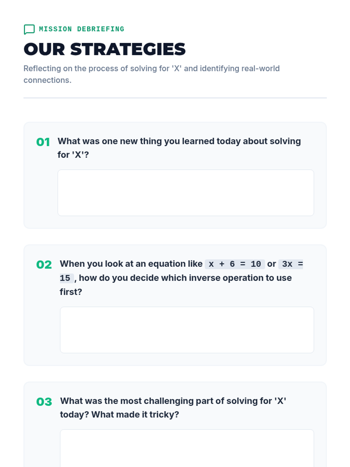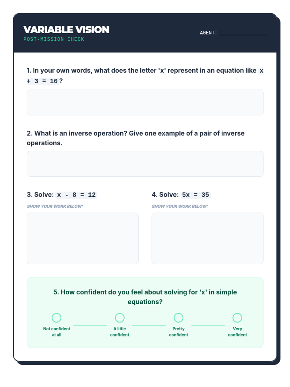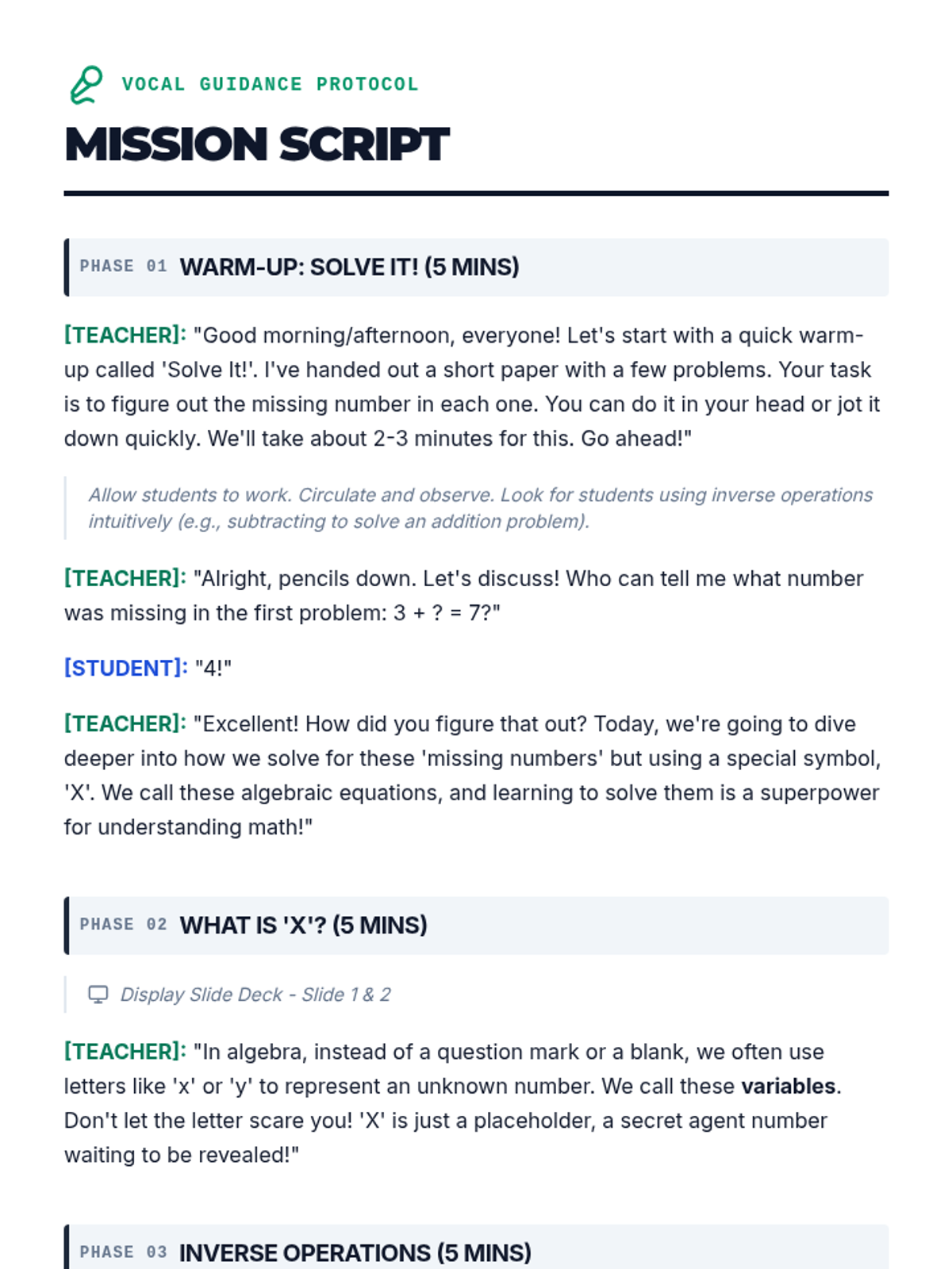 A 45-minute introductory lesson for grades 6-8 on isolating variables in one-step equations using inverse operations, framed as a secret agent mission to uncover unknown values.
