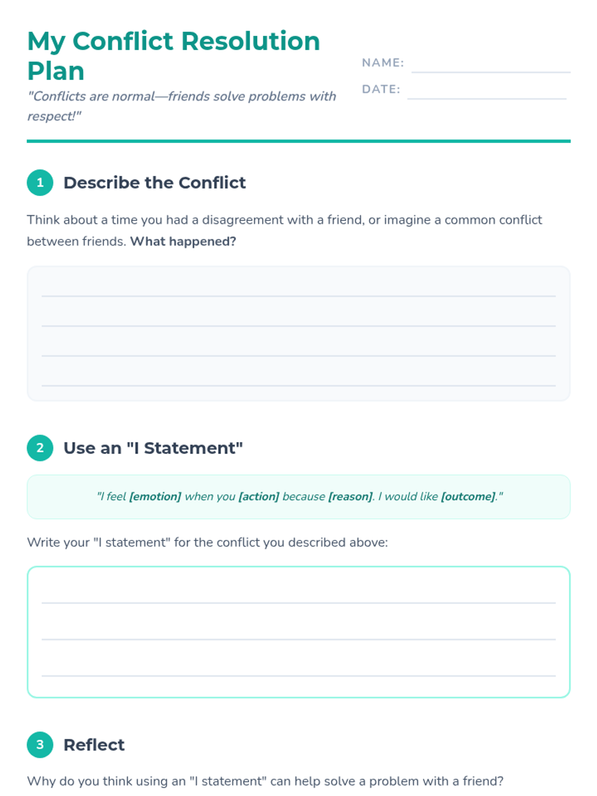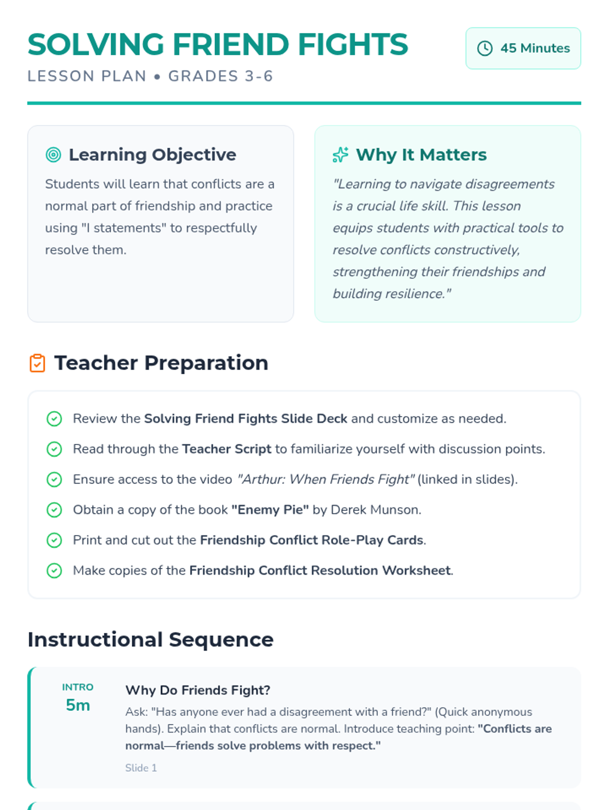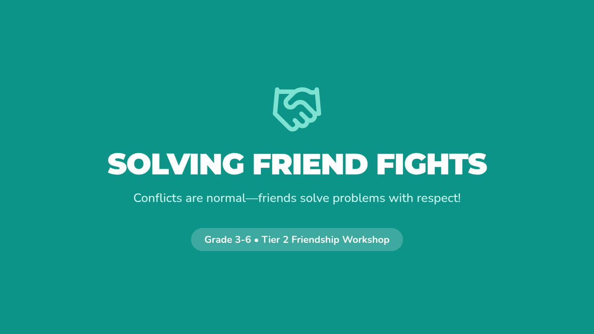 A 45-minute Tier 2 lesson for grades 3-6 focused on understanding conflict as a normal part of friendship and learning to use 'I statements' for respectful resolution.