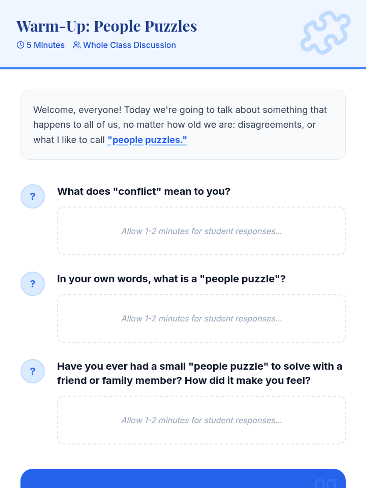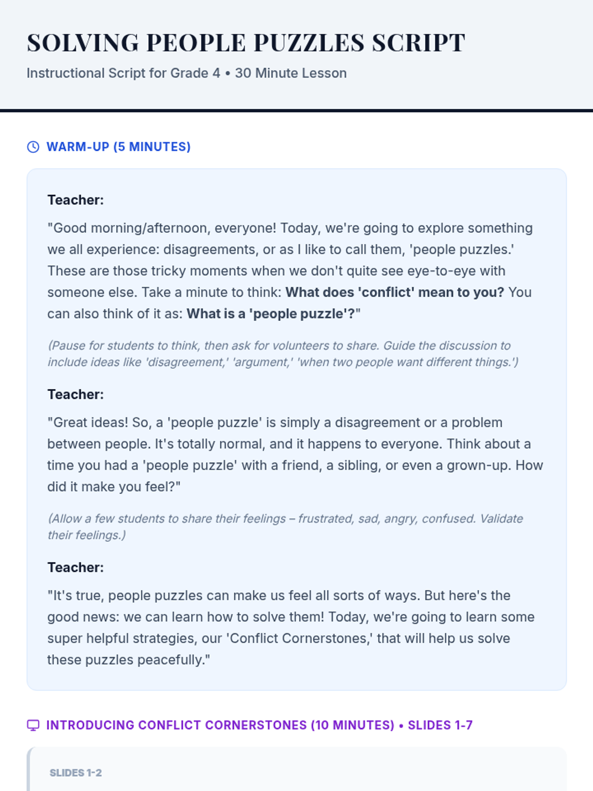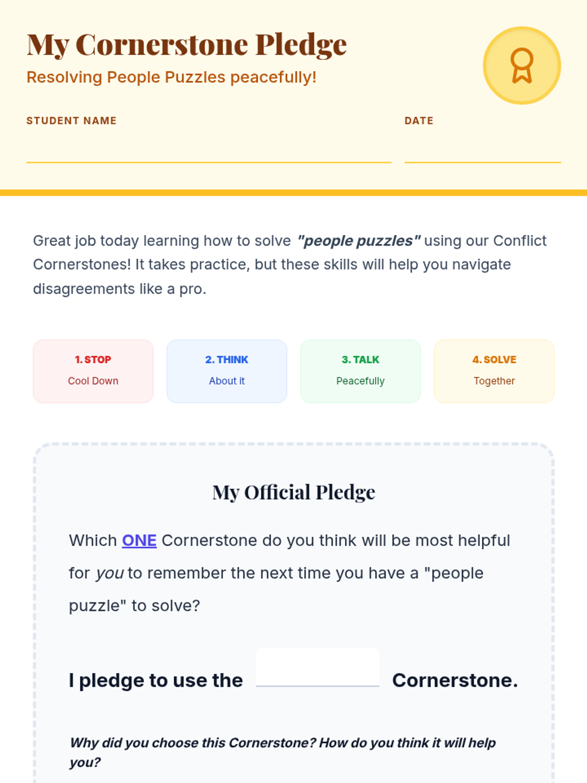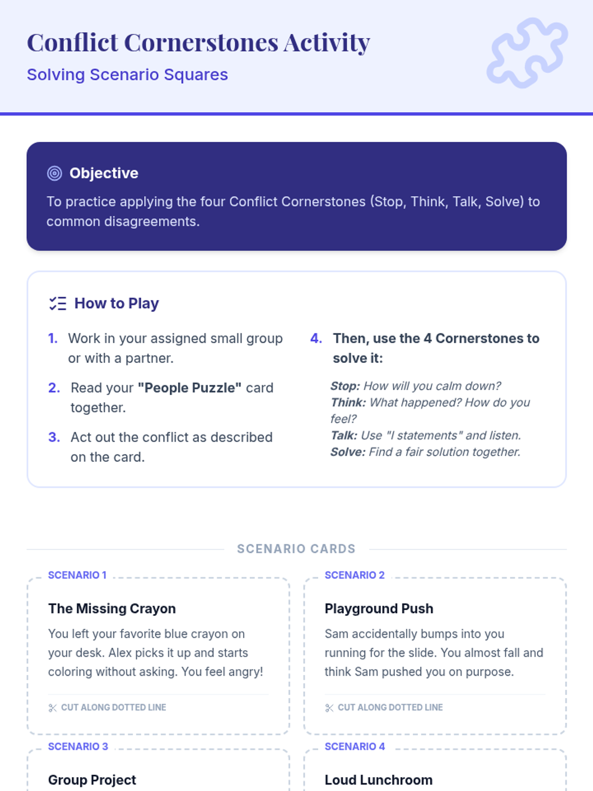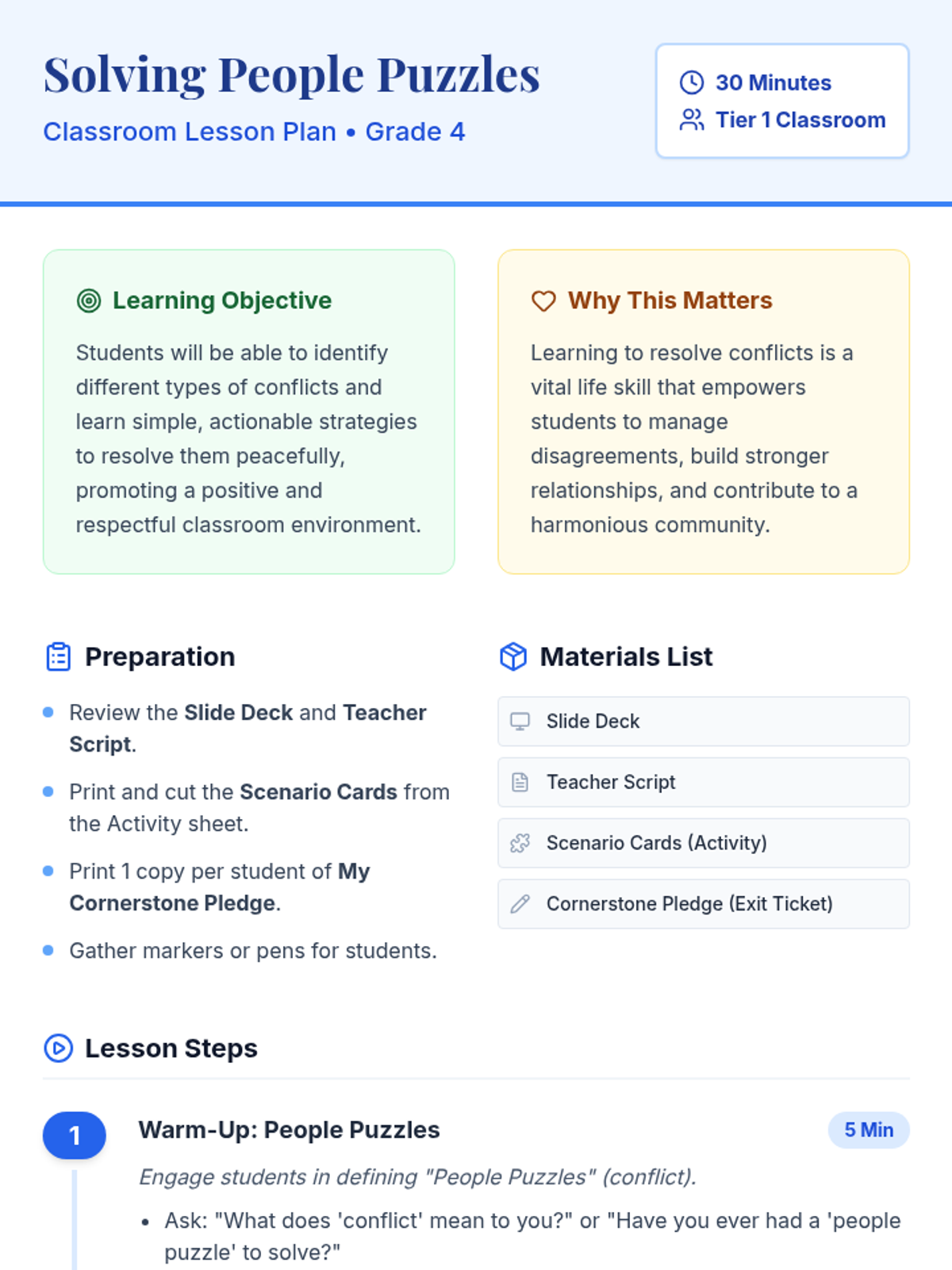 A 30-minute introductory lesson for 4th-grade students on basic conflict resolution strategies using the 'Conflict Cornerstones' framework: Stop, Think, Talk, and Solve.