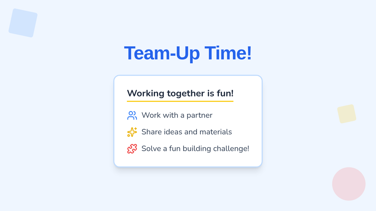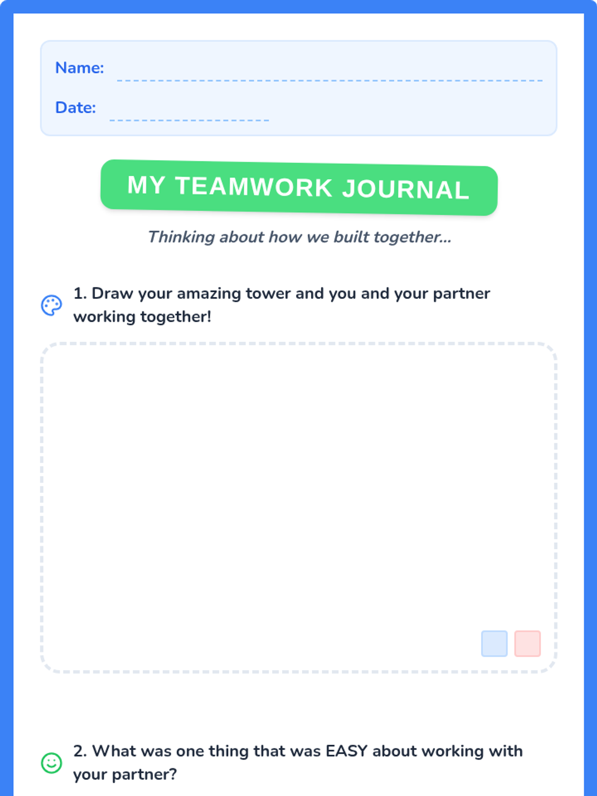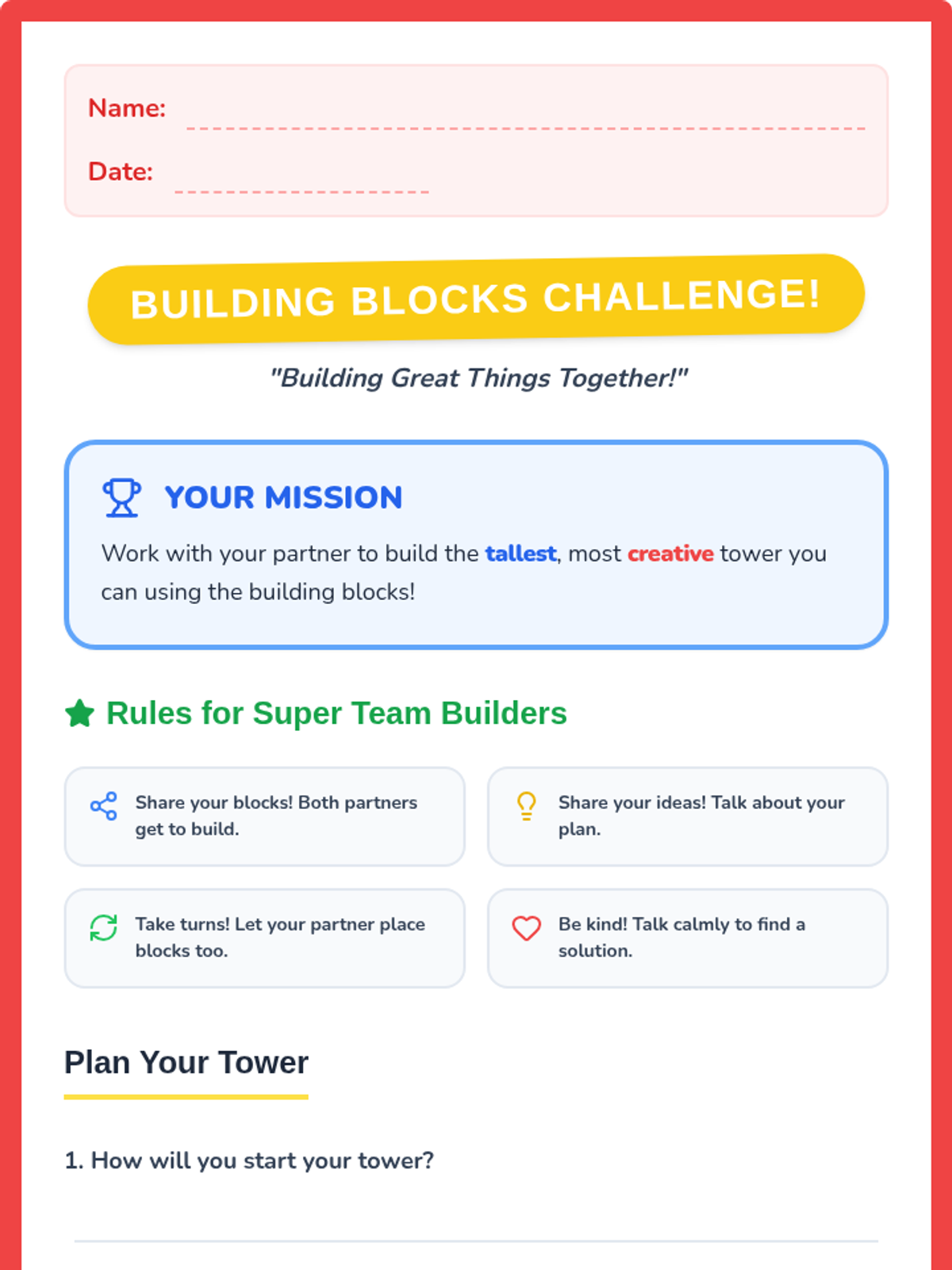 A 20-minute SEL lesson for 1st graders focusing on teamwork and collaborative problem-solving through a building block challenge. Students practice sharing, compromise, and calm communication.