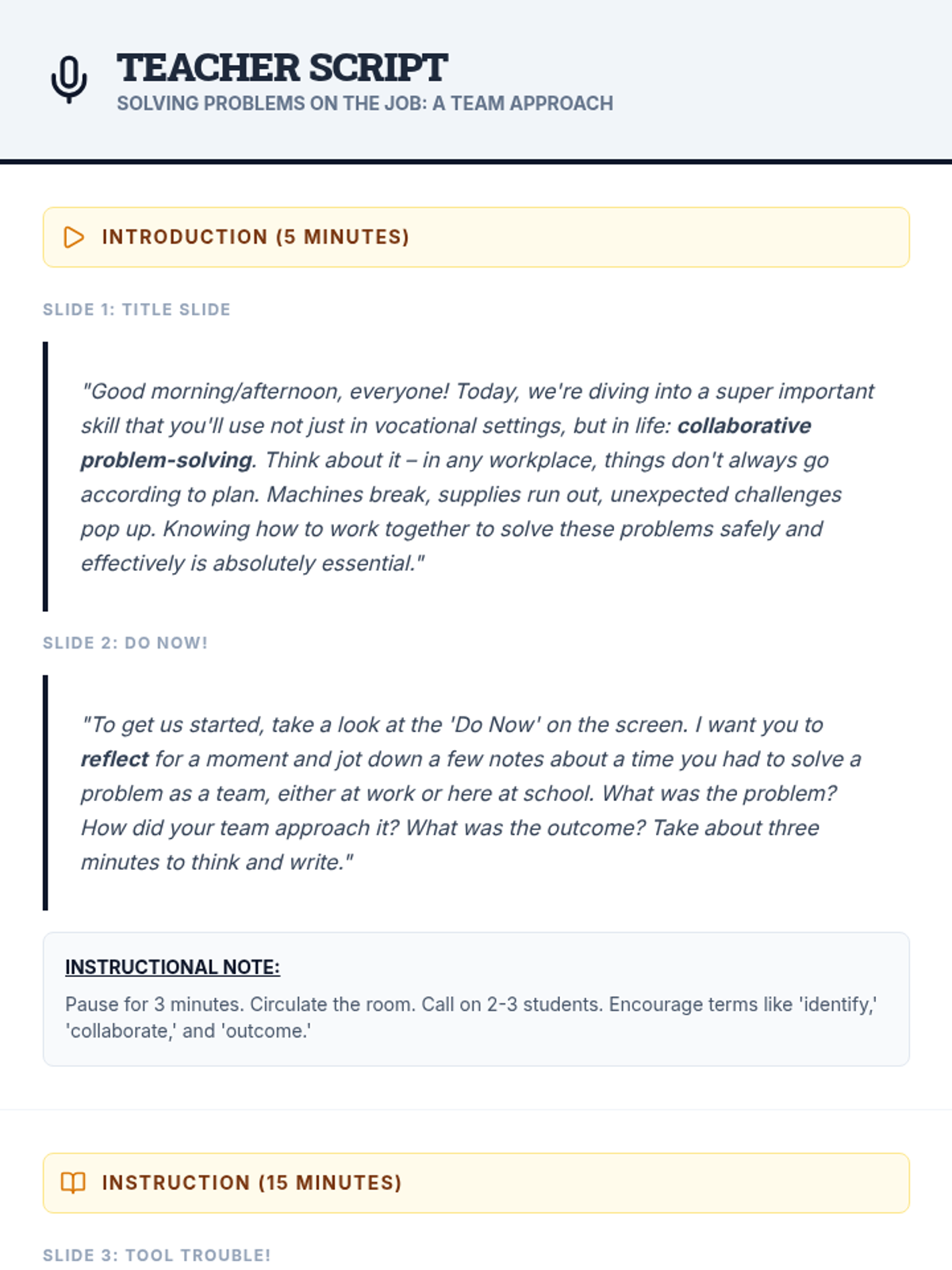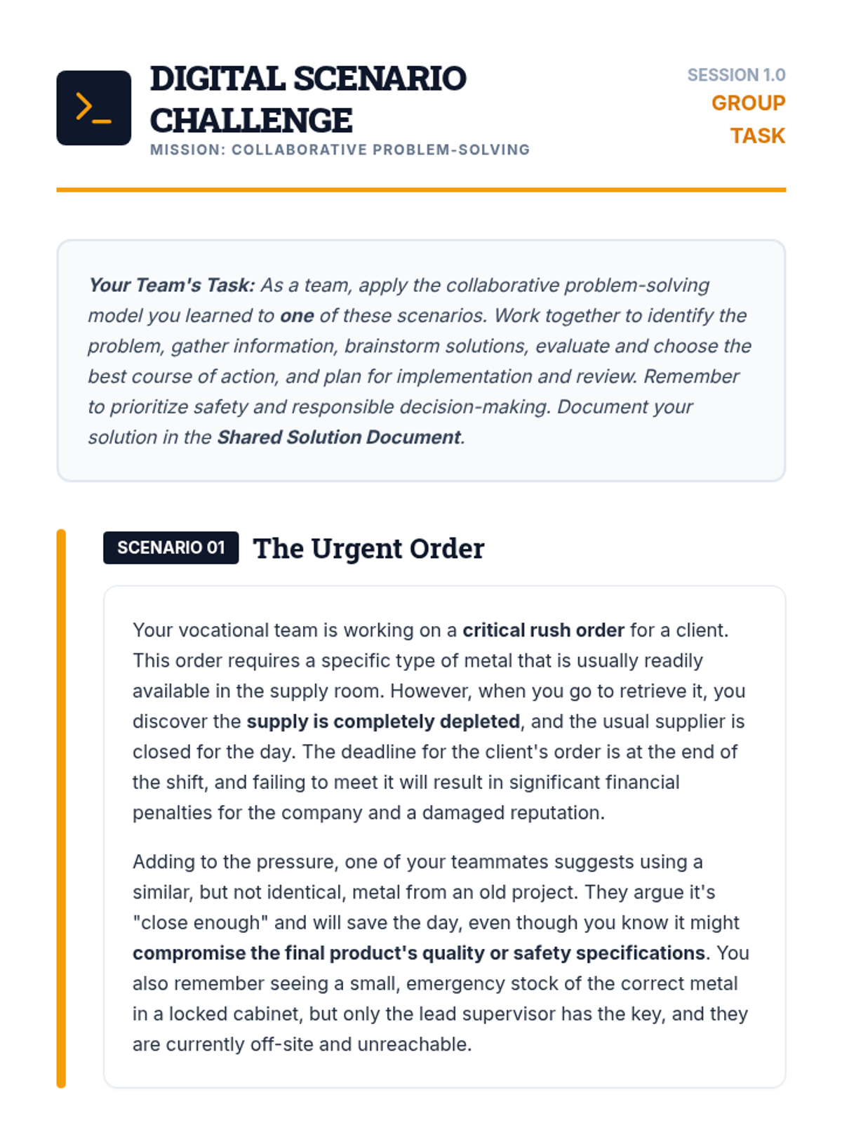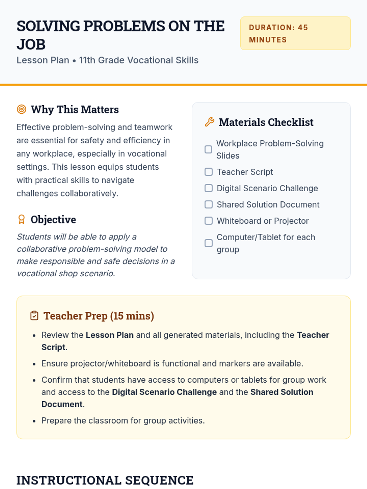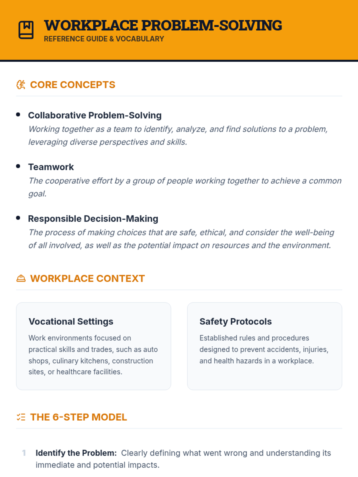 This lesson helps 11th-grade students apply a collaborative problem-solving model to make responsible and safe decisions in vocational shop scenarios. It's crucial for developing teamwork and critical thinking skills in a real-world context.