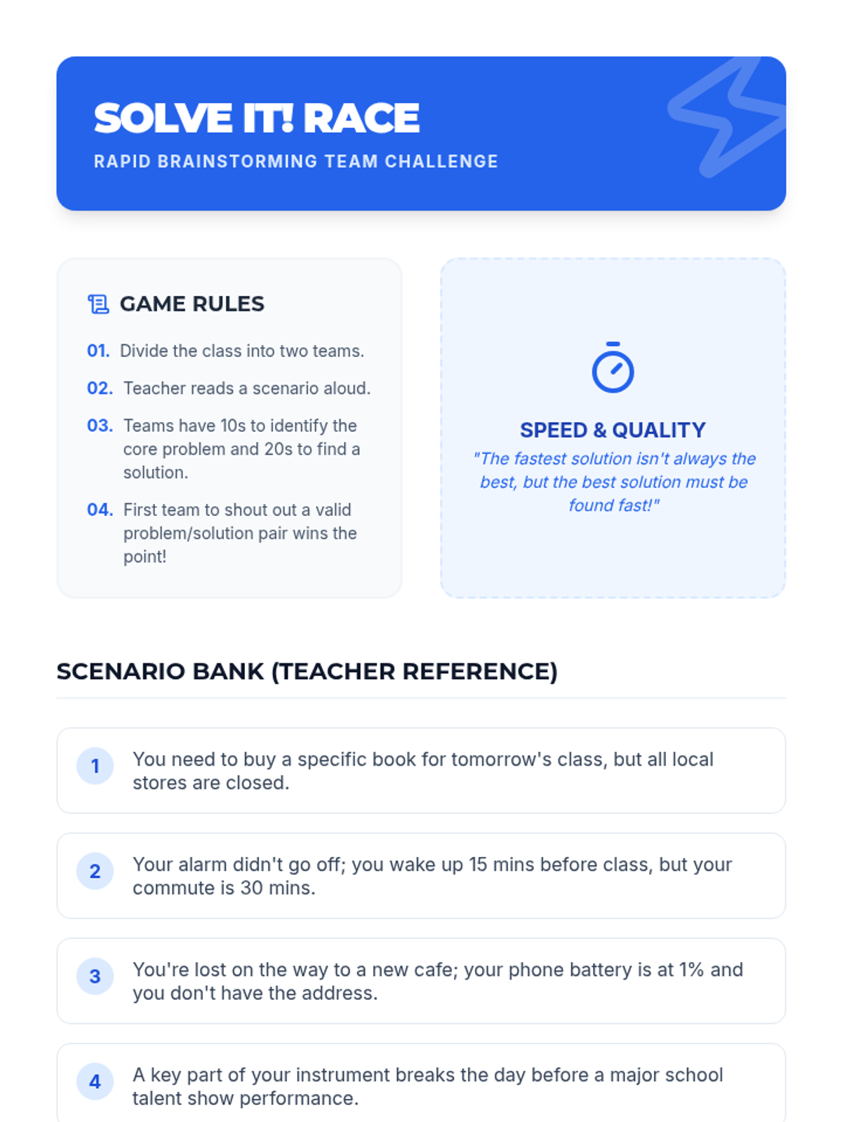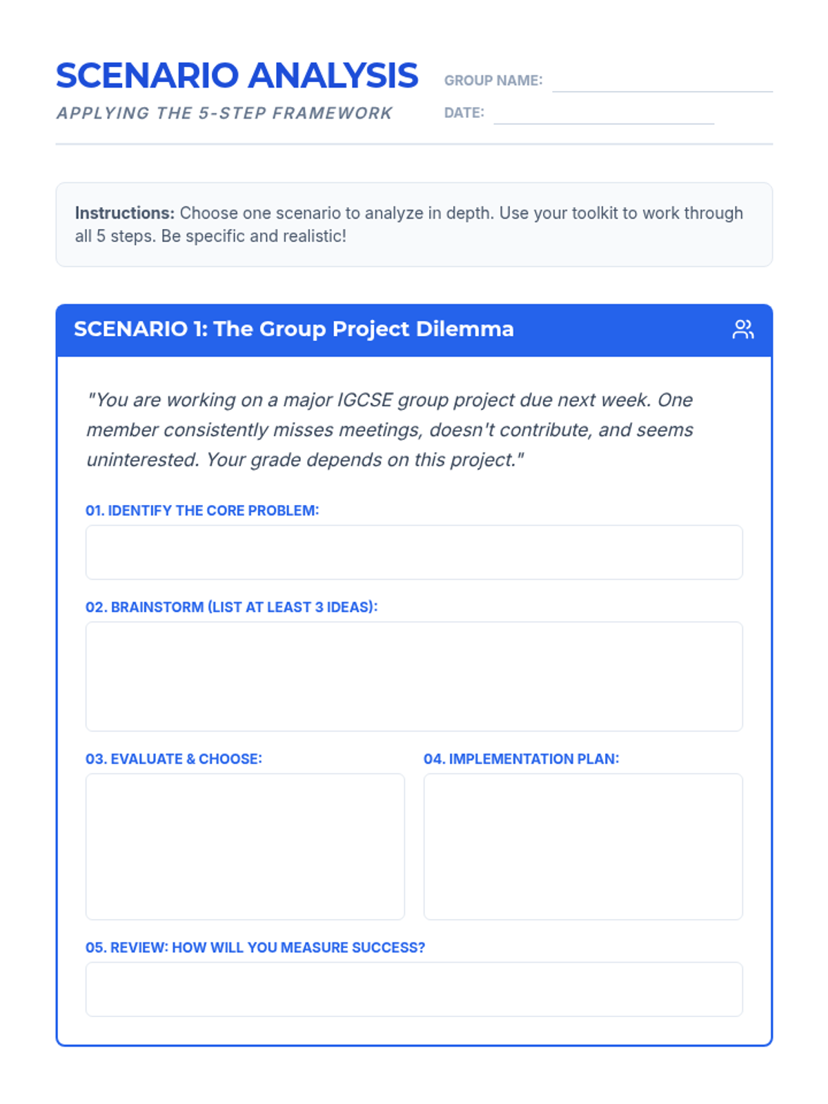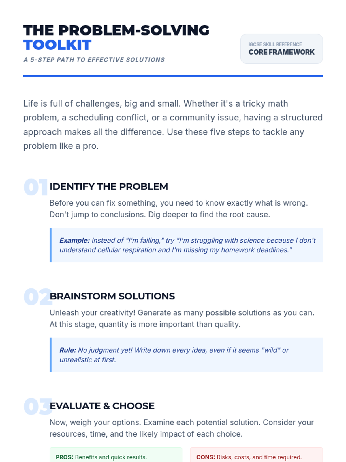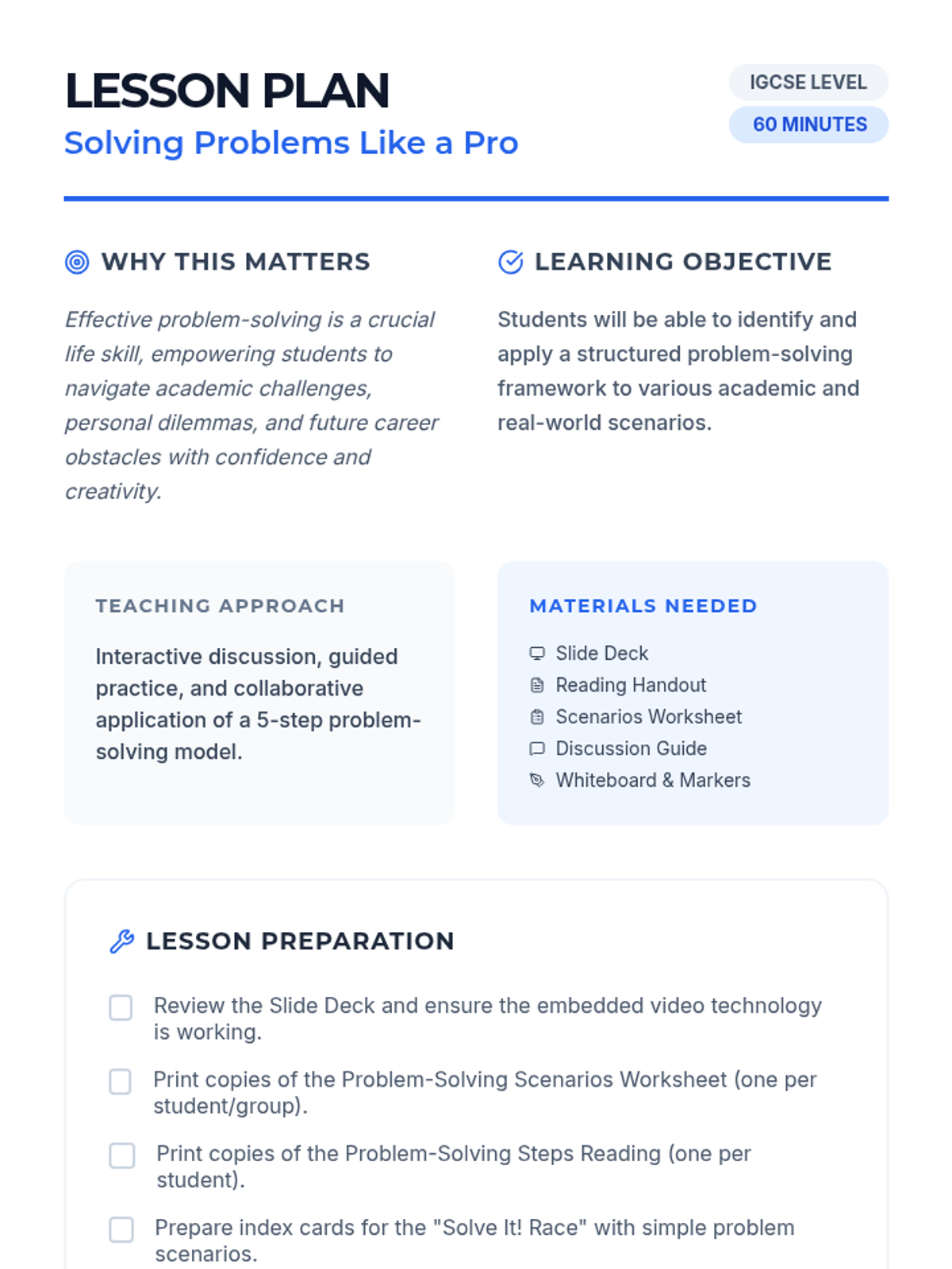 A 60-minute lesson designed for IGCSE students to master a 5-step problem-solving framework through interactive scenarios, group activities, and a community-based project.