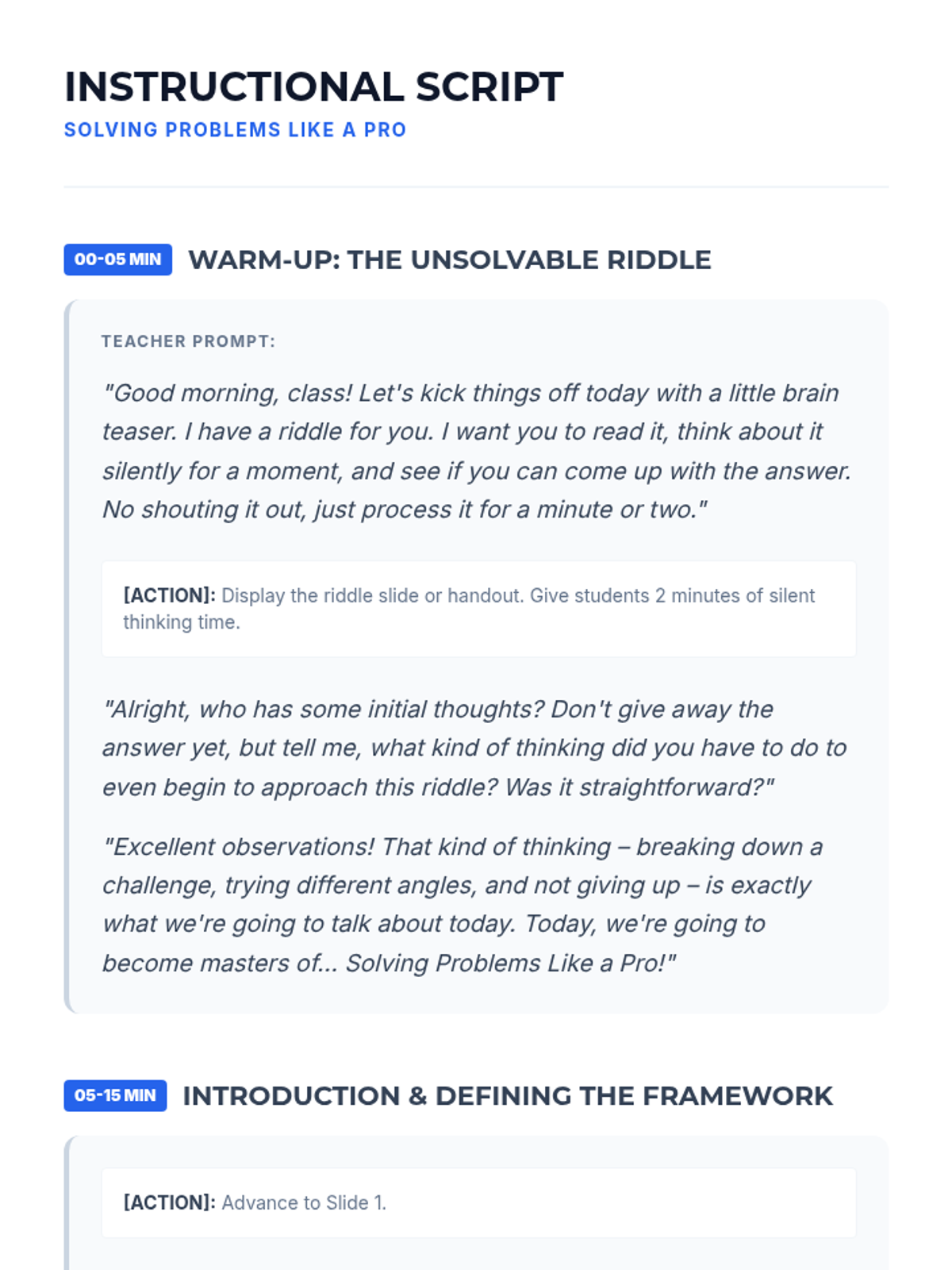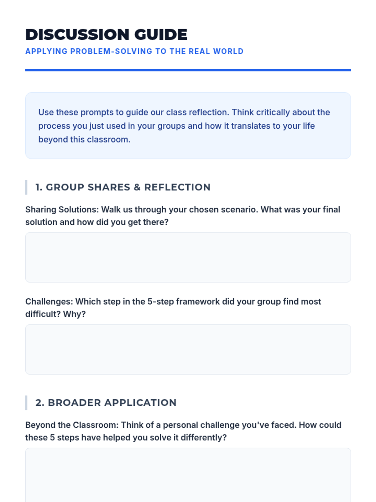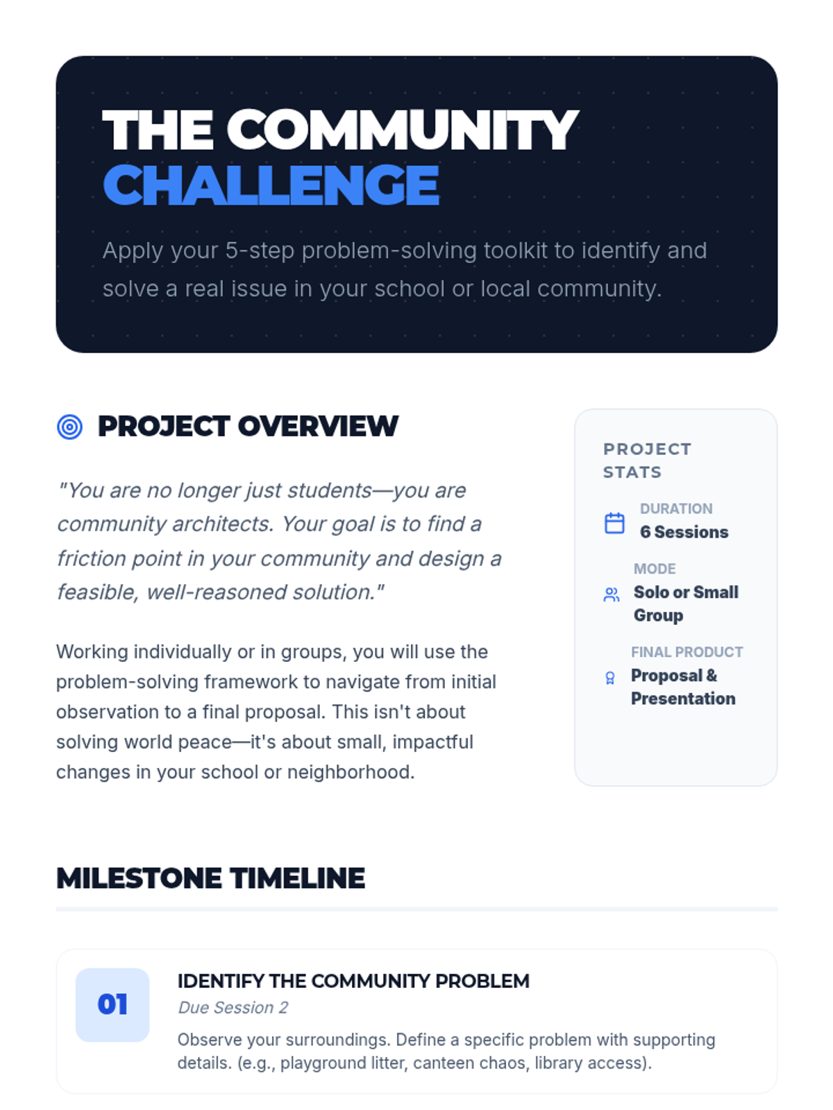 A 60-minute lesson designed for IGCSE students to master a 5-step problem-solving framework through interactive scenarios, group activities, and a community-based project.