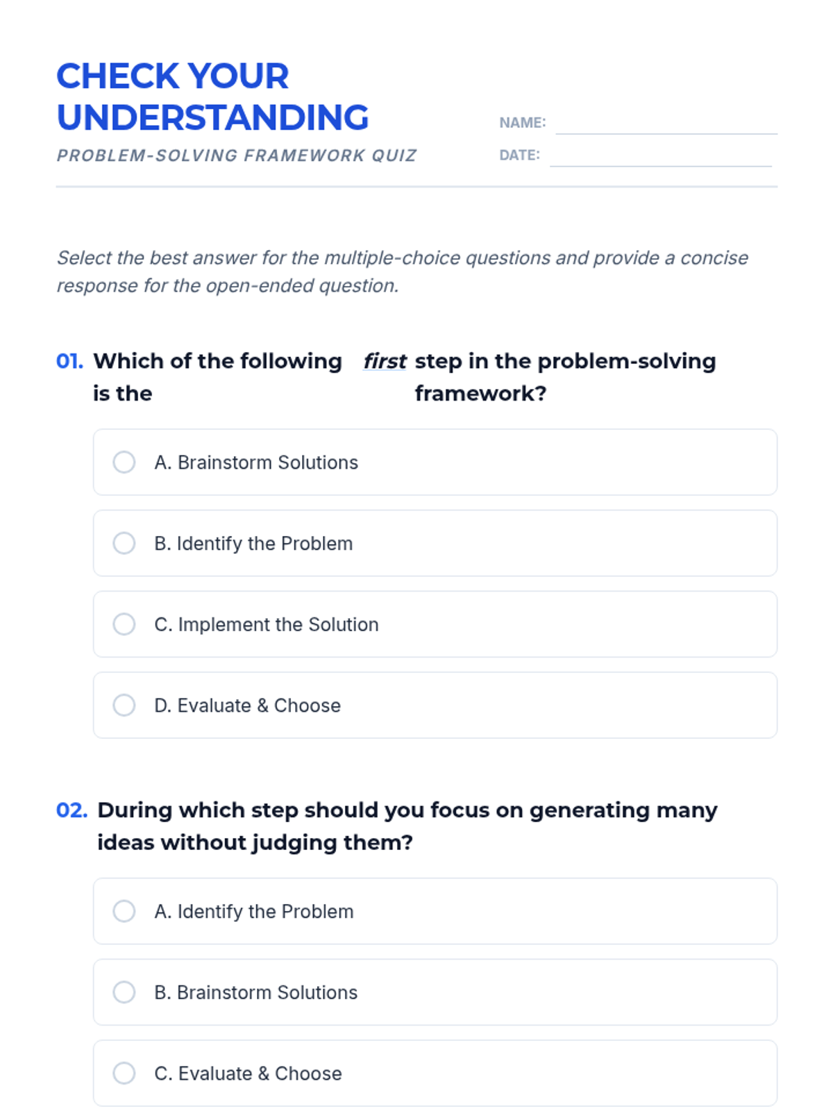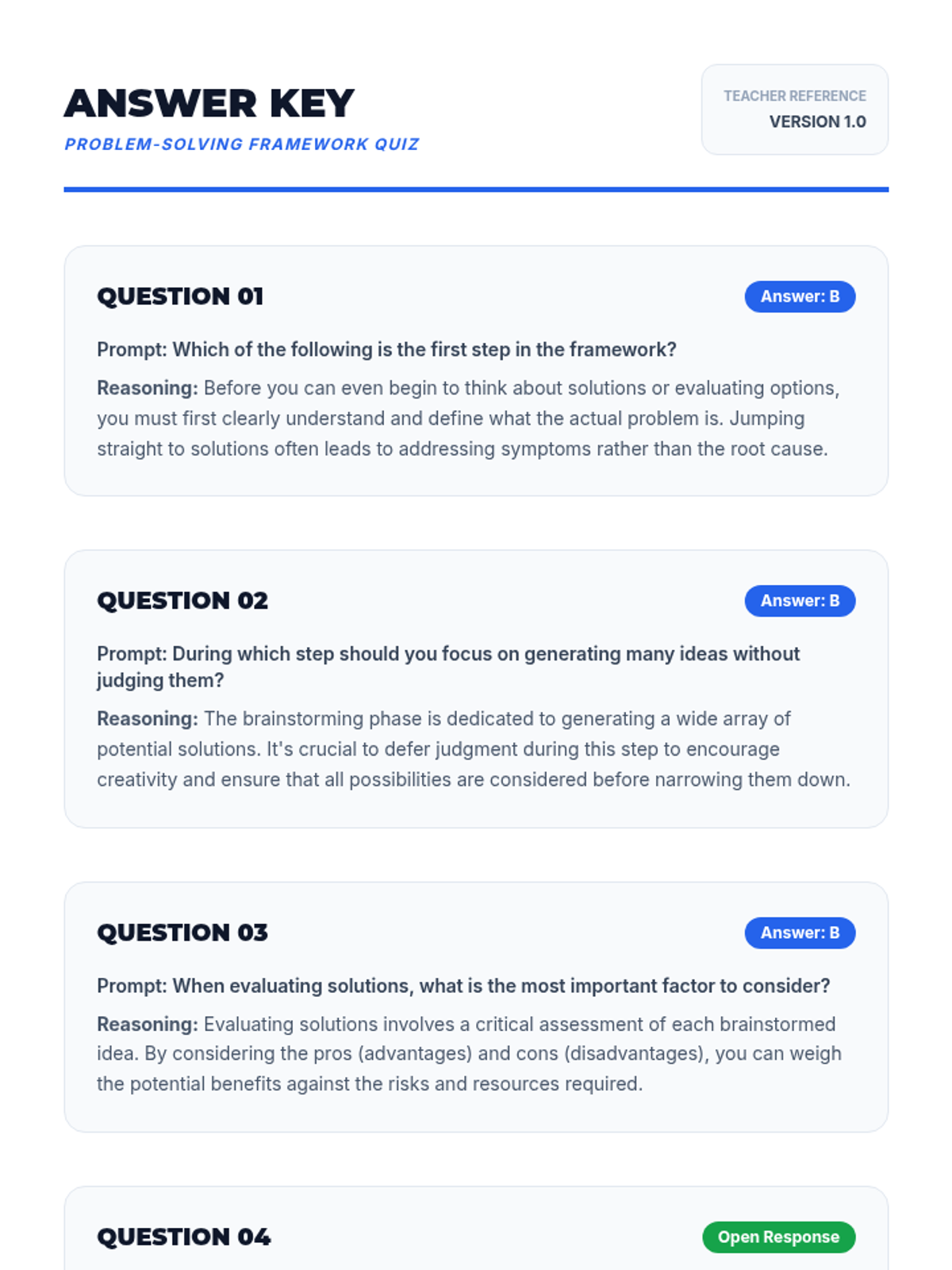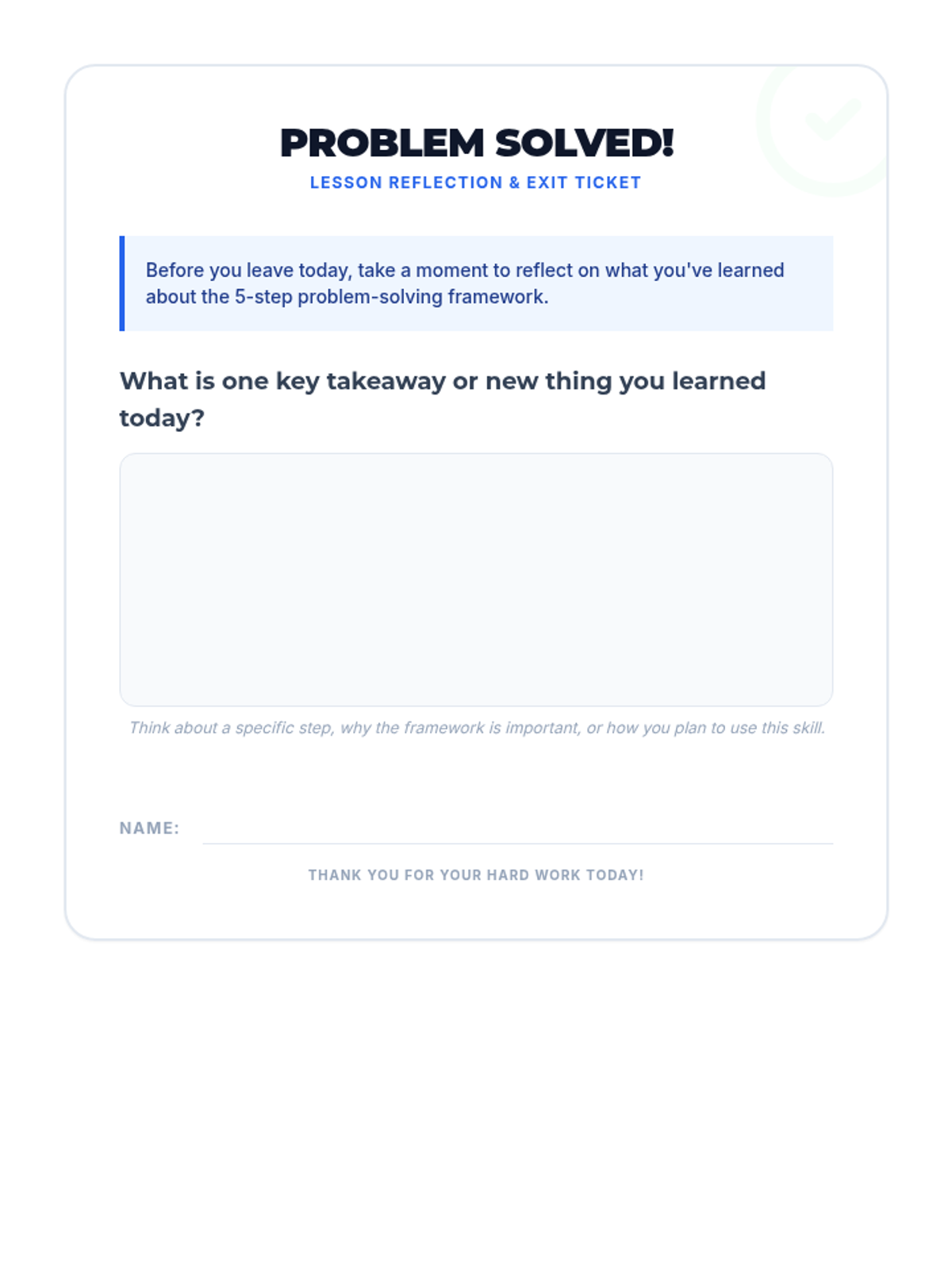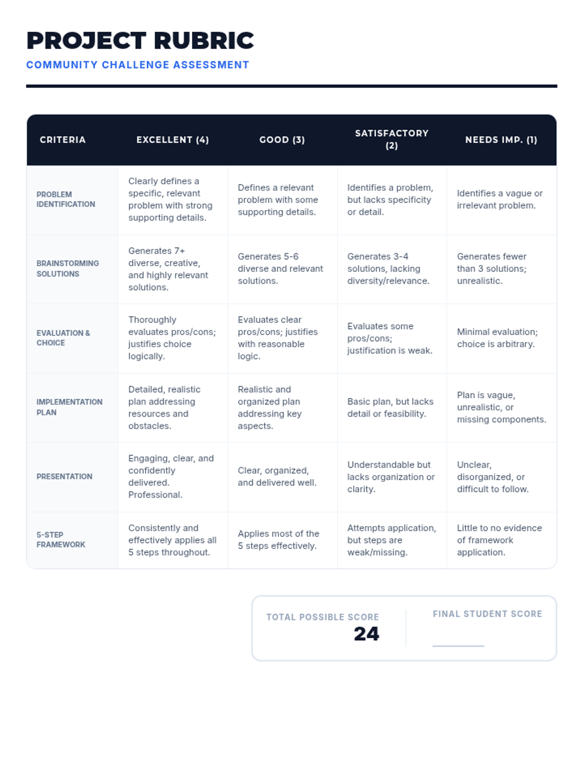 A 60-minute lesson designed for IGCSE students to master a 5-step problem-solving framework through interactive scenarios, group activities, and a community-based project.