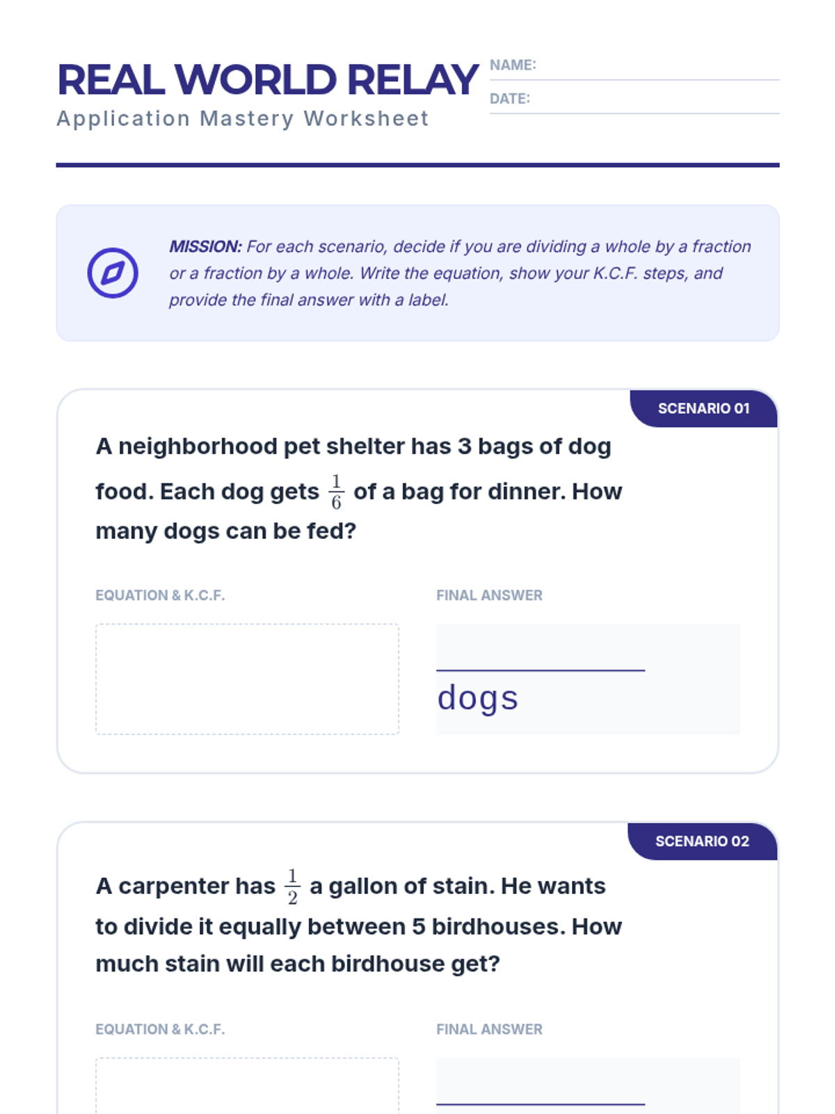 Students master word problem applications, learning to distinguish between scenarios that require dividing a whole by a fraction versus a fraction by a whole.