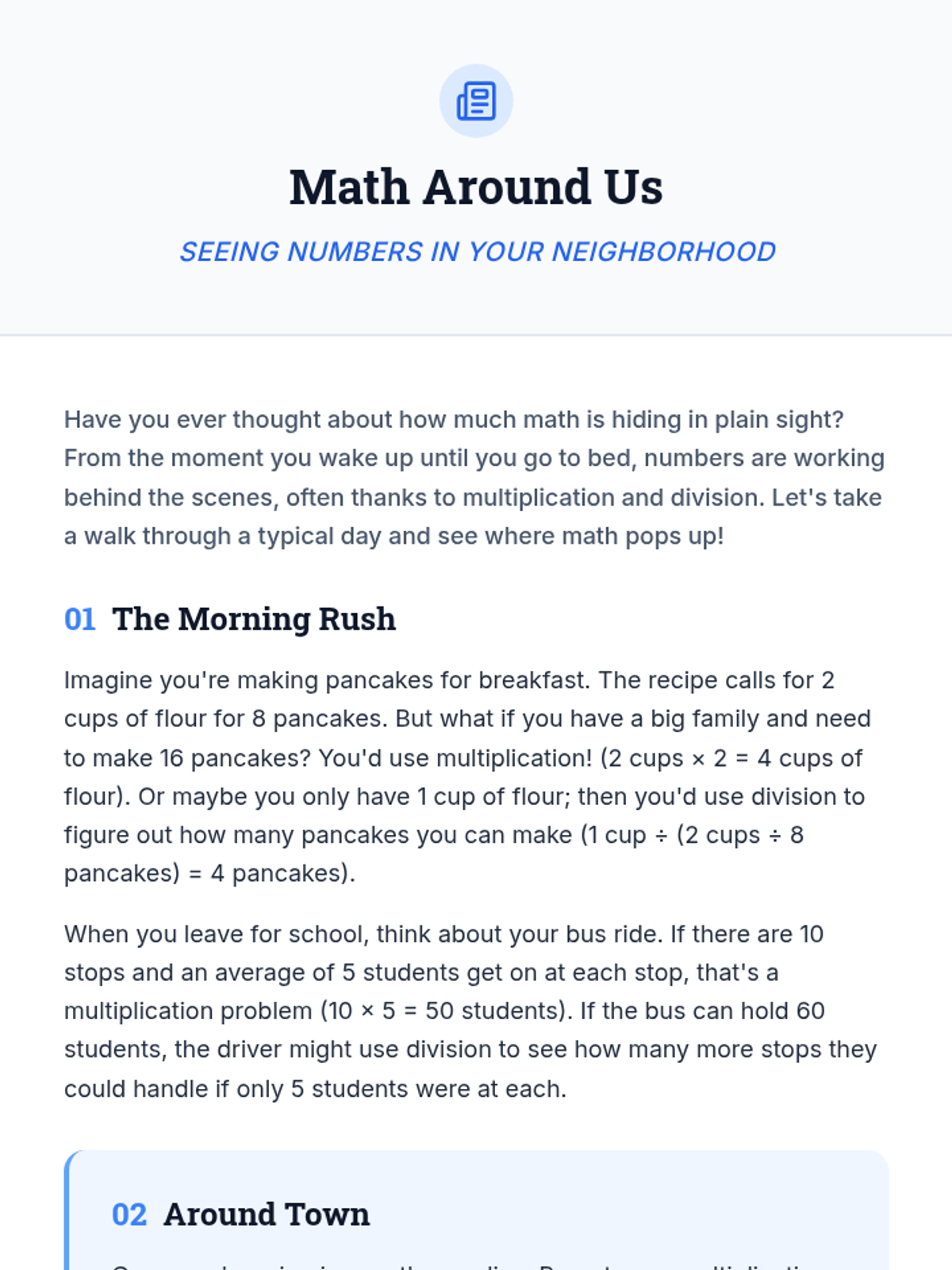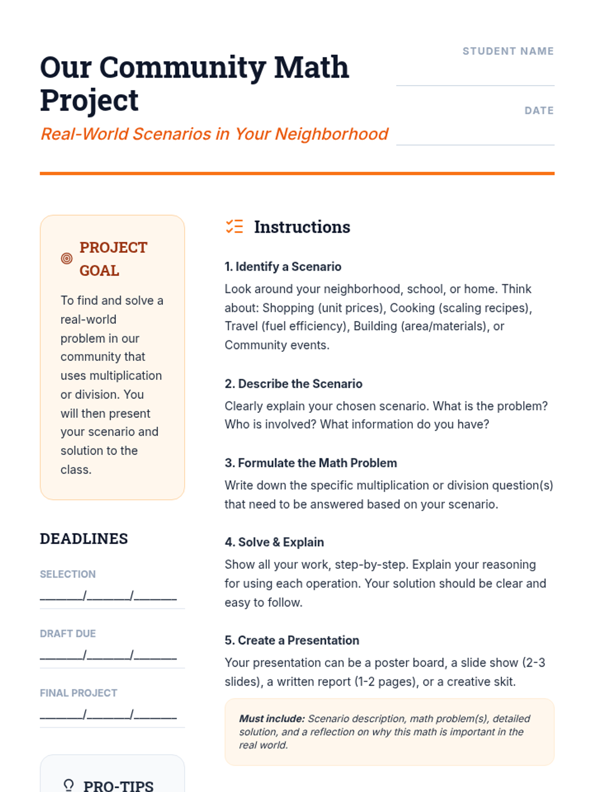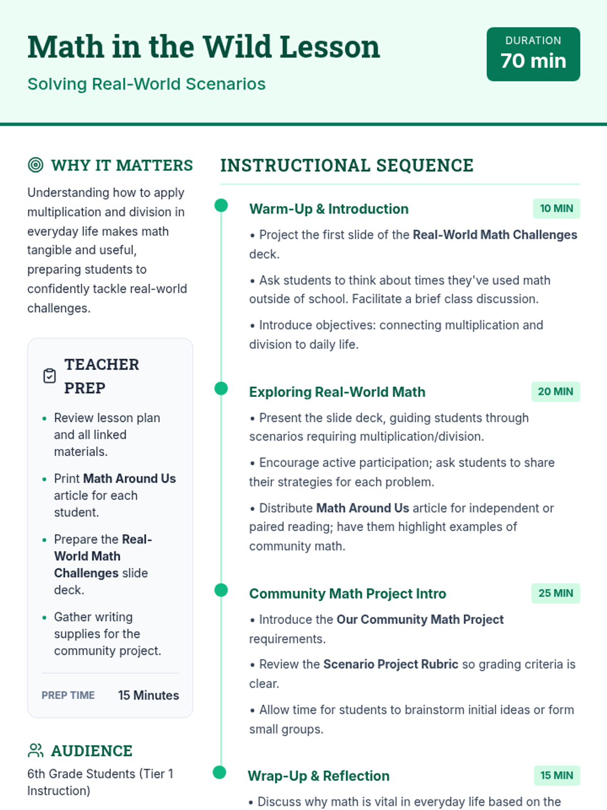 A comprehensive 70-minute math lesson for 6th graders focusing on applying multiplication and division to real-life situations like party planning, travel budgeting, and baking. Students transition from guided problem-solving to an independent community project.