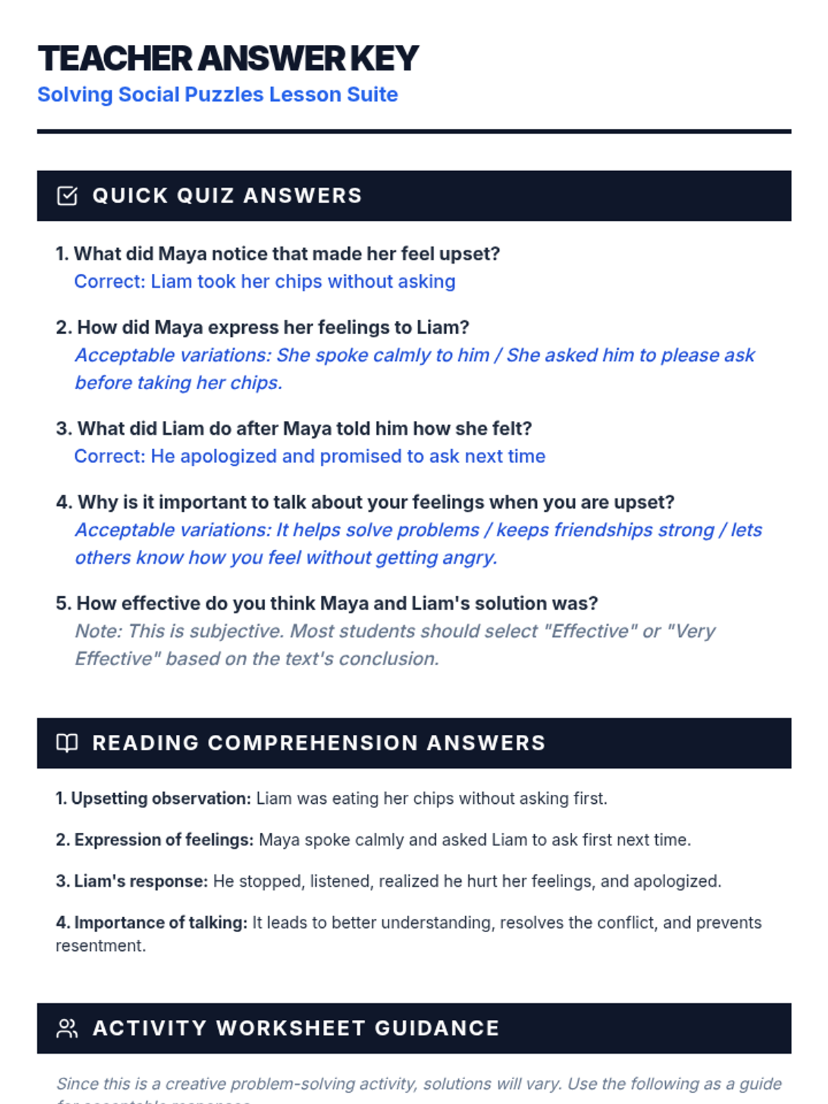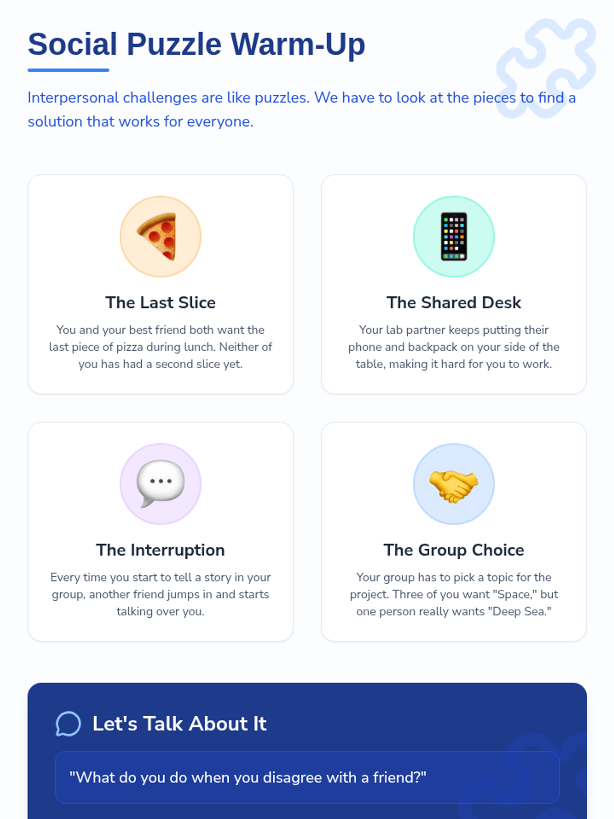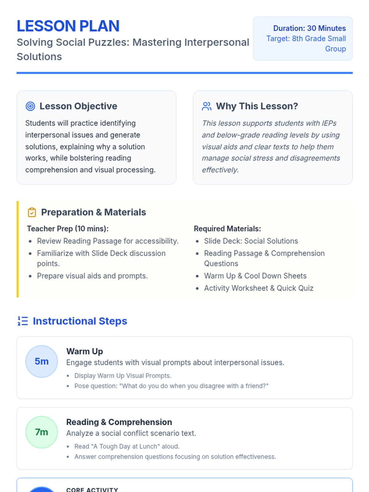 A 30-minute Tier 2 small group lesson for 8th graders focused on identifying and solving interpersonal conflicts through visual aids and reading comprehension. Students practice generating effective solutions to social challenges to meet IEP goals.