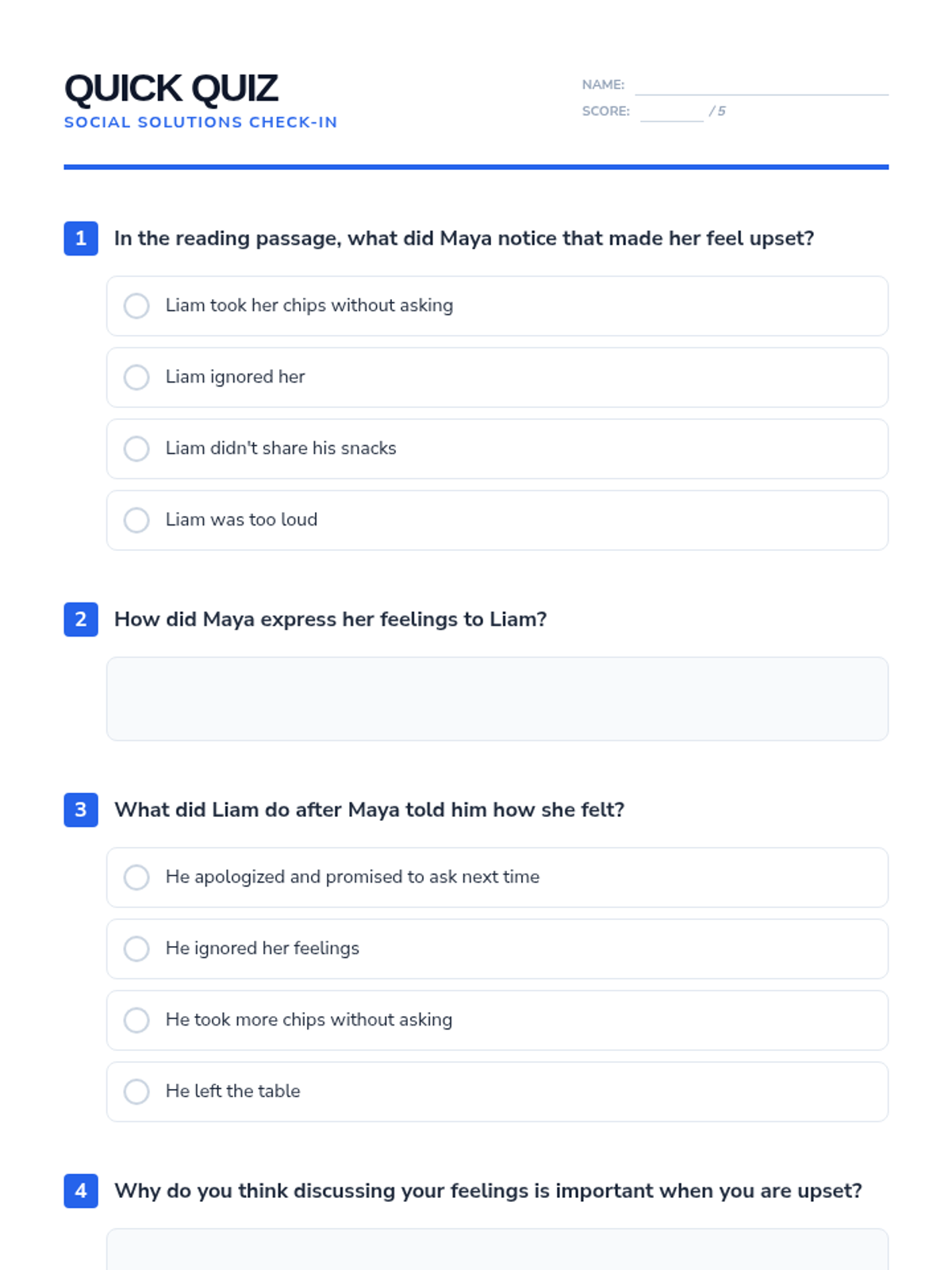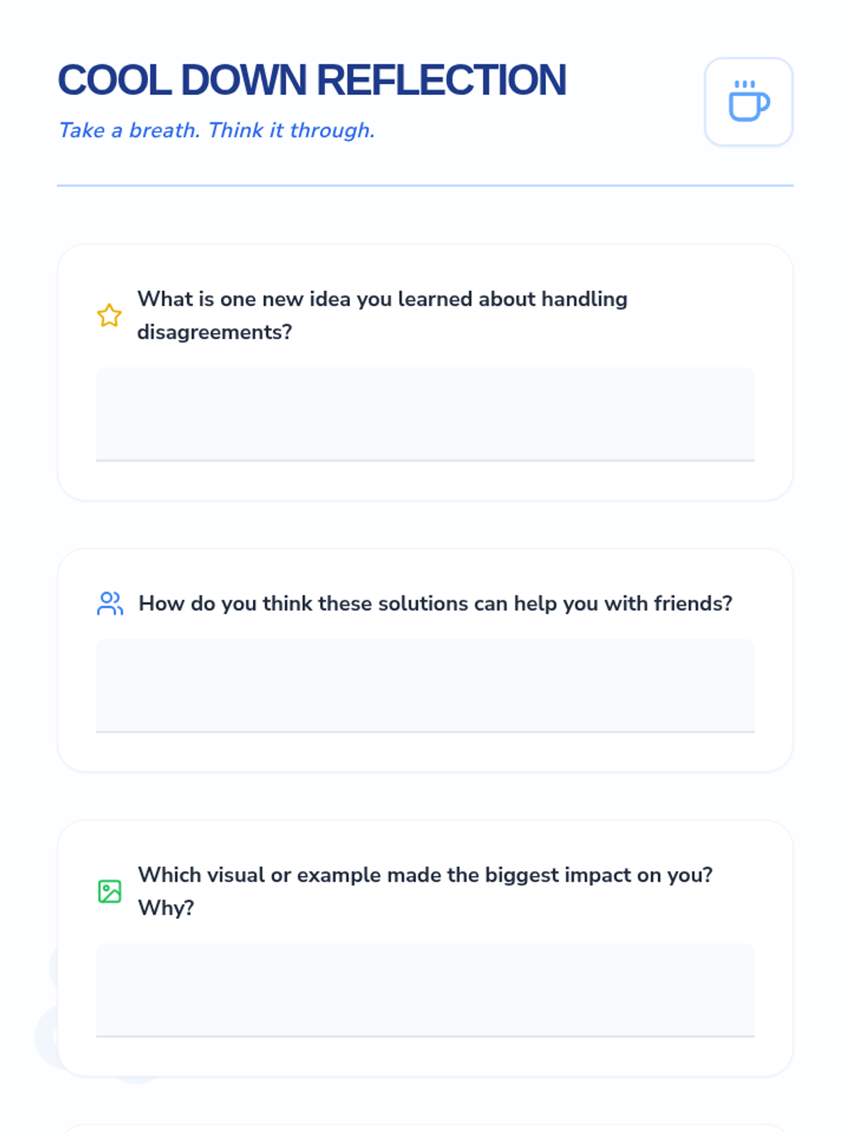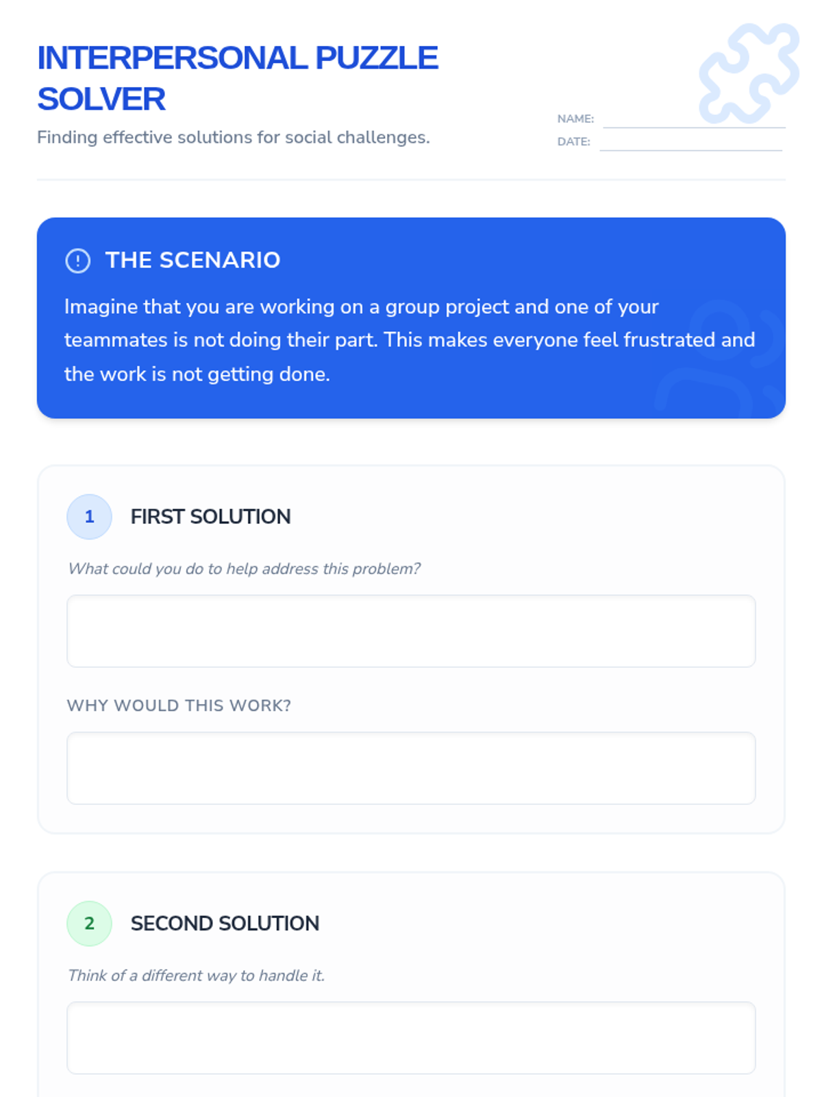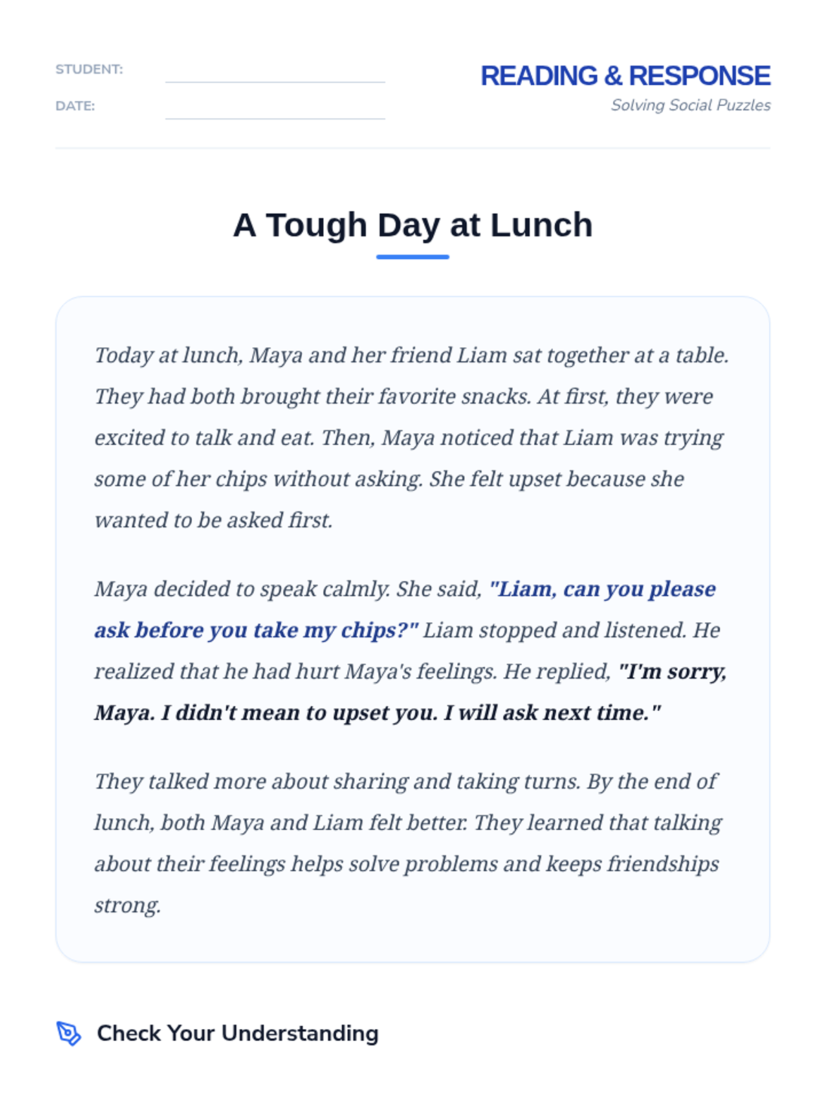 A 30-minute Tier 2 small group lesson for 8th graders focused on identifying and solving interpersonal conflicts through visual aids and reading comprehension. Students practice generating effective solutions to social challenges to meet IEP goals.