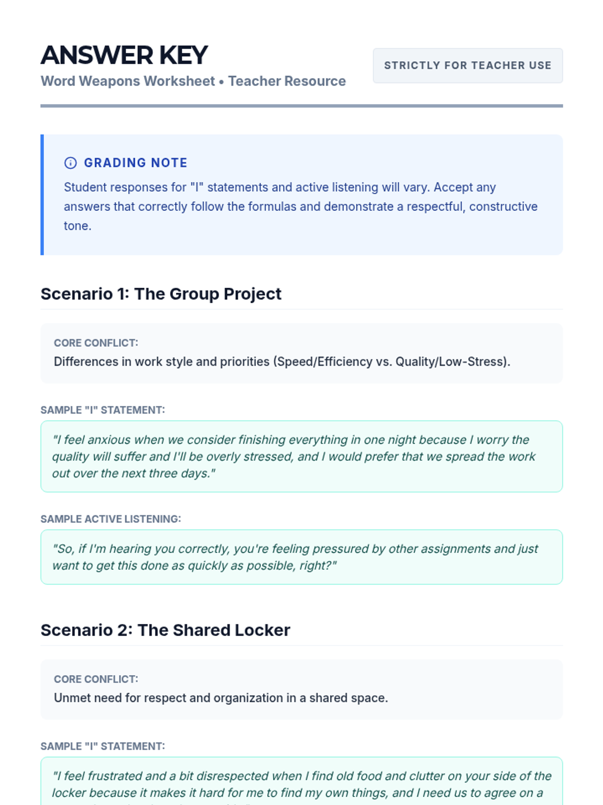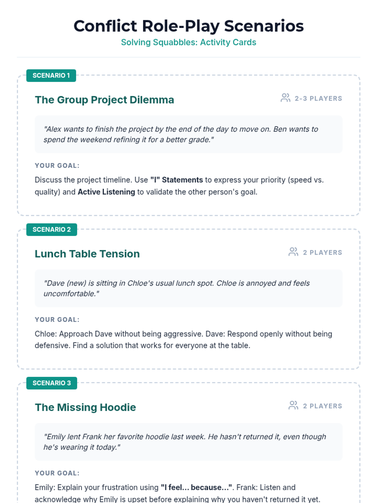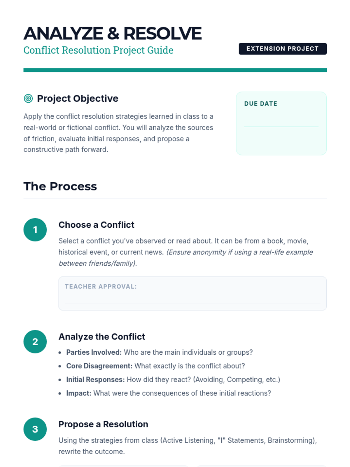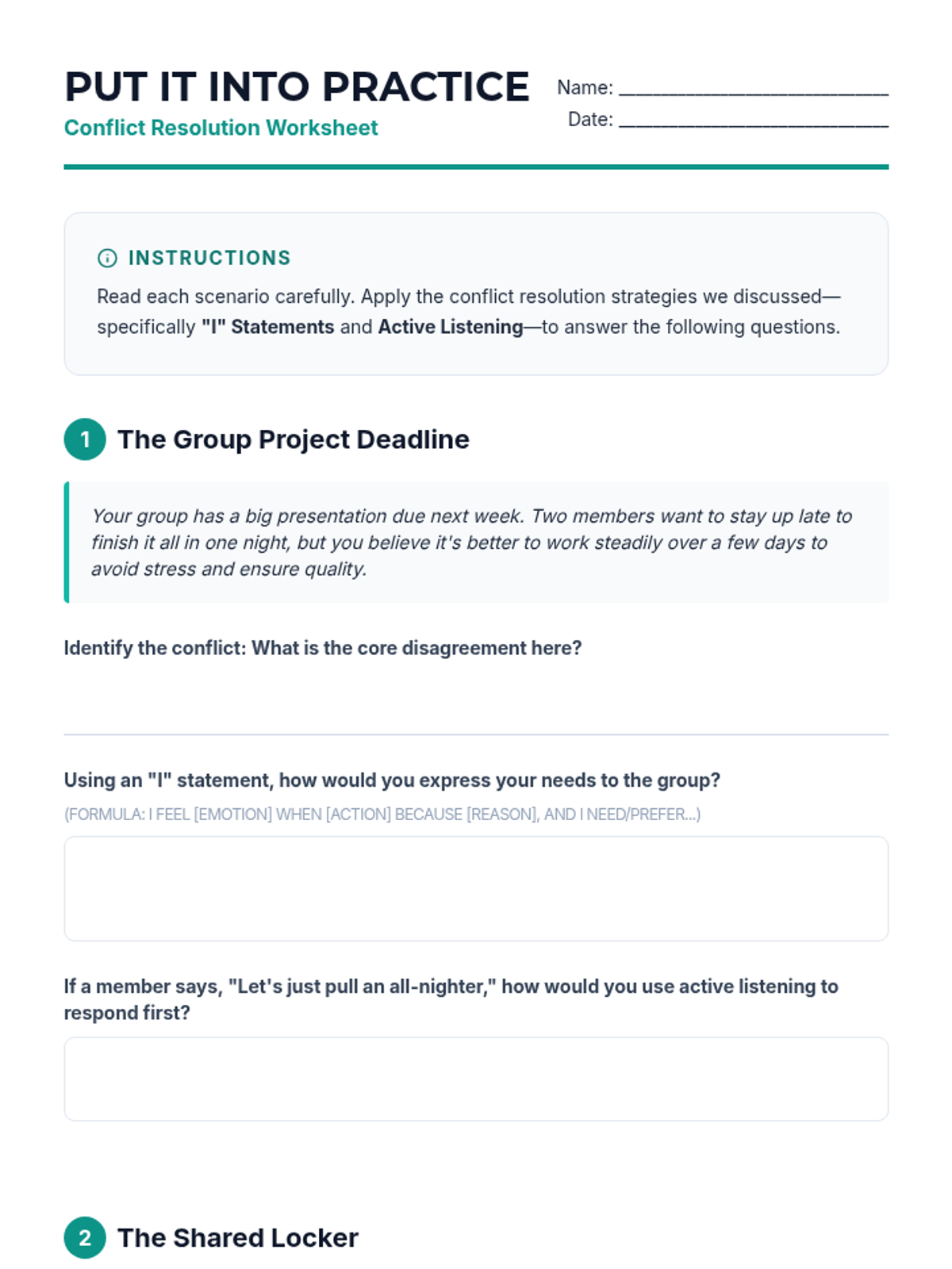 This lesson empowers high school students with practical strategies to navigate and resolve conflicts constructively, focusing on active listening, 'I' statements, and empathy. Students will practice these skills through role-play and individual reflection.