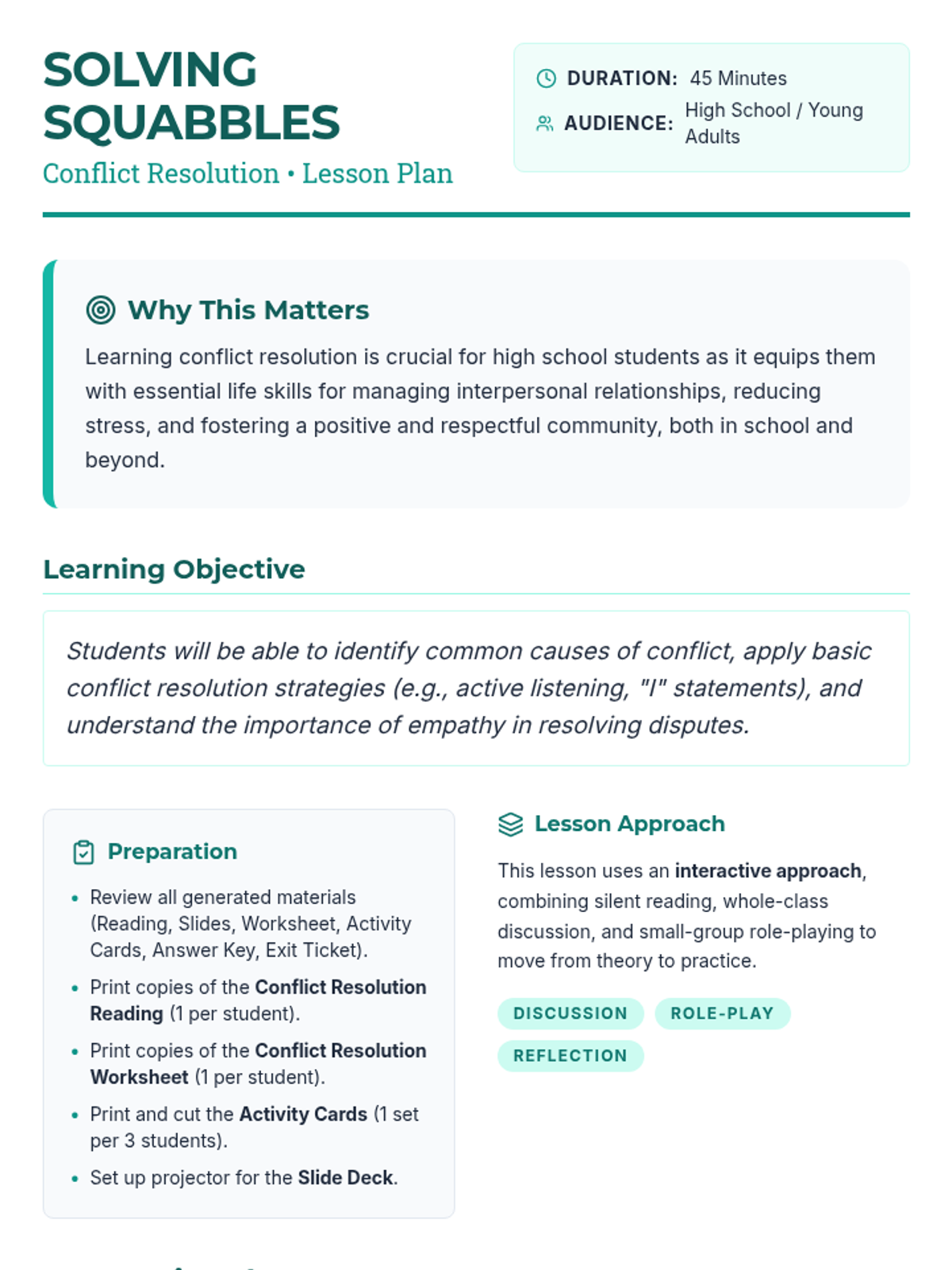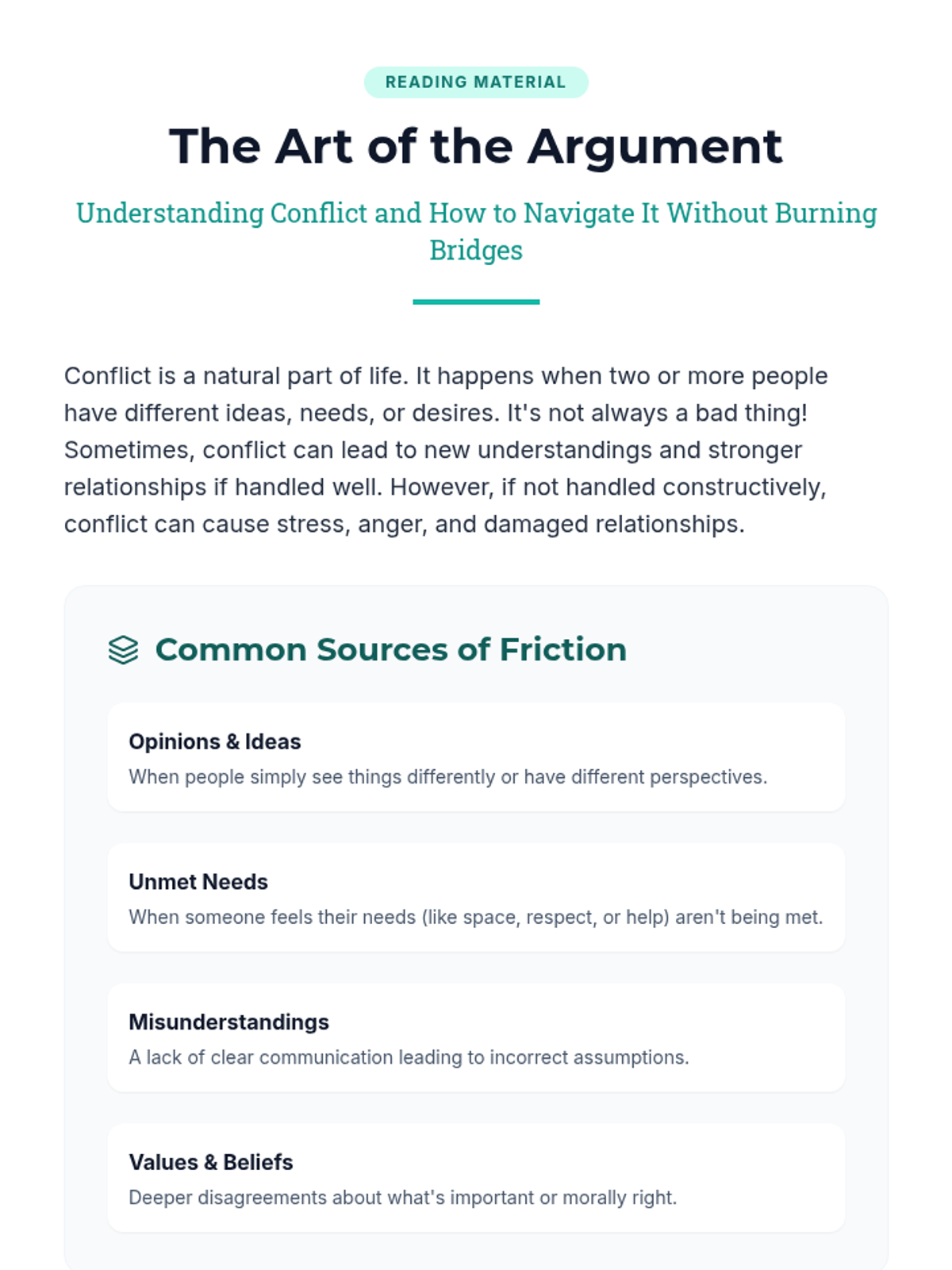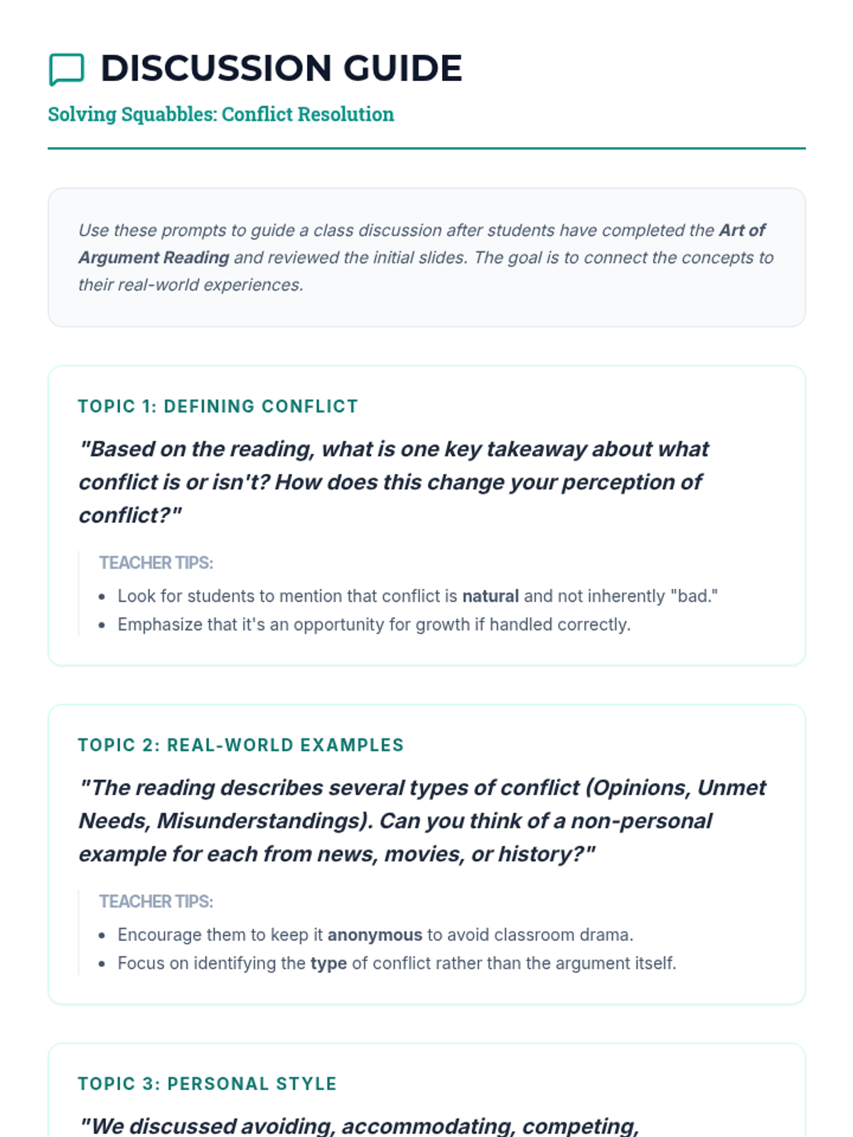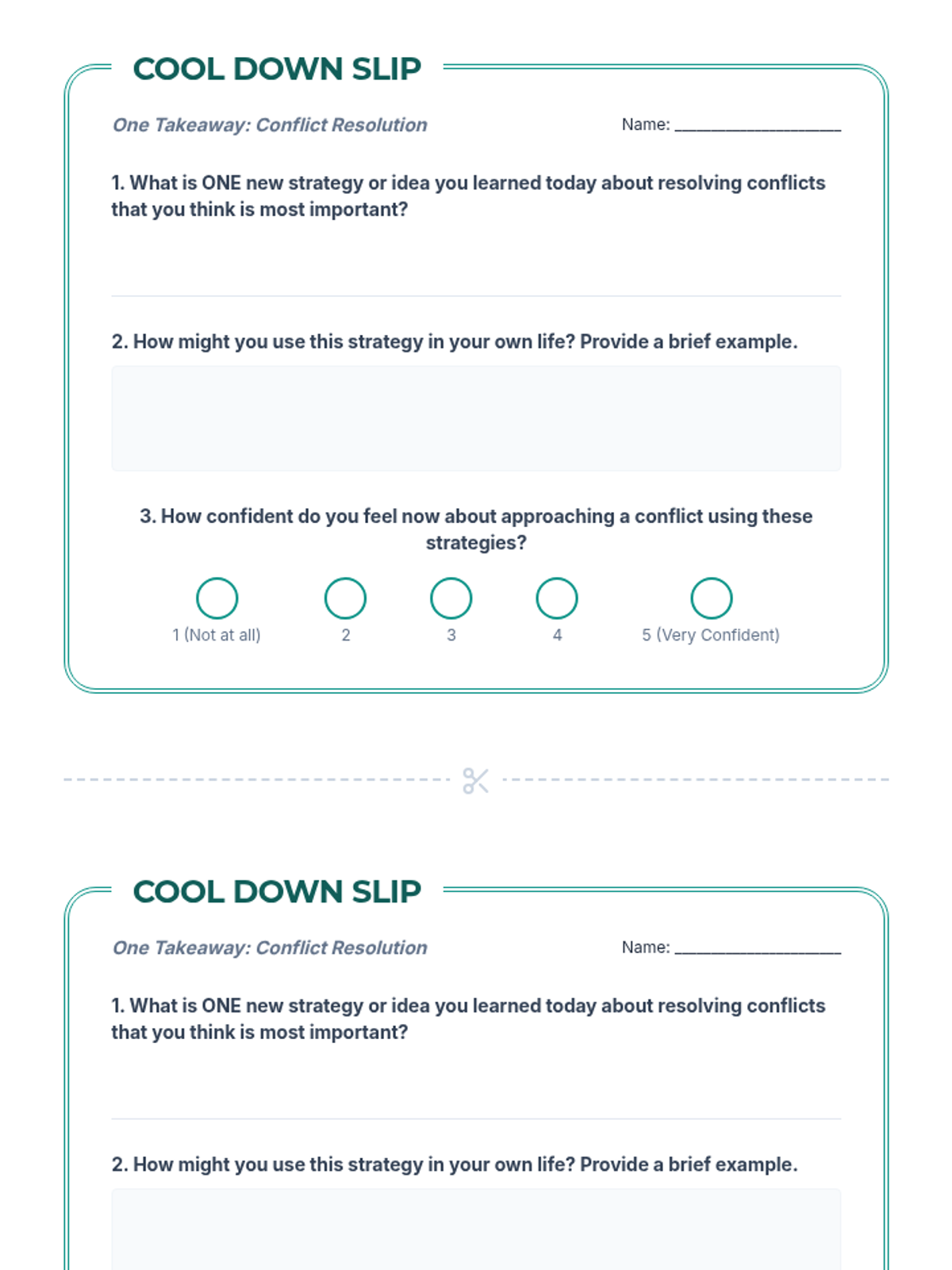 This lesson empowers high school students with practical strategies to navigate and resolve conflicts constructively, focusing on active listening, 'I' statements, and empathy. Students will practice these skills through role-play and individual reflection.