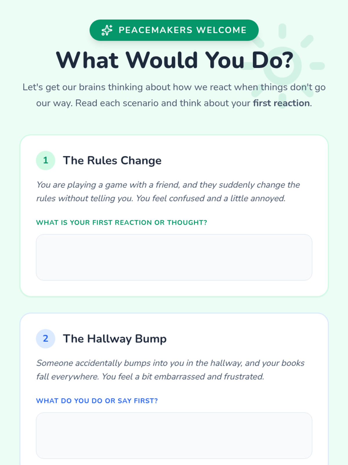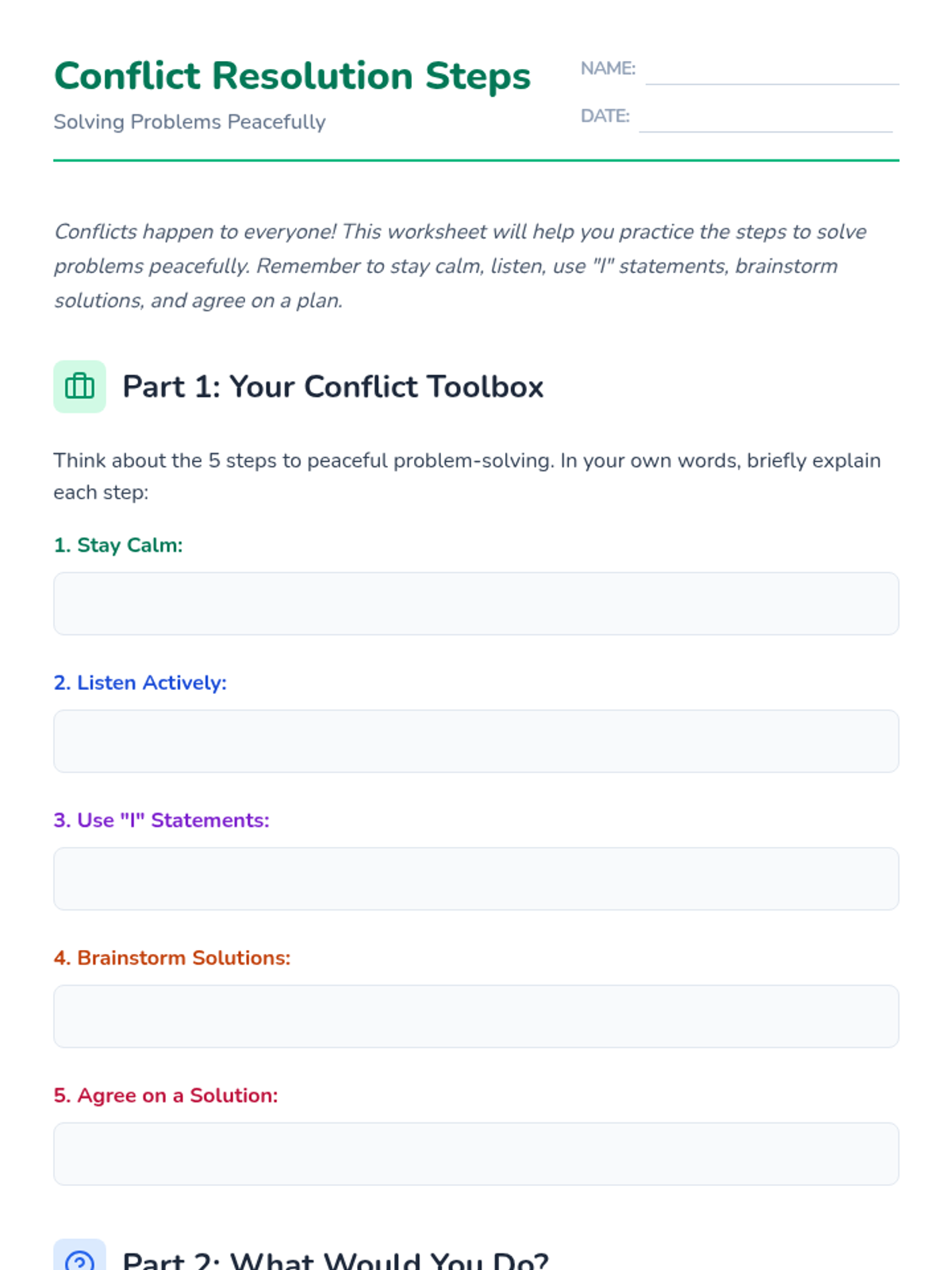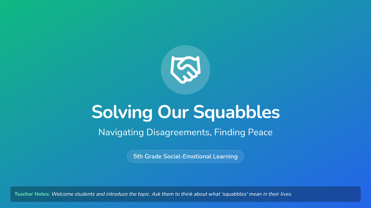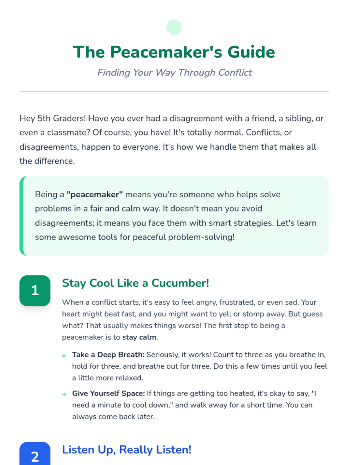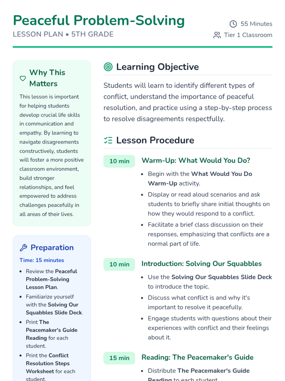 A 55-minute lesson for 5th graders on navigating disagreements using a 5-step peaceful resolution process. Includes a slide deck, reading guide, worksheet, and warm-up activity.