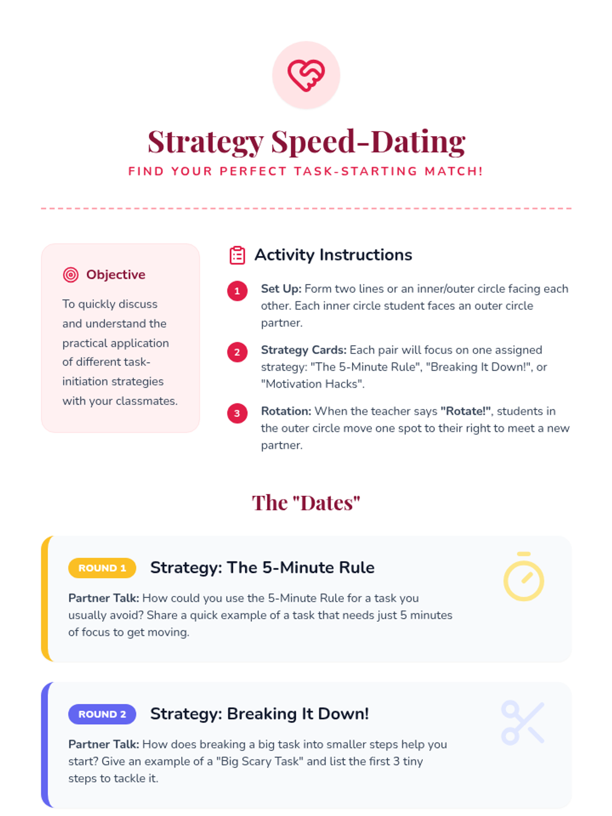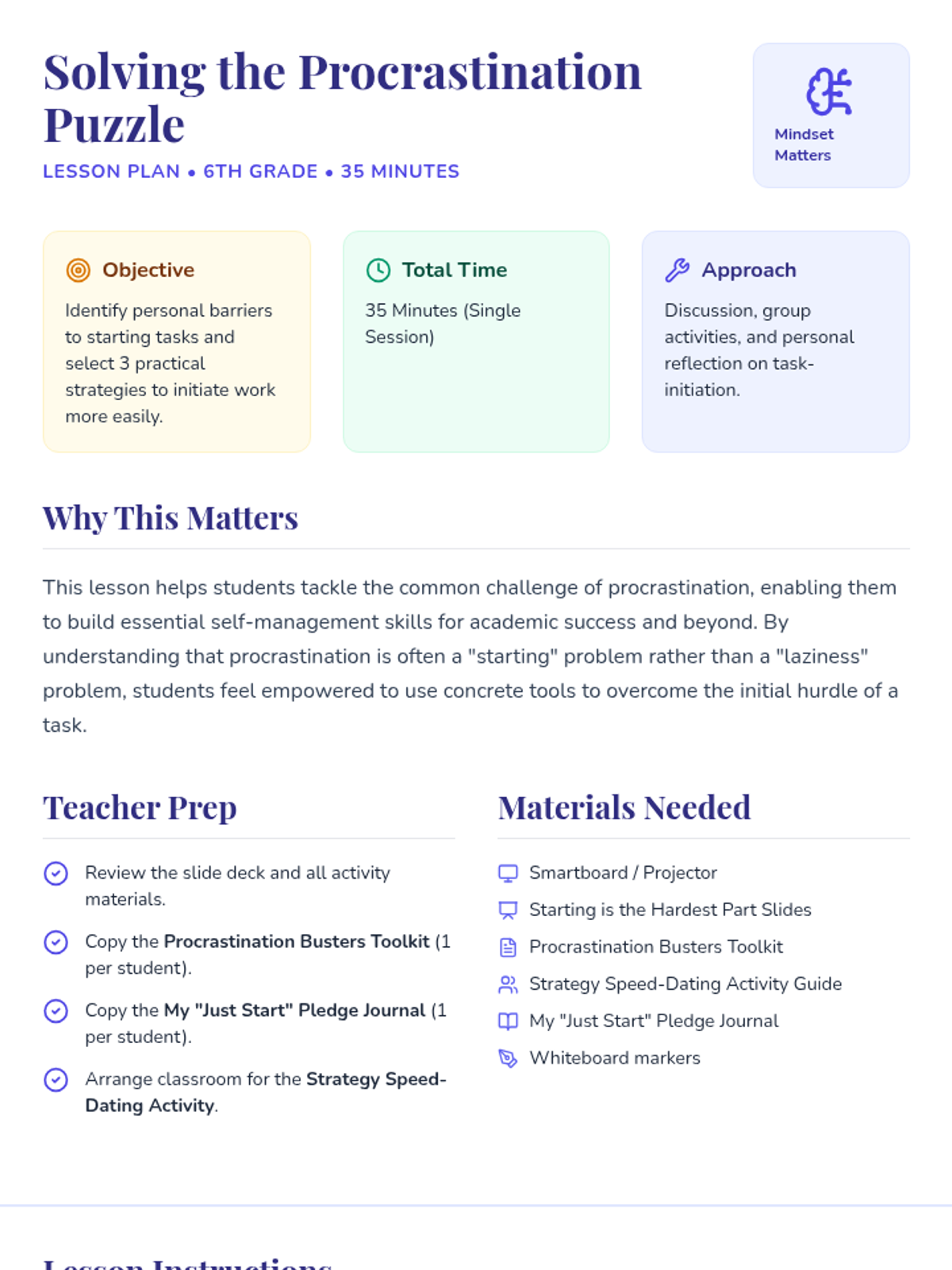A 35-minute lesson for 6th-grade students to identify their procrastination triggers and learn three practical strategies to initiate tasks more effectively.
