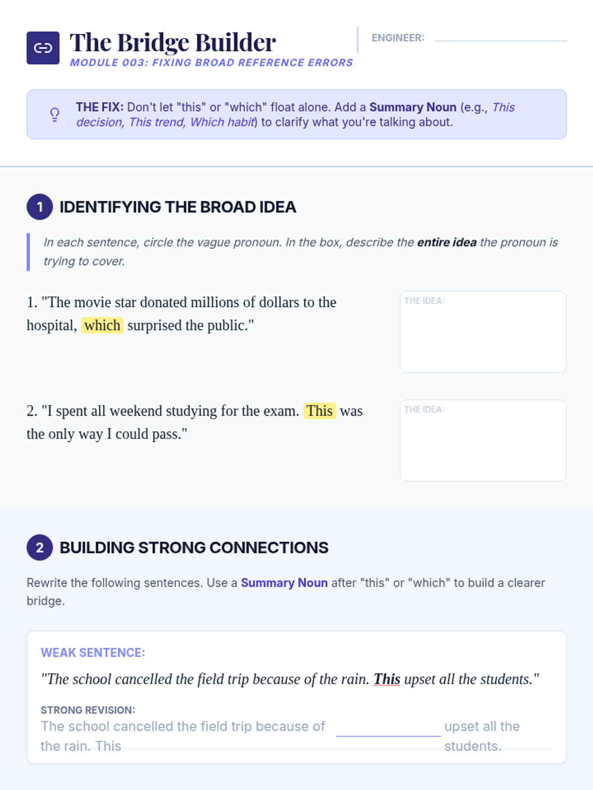 Teaches students to identify and fix broad reference errors where 'which' and 'this' refer to entire ideas rather than specific nouns.