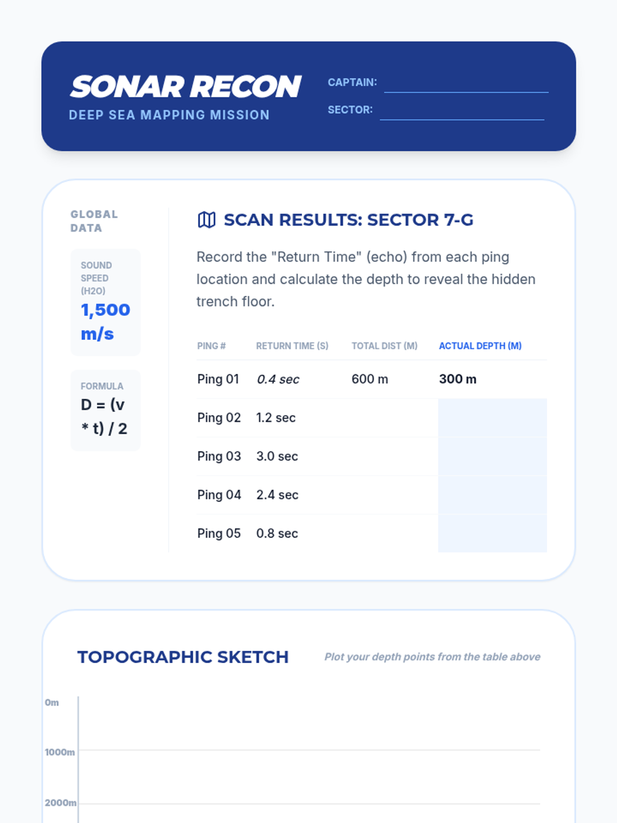Students simulate mapping the ocean floor using sound reflection data. They calculate distances based on time-of-flight for sound pulses.