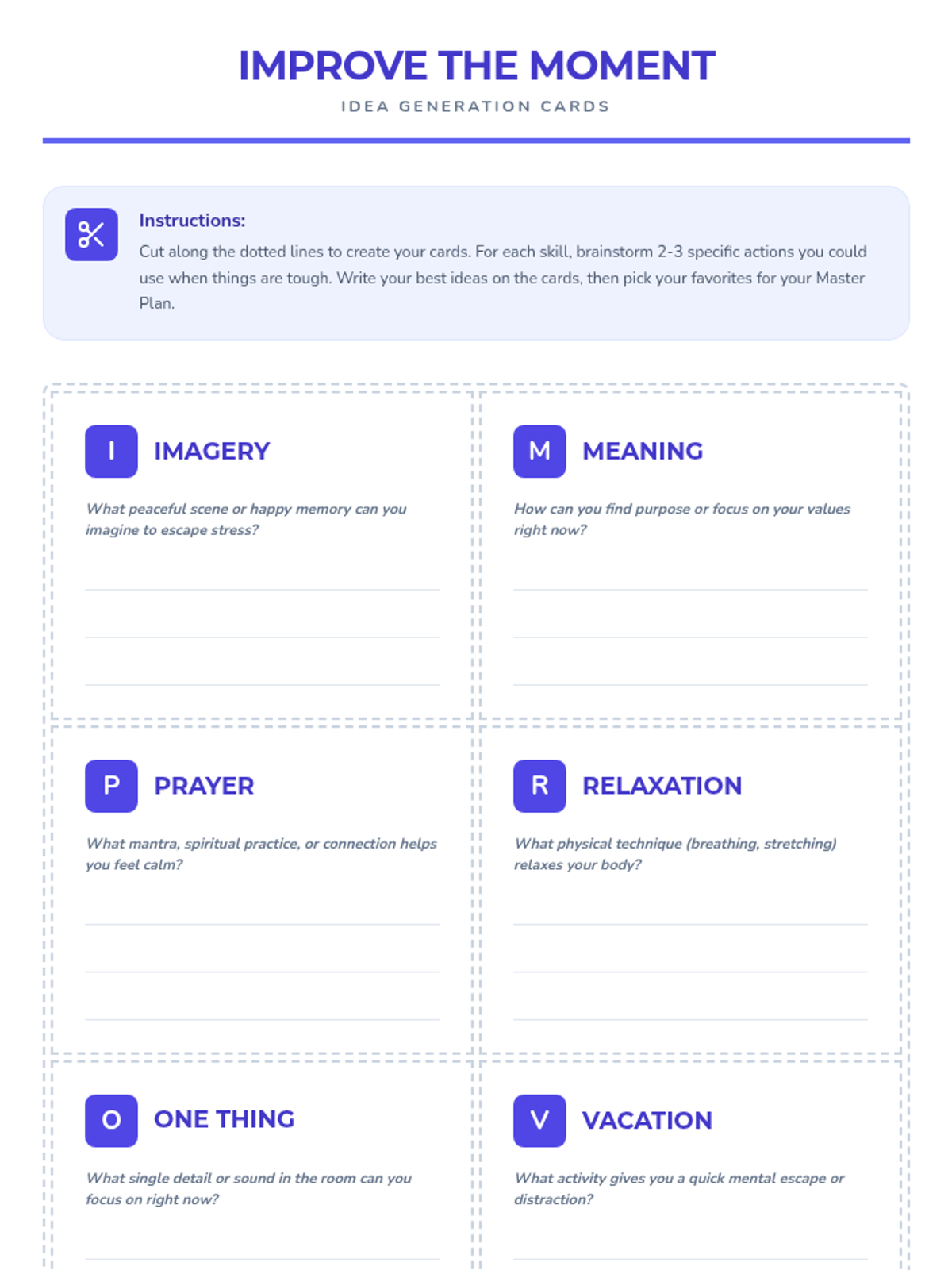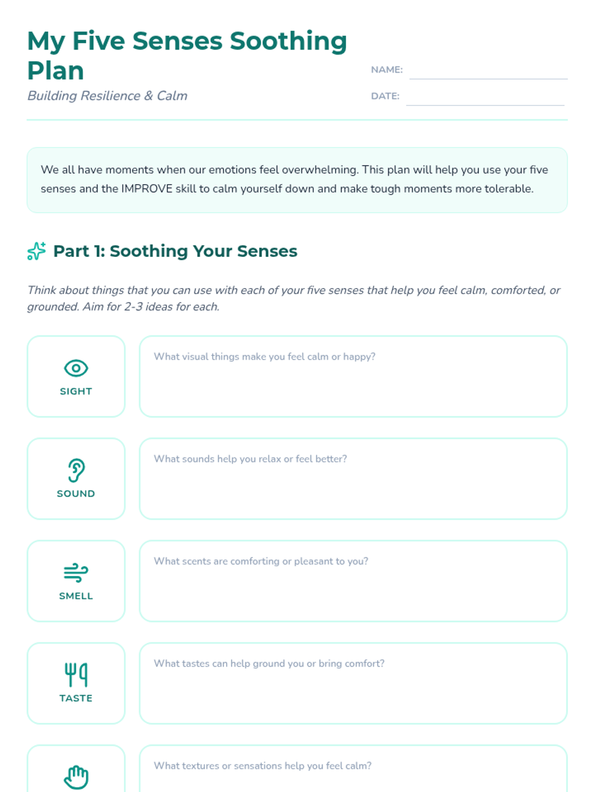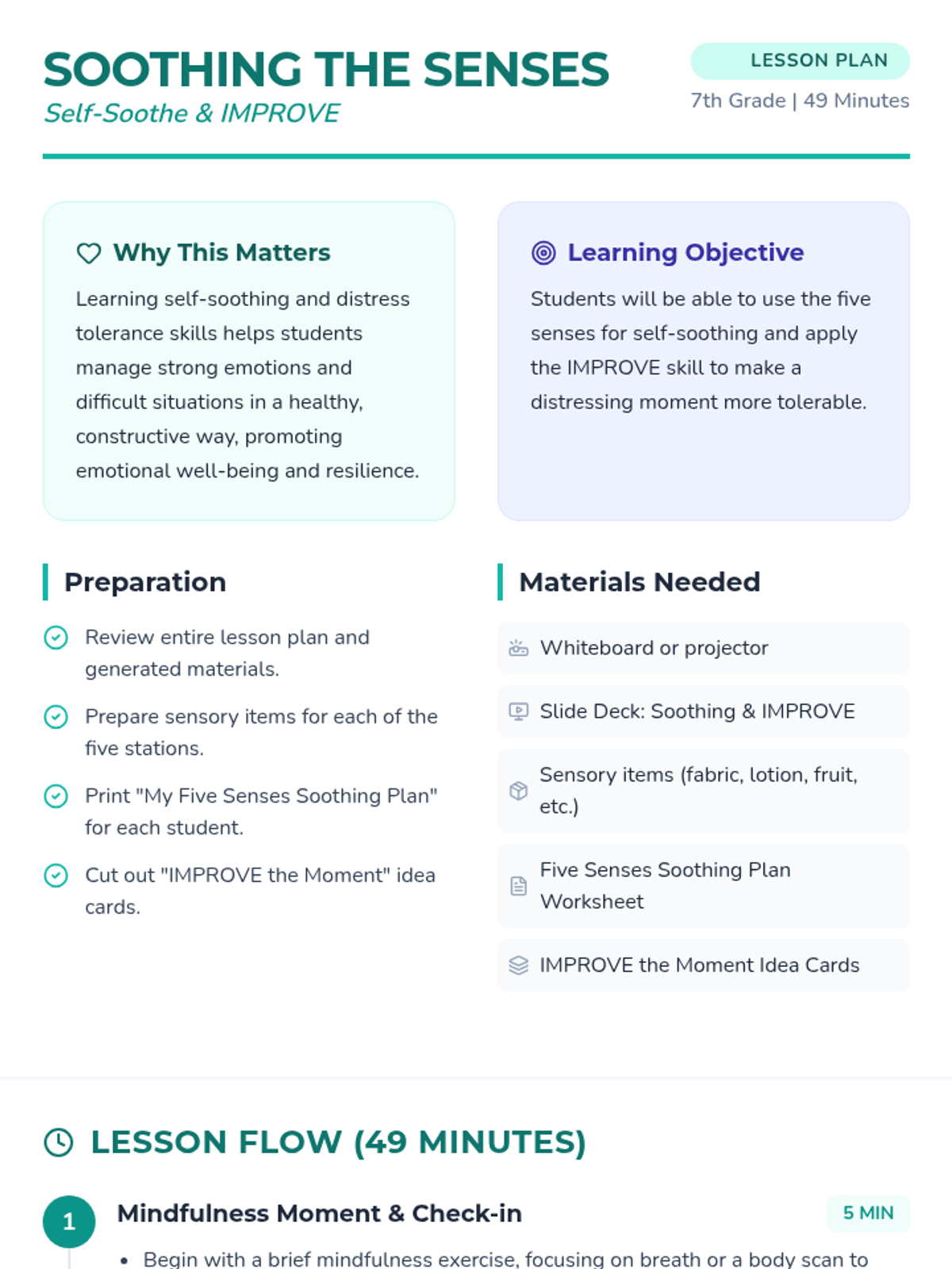 A 49-minute lesson for 7th graders on self-soothing using the five senses and the DBT 'IMPROVE' skill to manage distress and build emotional resilience.