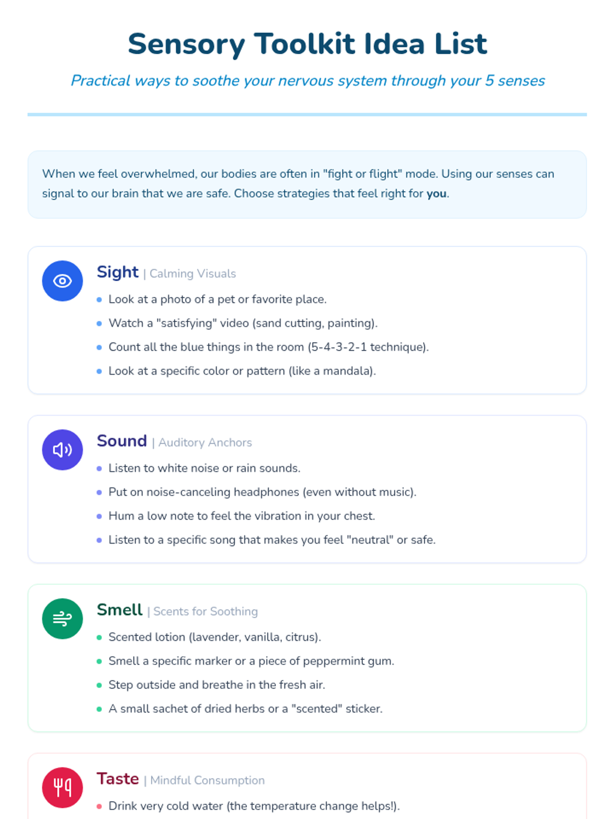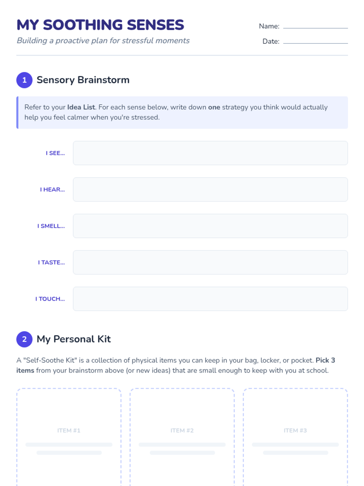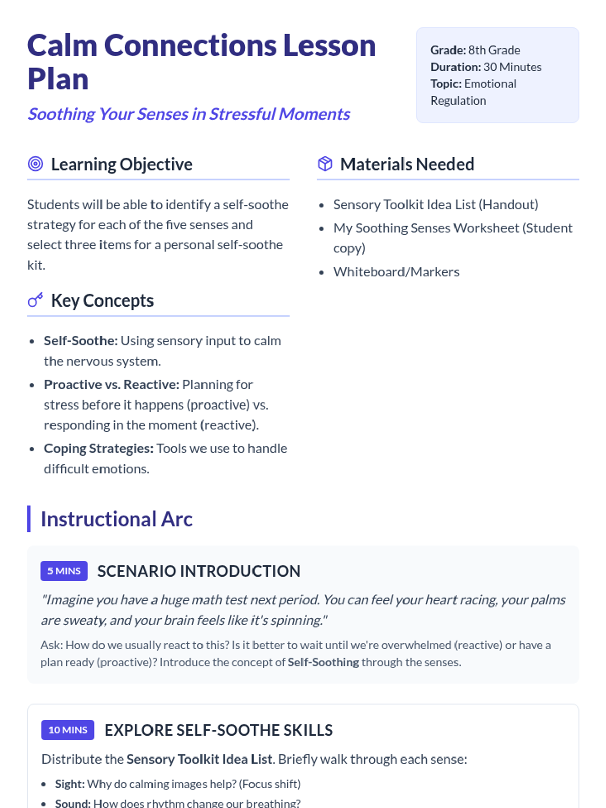 A 30-minute lesson designed for 8th graders to explore sensory-based coping strategies. Students will identify self-soothing techniques for each of the five senses and plan a personal self-soothe kit for managing stressful moments.
