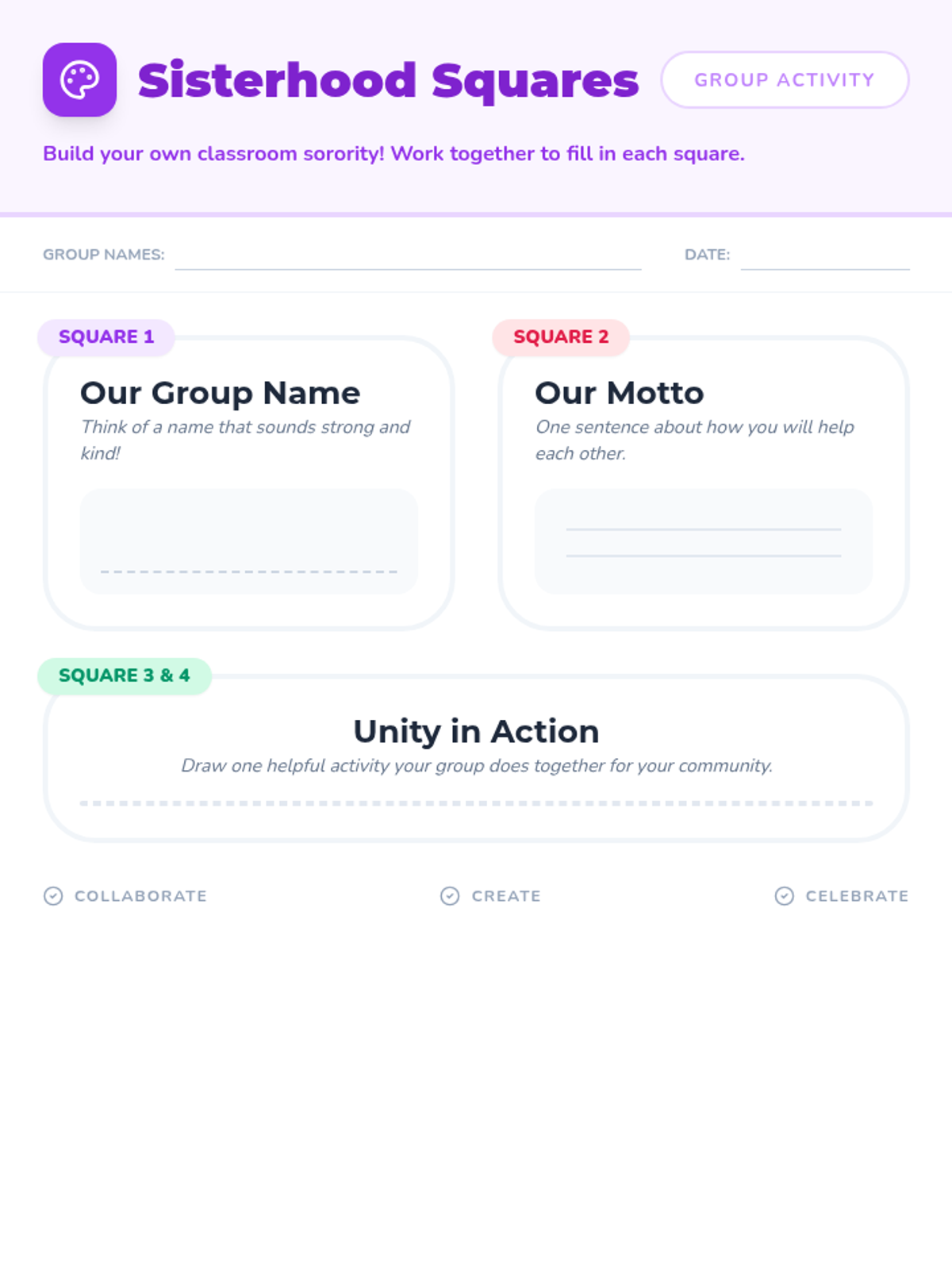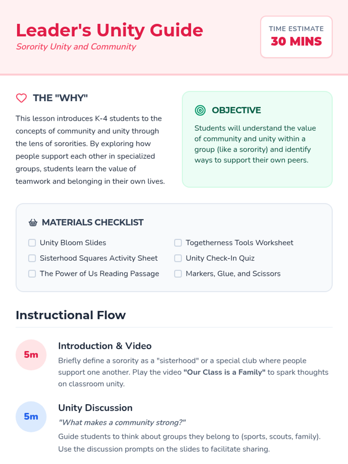 This lesson introduces K-4 students to the concepts of community and unity through the lens of sororities, emphasizing teamwork and support. Students engage in discussions, a group activity to build their own 'sorority', and reflective writing to understand how they can contribute to their own communities.