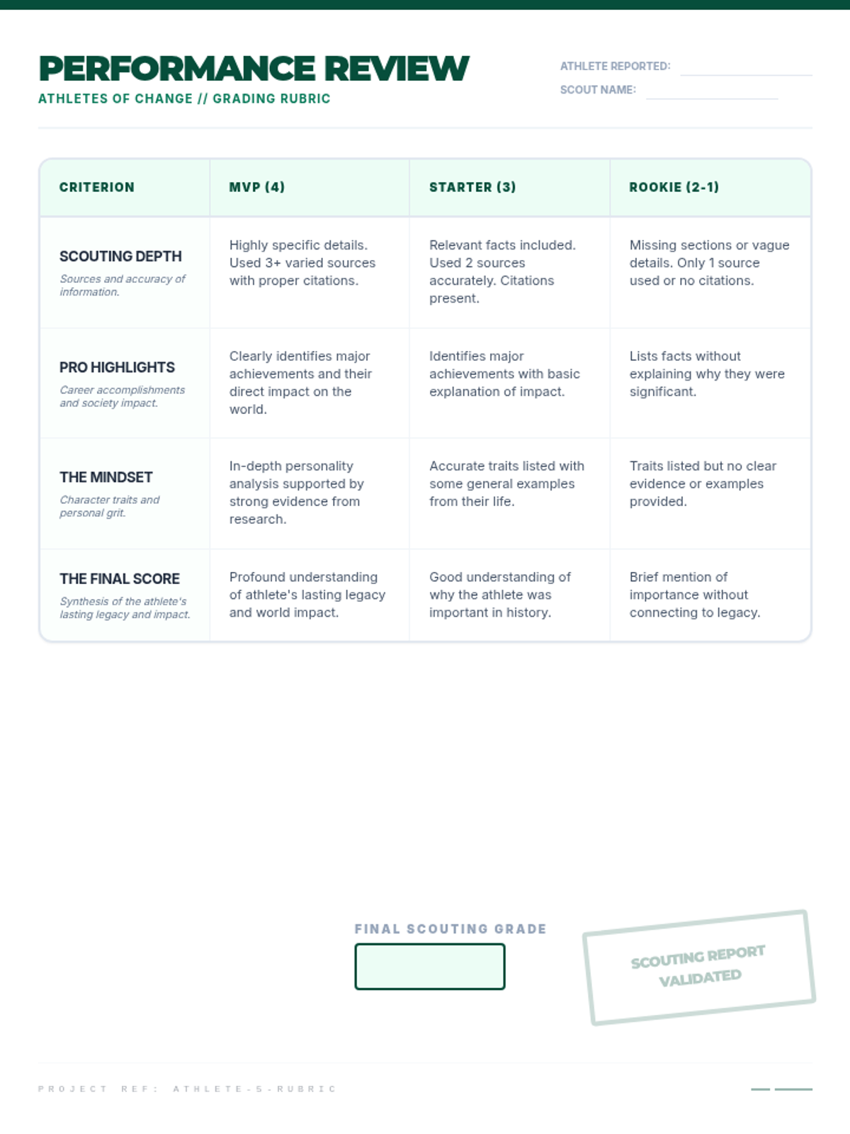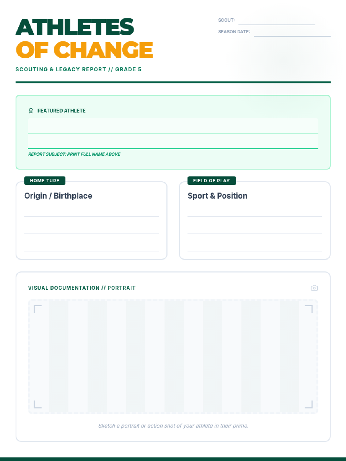 A biography research project focused on influential athletes who changed the world. Students use a sports-themed packet to document their subject's career milestones, social impact, and personal mindset.