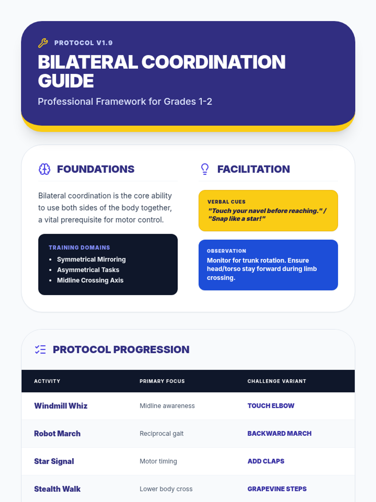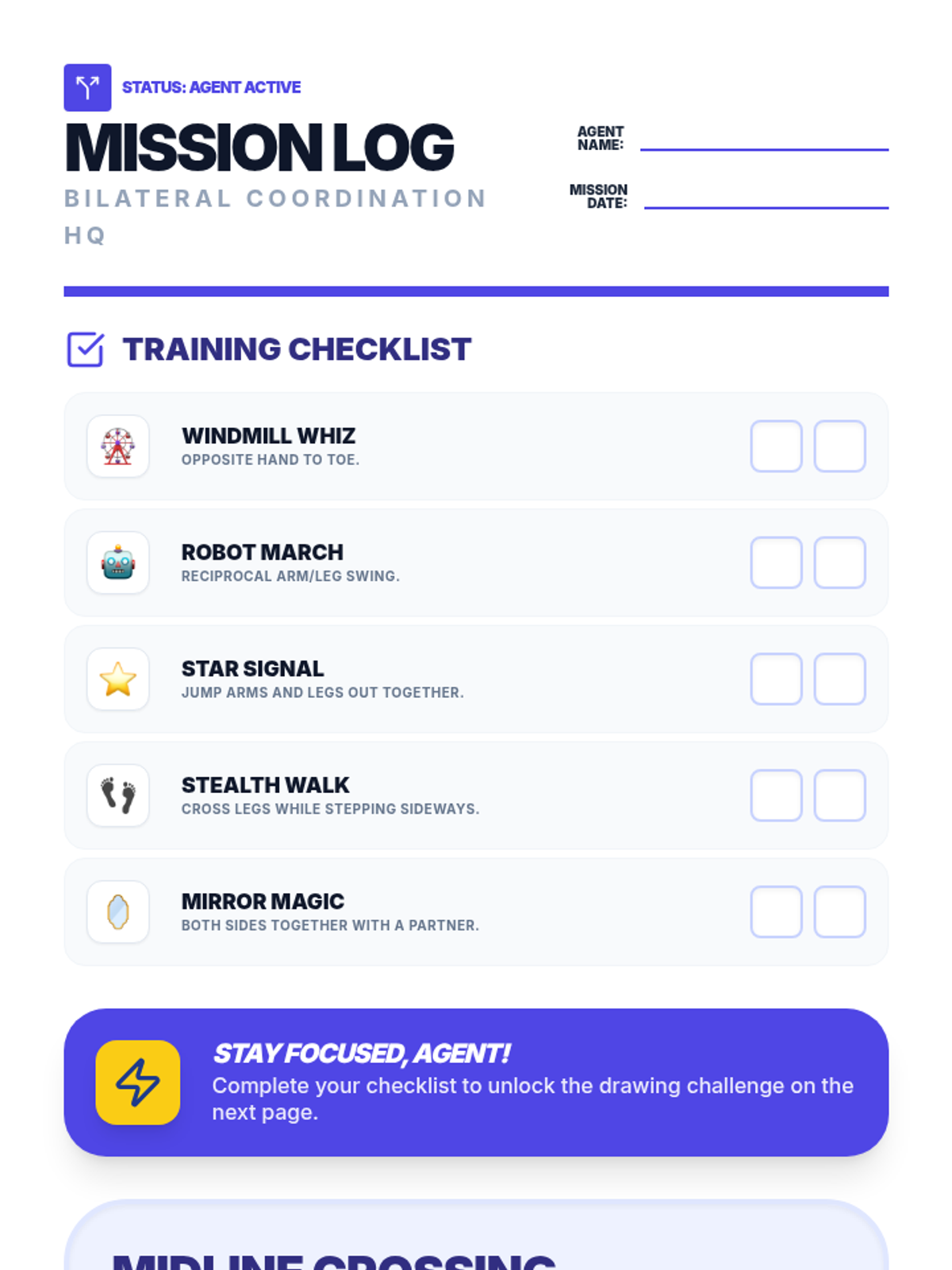 An occupational therapy-focused lesson for 1st and 2nd graders to develop bilateral coordination, midline crossing, and body awareness through a secret agent mission.