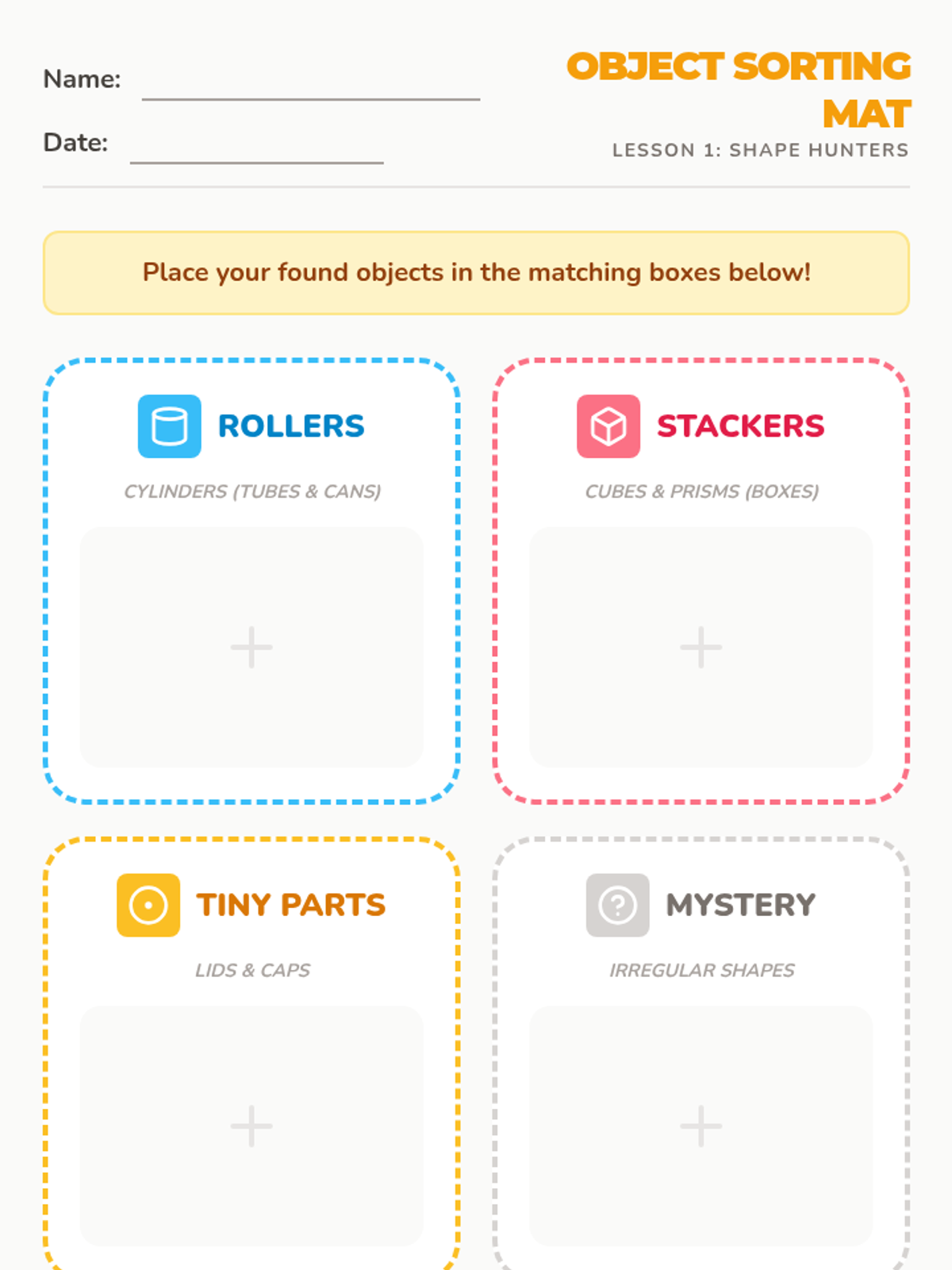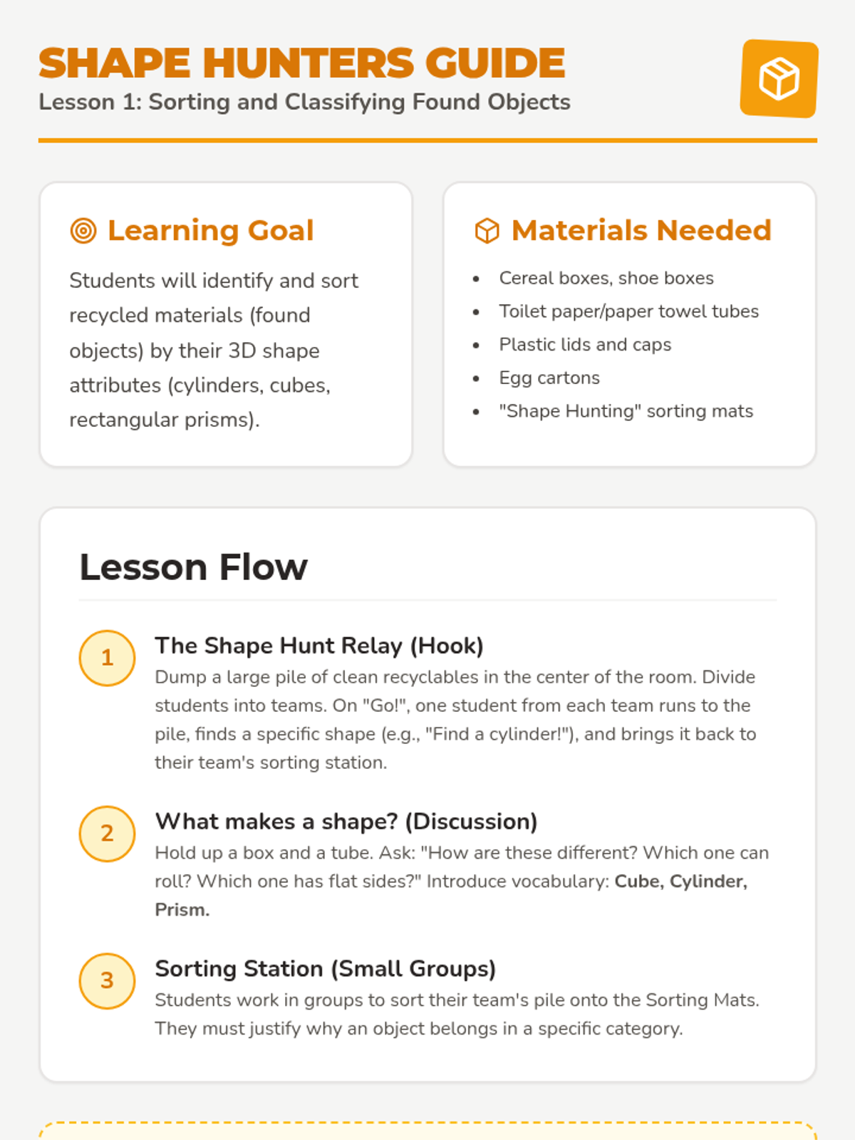 Students engage with a variety of recycled and found materials (boxes, tubes, lids), sorting them by geometric attributes to identify structural potential.