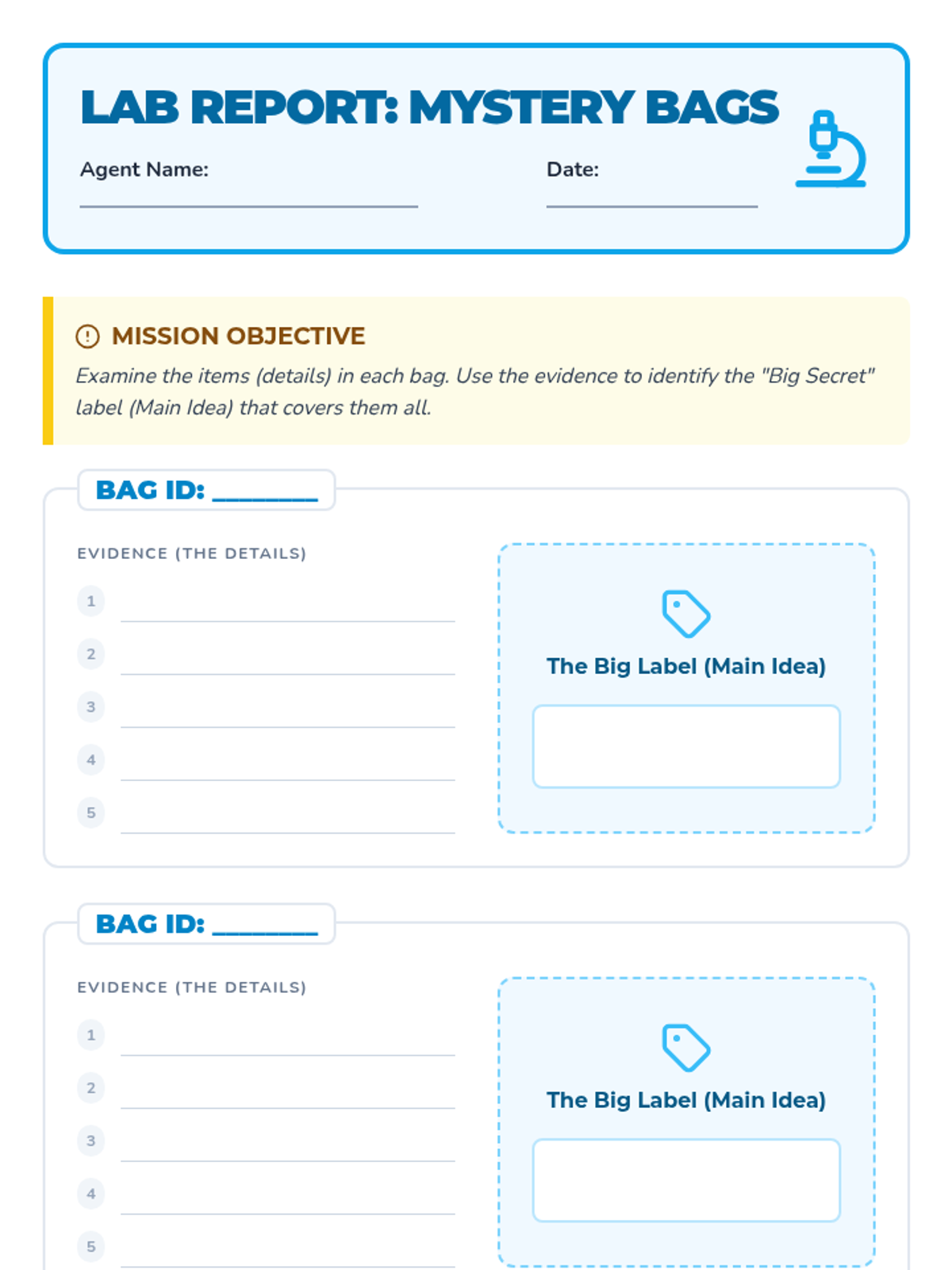 Students participate in a sorting game where they group diverse objects or picture cards into categories and generate a label (the 'main idea') for each group.