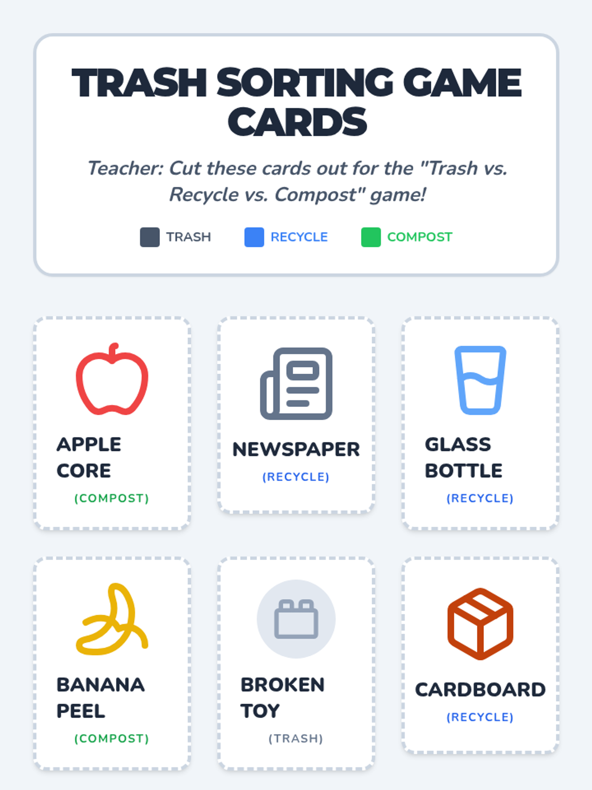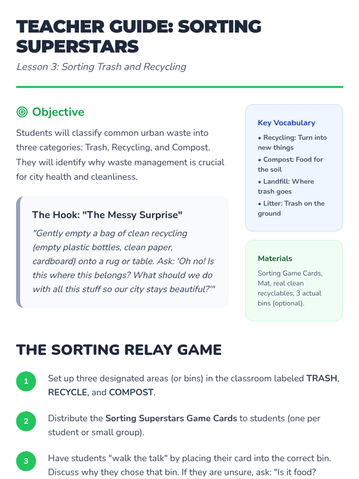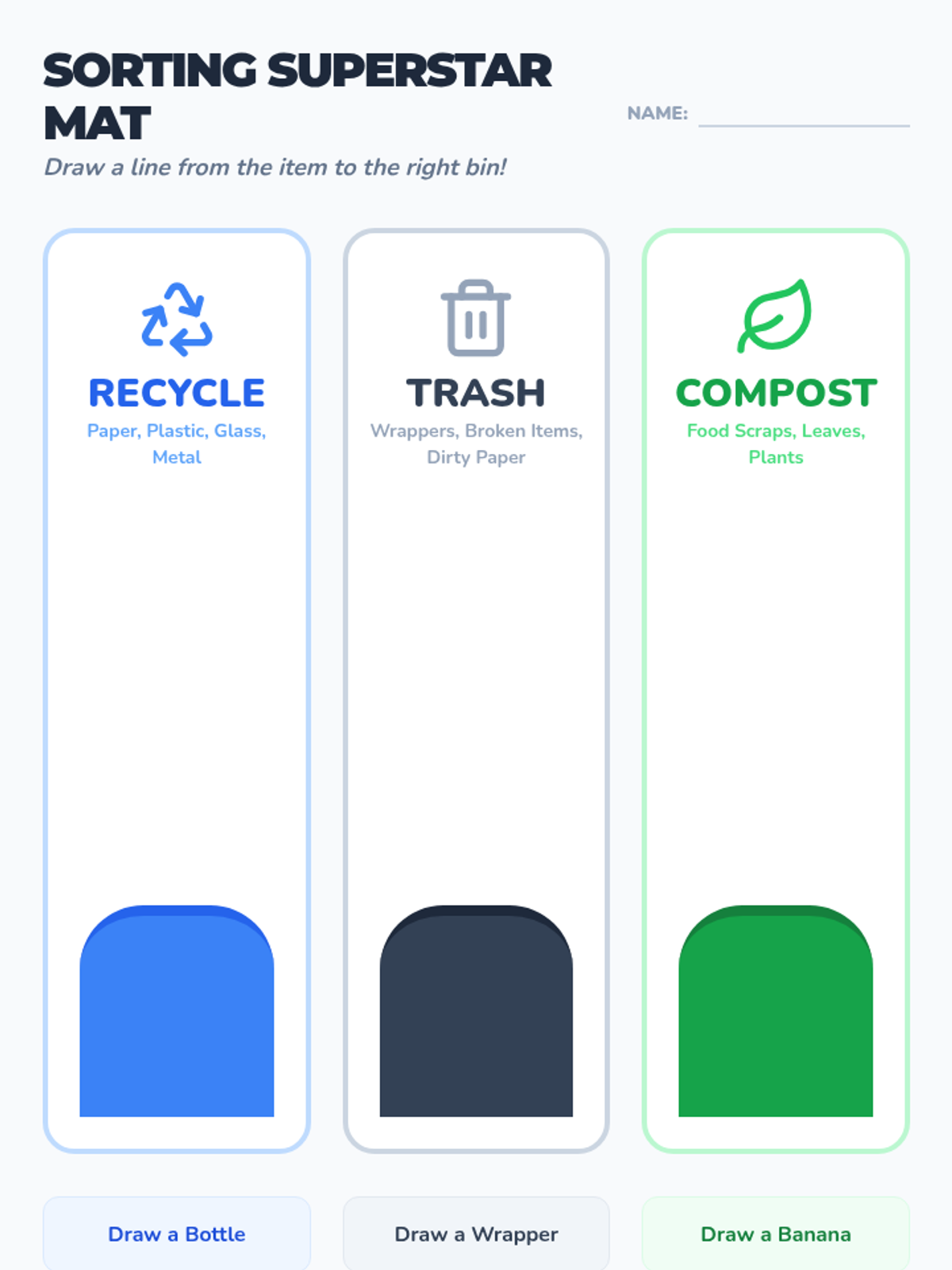 Students learn the difference between trash, recycling, and compost through hands-on sorting and discuss the importance of keeping city streets clean.