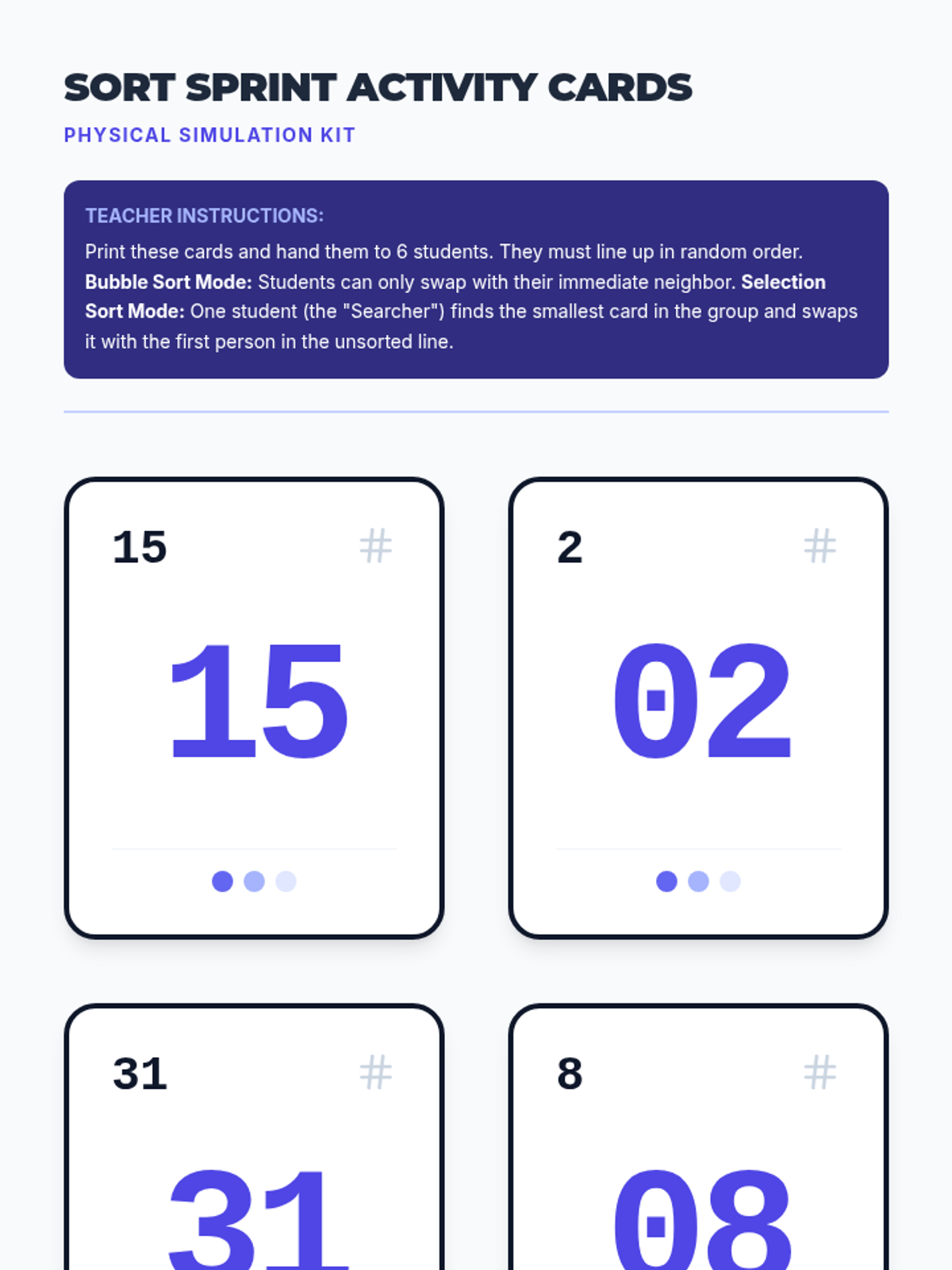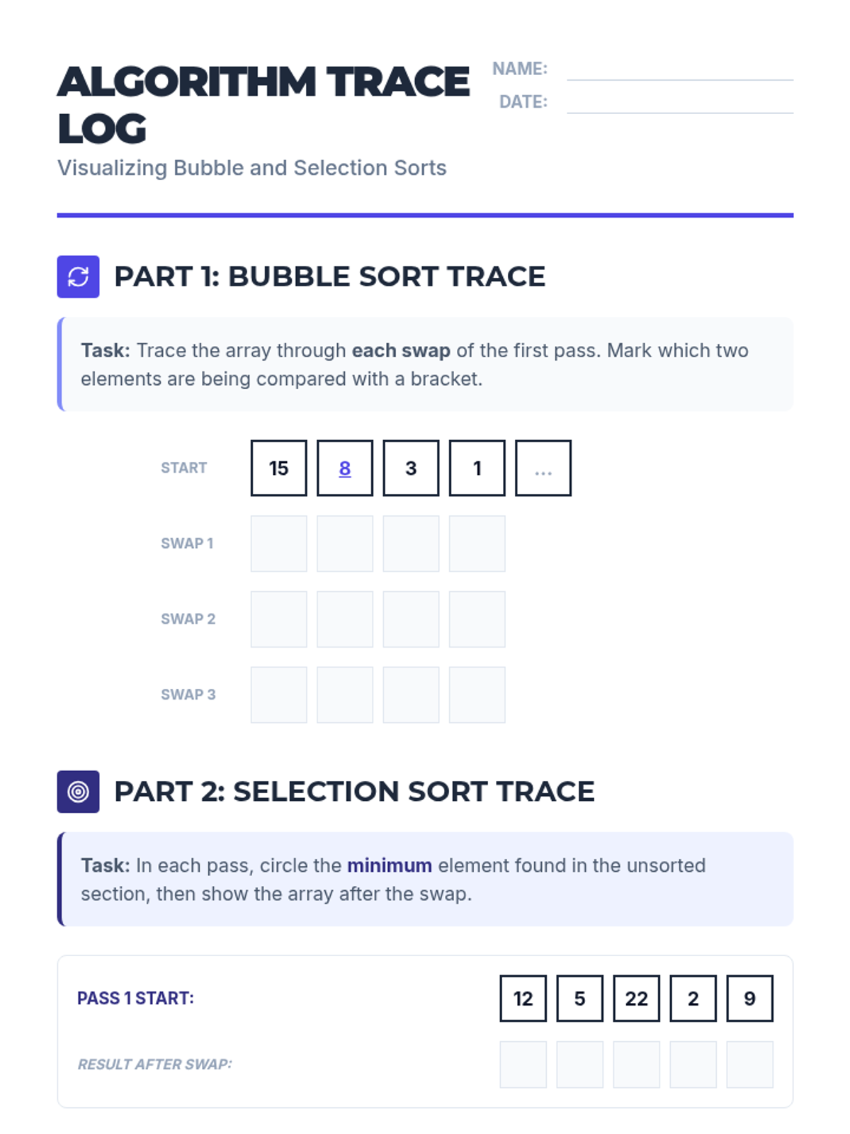 This lesson focuses on the mechanics of Bubble and Selection sorts. Students trace array manipulations step-by-step to understand how elements move or are swapped into their correct positions.